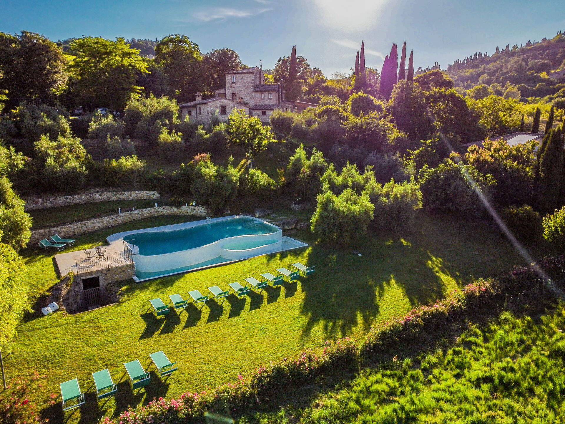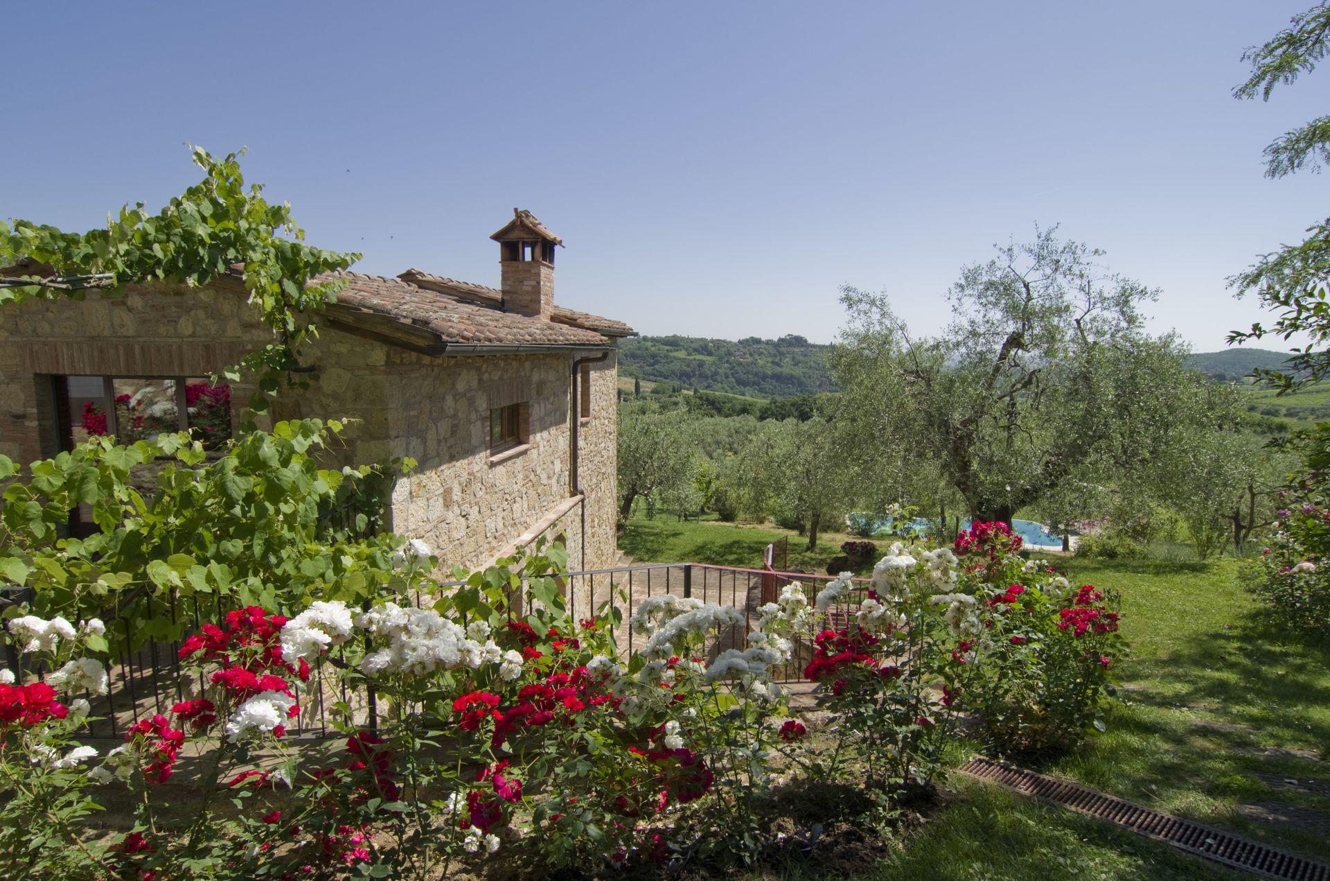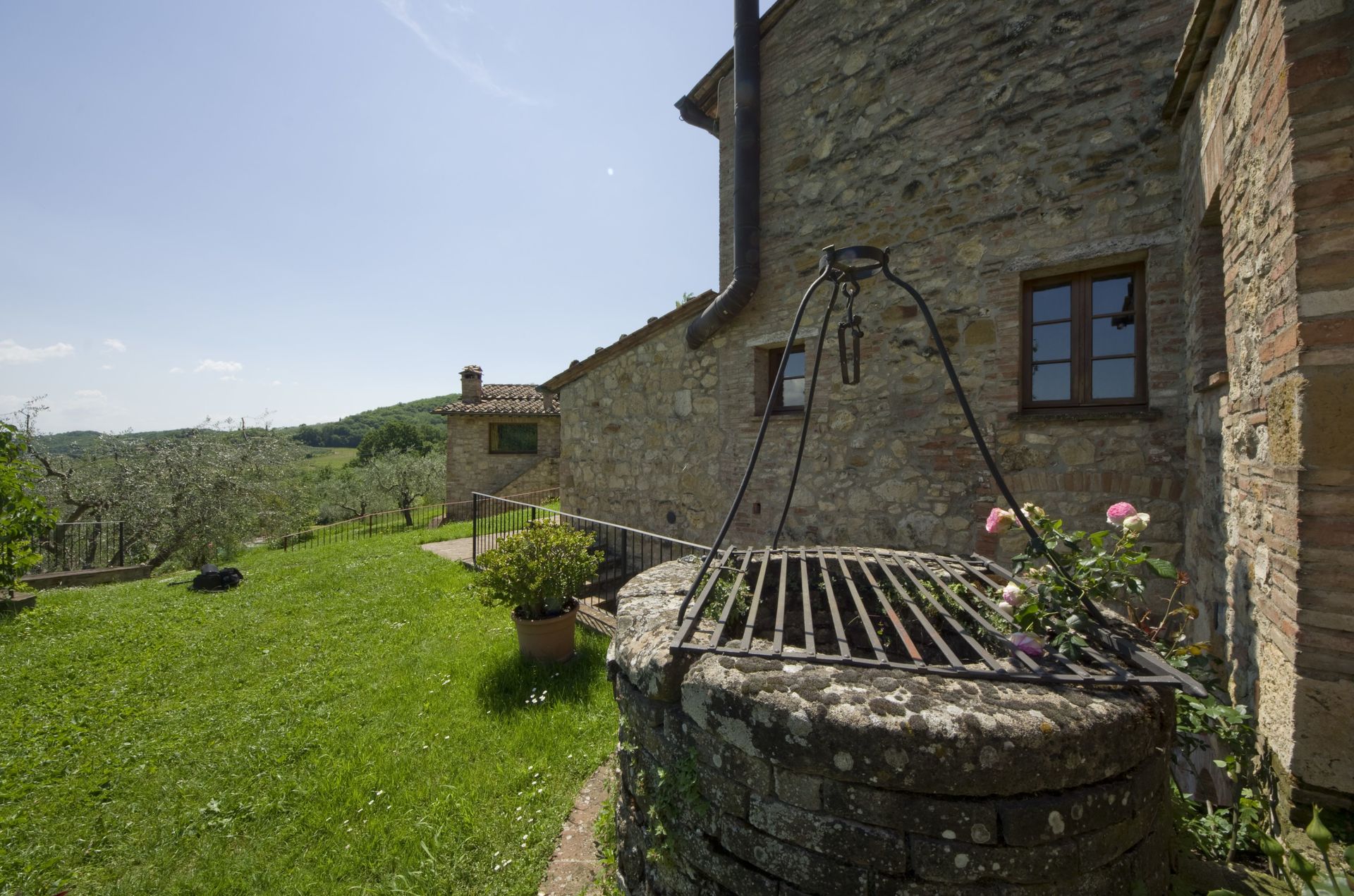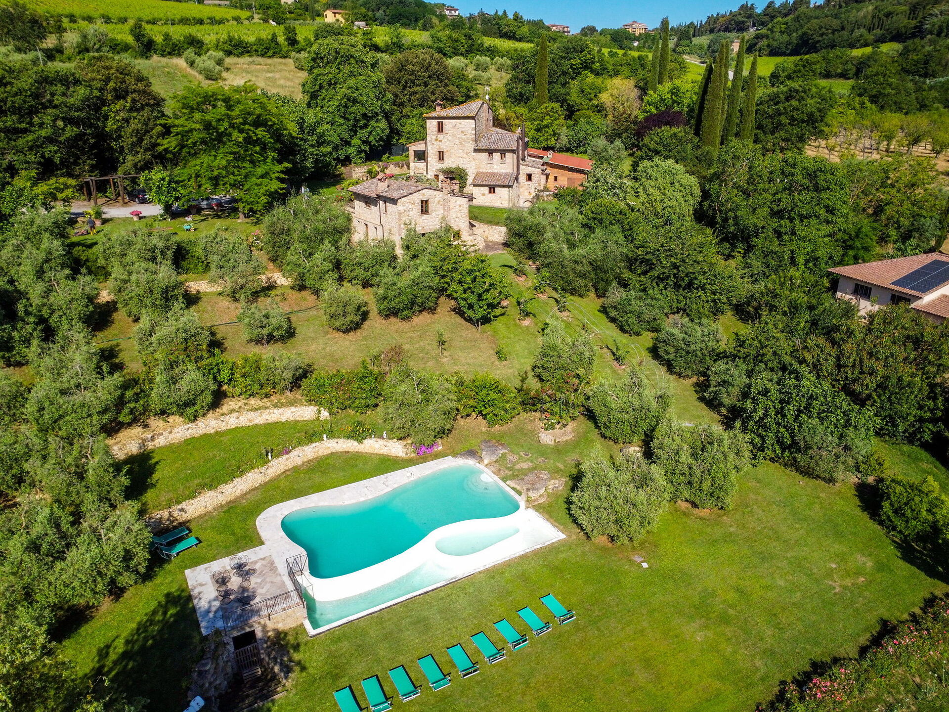 Ved ankomst vil I møde en flot ren velholdt ejendom med udsigt over bakkerne perfekt til rolig ferie i Toscana. Efter en hektisk dag med shopping, er det dejligt at nyde lidt tid med venner og familie ved kanten af poolen med et glas vin - det er en perfekt måde at slappe af på sidst på dagen. Udenfor vil I finde gårdhave og grill. Hvis I nyder at lave mad til familie og venner så er der et veludstyret køkken inkluderet kaffemaskine, mikroovn, brødrister, komfur og køleskab, samt, , samt masser af service og bestik til op til 14 personer.