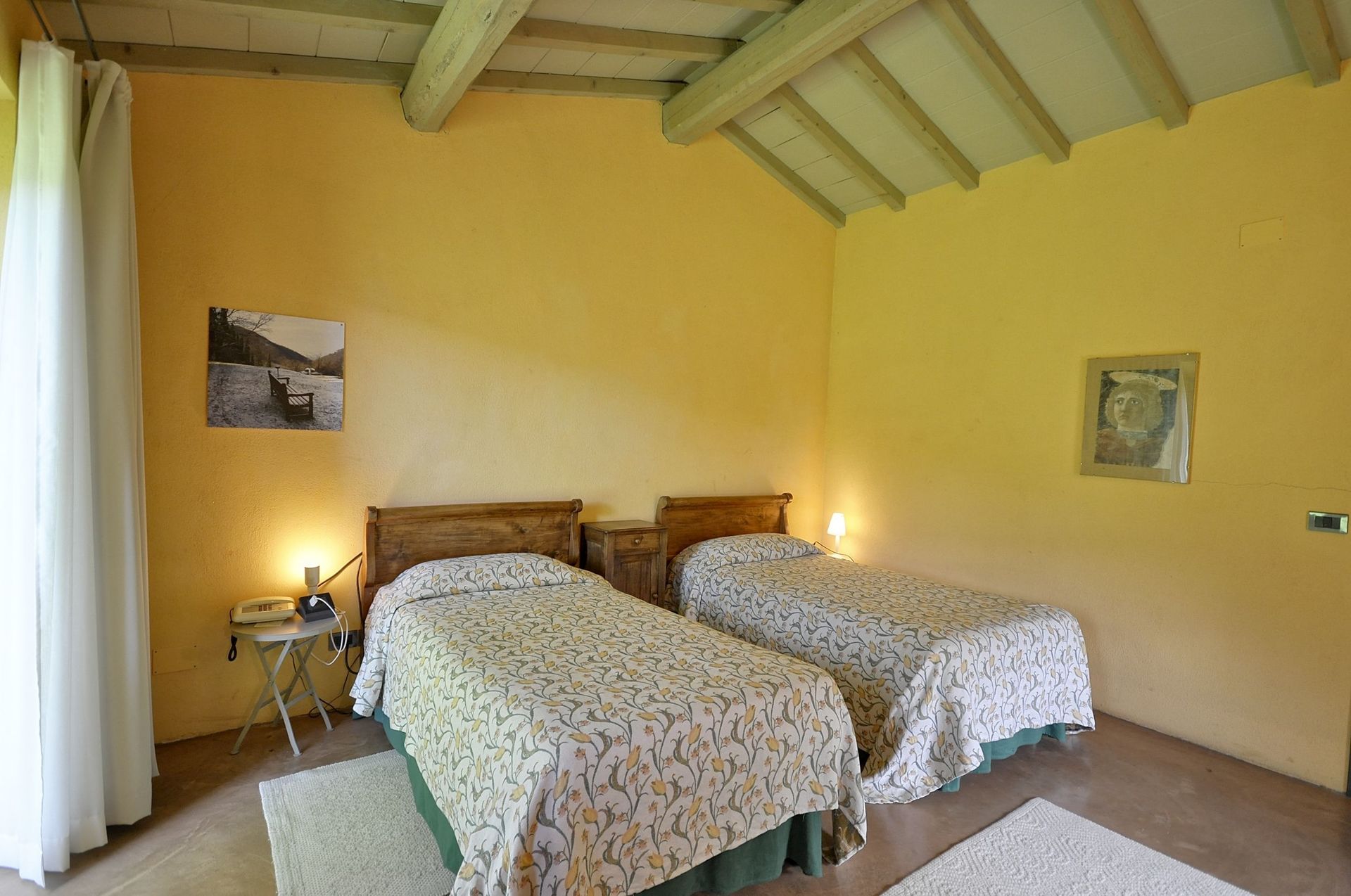 Første sal: Gulvet har adgang fra en vindeltrappe fra køkkenet, der fører op til en lille stue med sofa. På den ene side af stuen er der en korridor, der fører til to soveværelser hver med to enkeltsenge (som kan sluttes på forespørgsel), hver soveværelset har eget badeværelse med bruser. På den anden side er de to sidste soveværelser, et med to enkeltsenge, det andet med to franske senge, begge værelser har eget badeværelse med bruser.