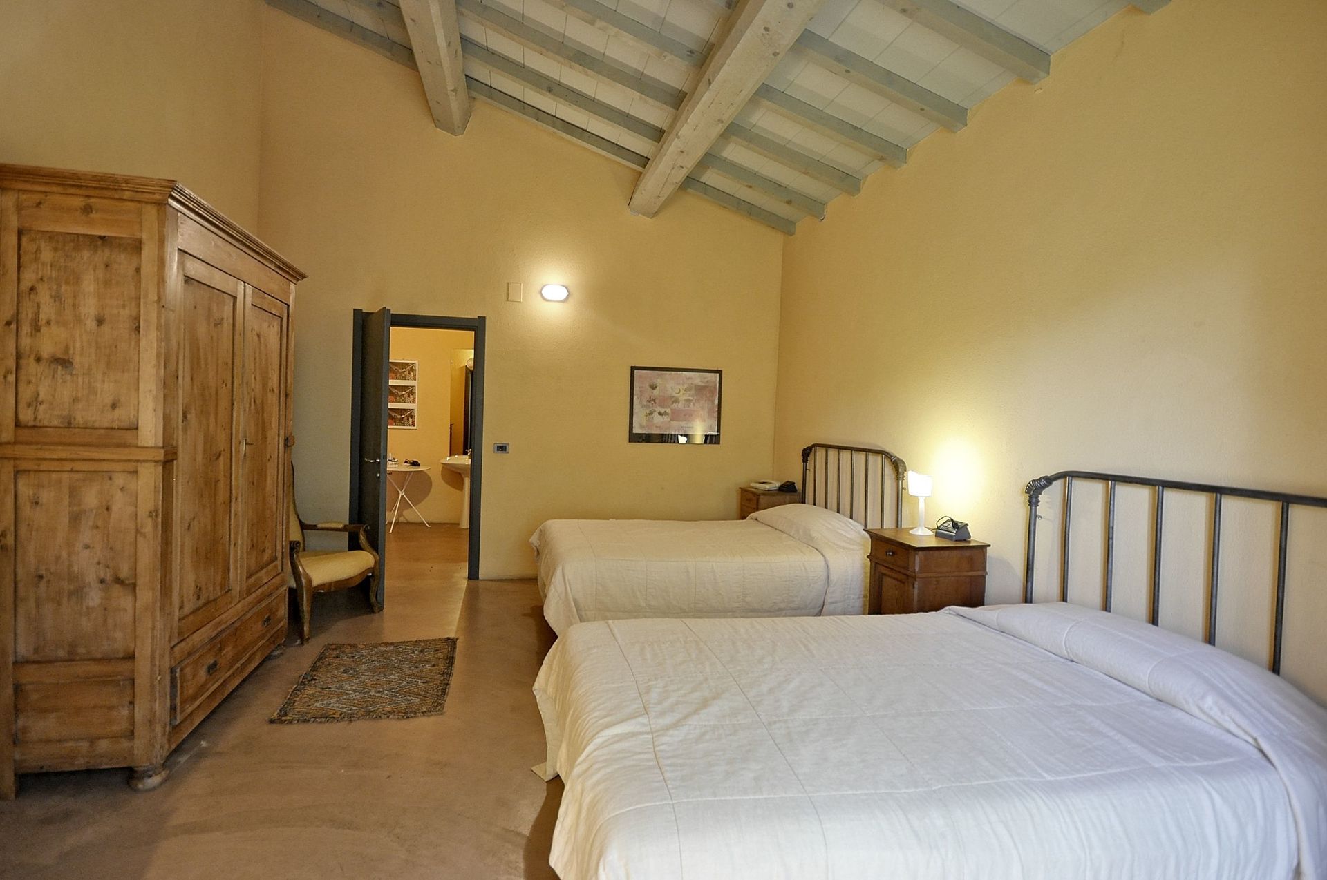 Stueetage: Indgang til en stor stue og spisestue med sofaer, lænestole og stort spisebord. Fra stuen er der direkte adgang til fuldt udstyret køkken med komfur (4 brændere), brødrister, elektrisk ovn, køleskab og fryser. På første sal er de første 3 soveværelser (alle er uafhængige og har adgang udefra), to af disse værelser har to enkeltsenge (kan deles på forespørgsel) og den tredje har to franske senge. Hvert værelse har eget badeværelse med bruser.