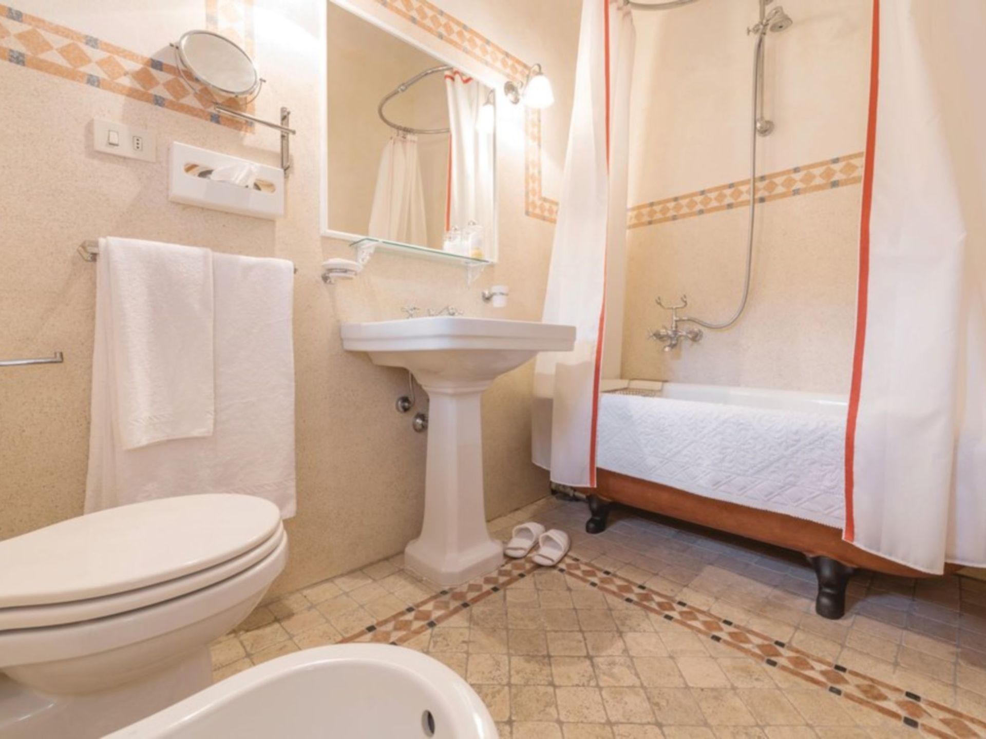 Badeværelse: vask, wc, bidet, badekar.