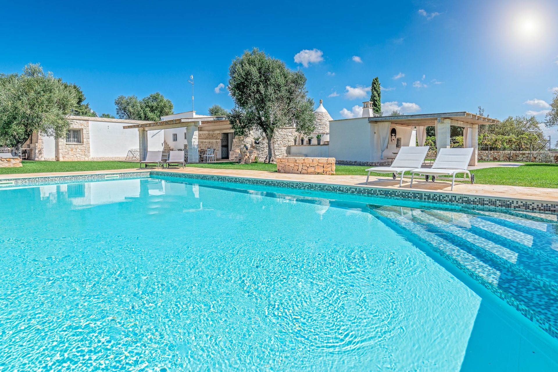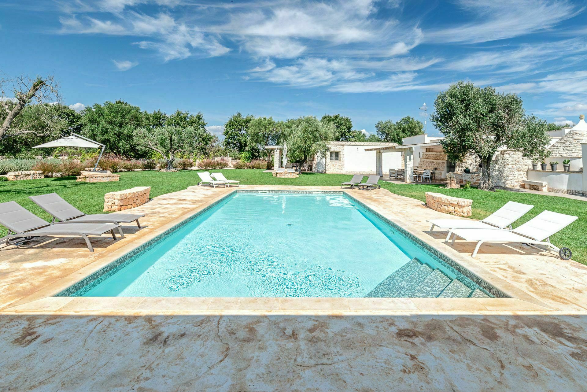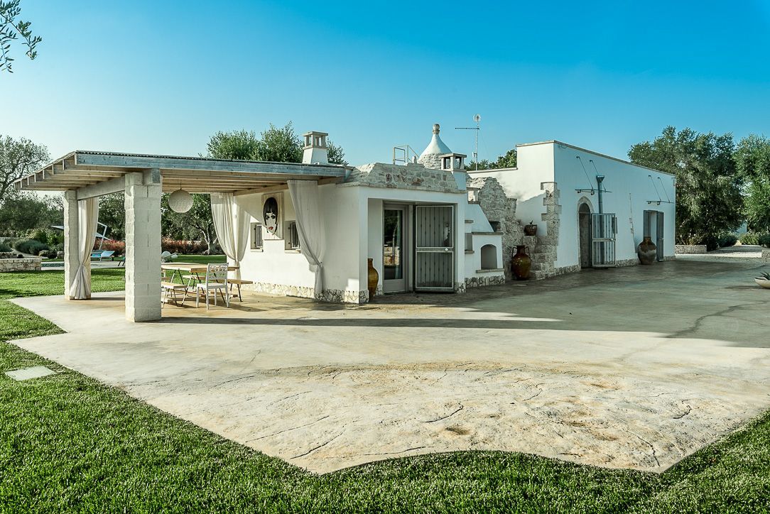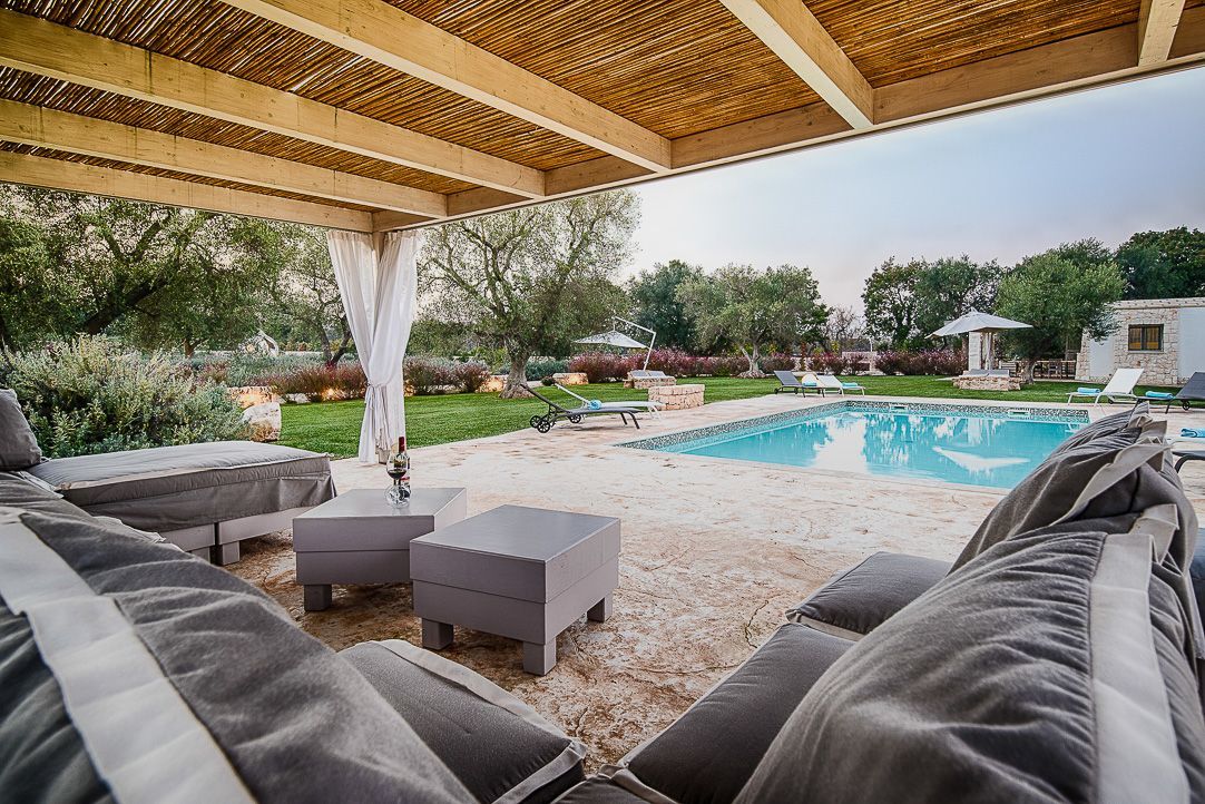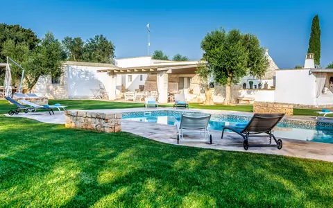 This villa with swimming pool, overlooking a picturesque setting, stands out for its thousand-year history, surrounded by the ancient charm of a trullo dating back over 500 years.