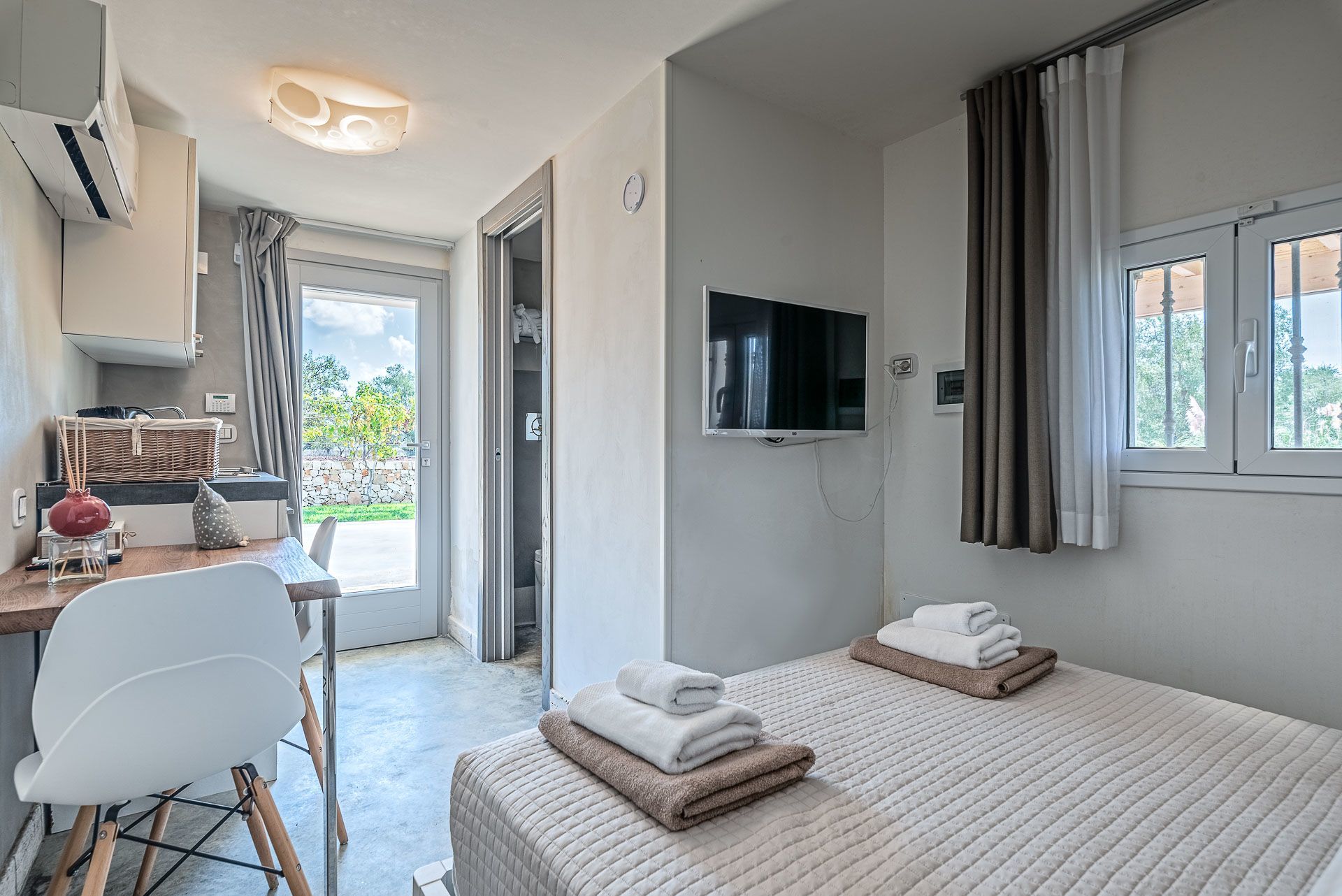 The trullo is magnificent, and as you enter through the main door, you come straight into a lounge, open plan, with dining table and very modern kitchen. The fixtures and fittings are of a high quality. The kitchen has everything you will need during your stay, with gas hob, small oven, and small dishwasher. Coffee Machine, toaster, and all the mod cons required for your holiday. There is a TV, so you can enjoy watching Italian TV and maybe brushing up on your Italian language skills. From this main trullo, you have two double bedrooms, one with a king sized bed, and stone shelving, with bedside cabinets, and patio doors opening up onto the grounds.