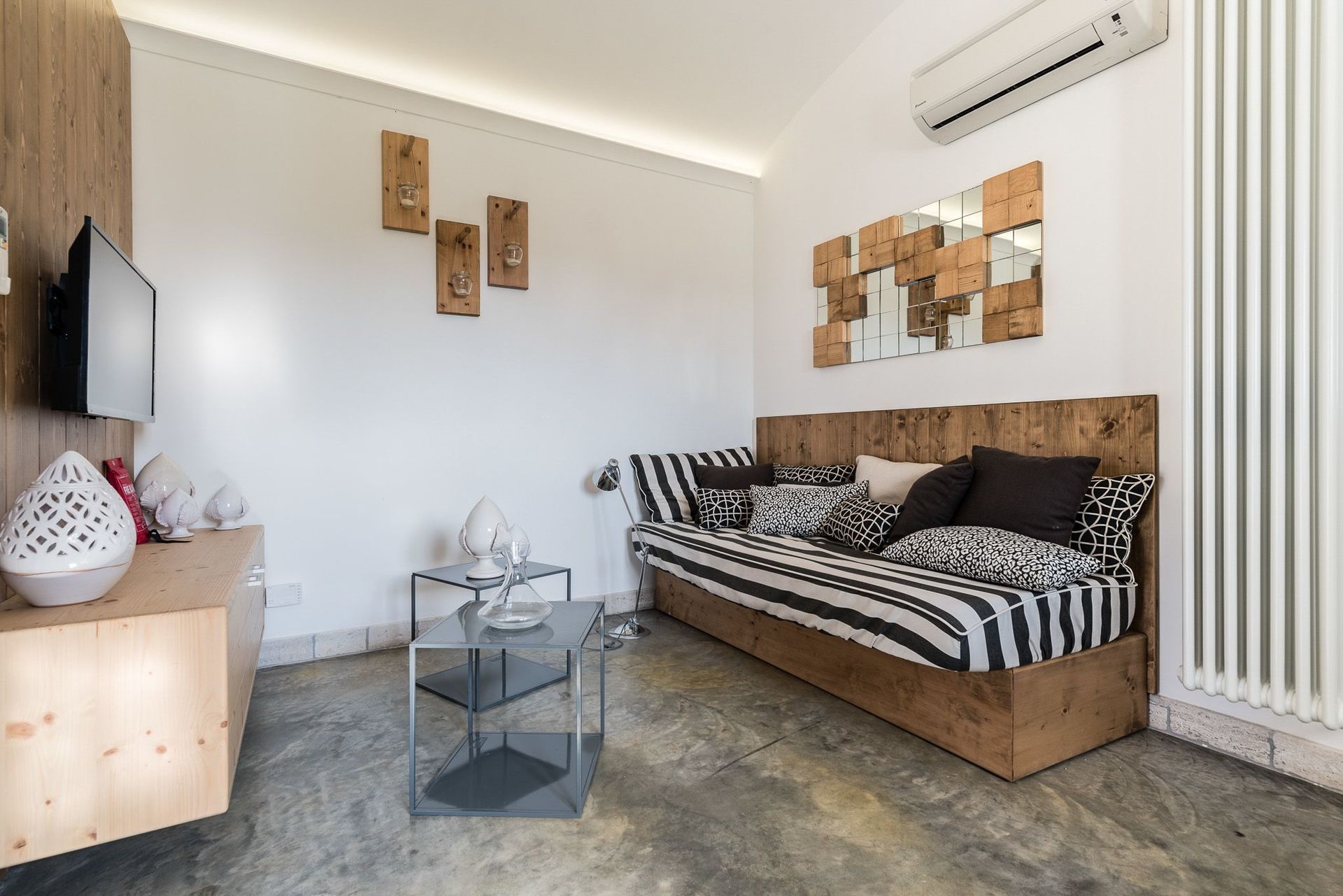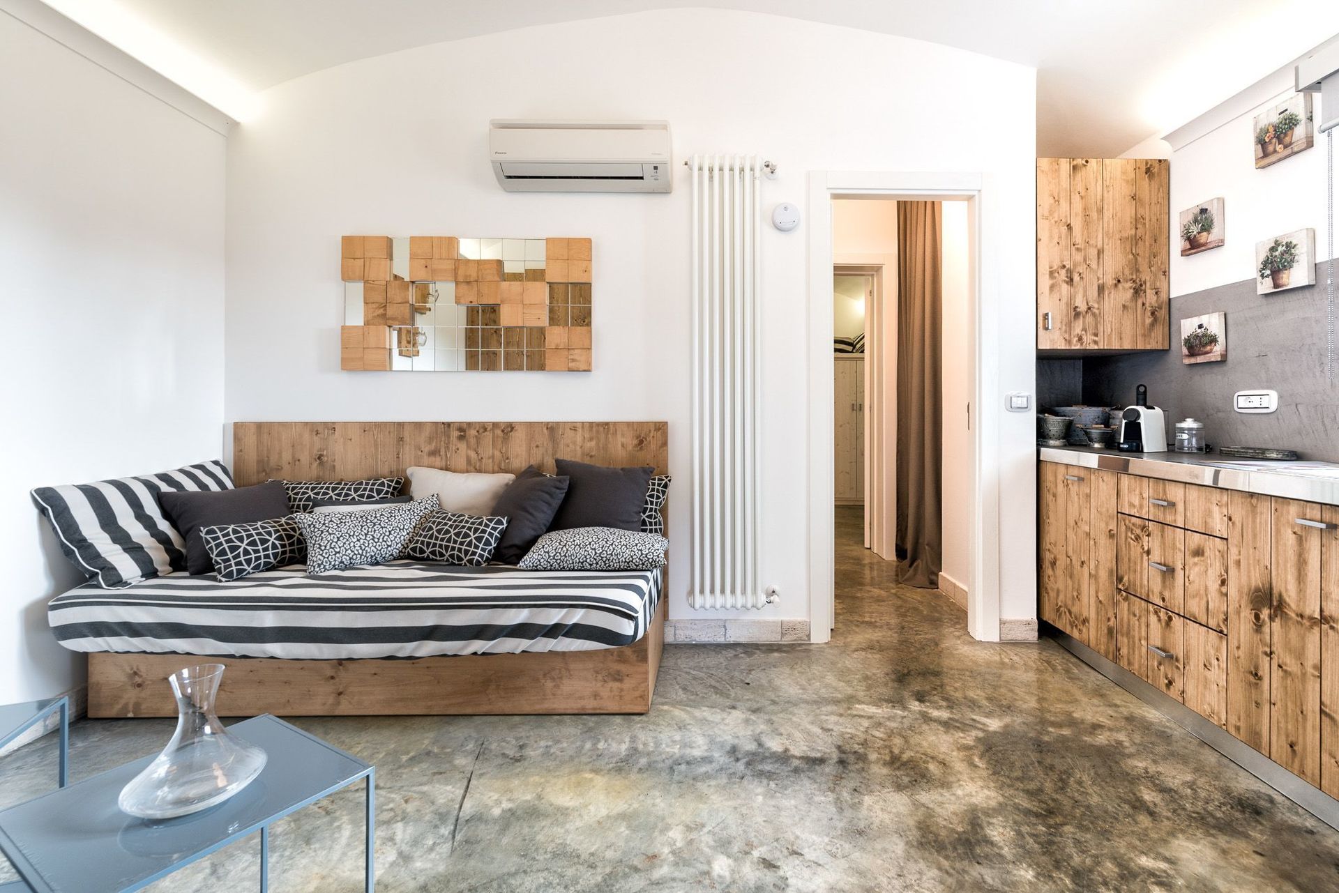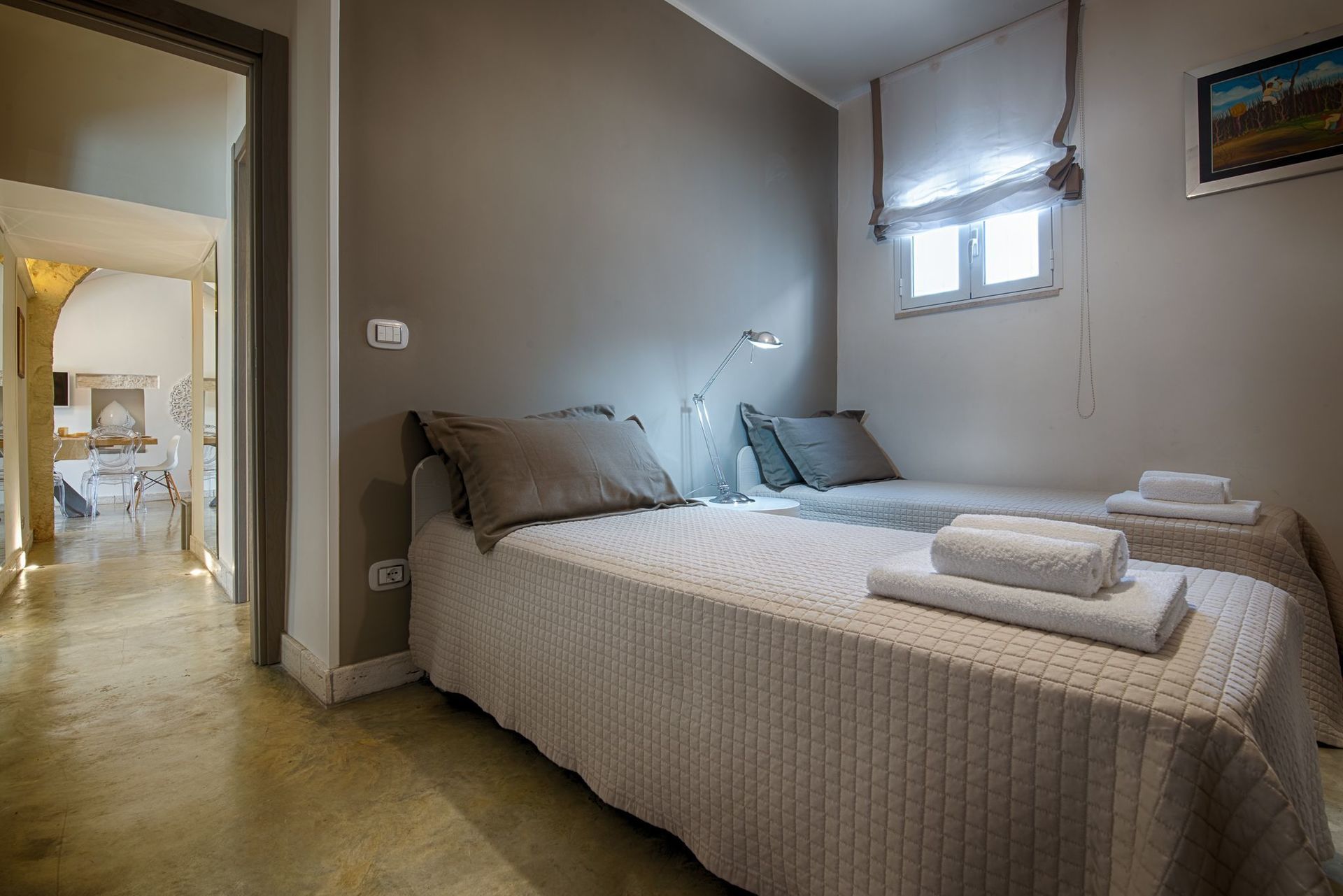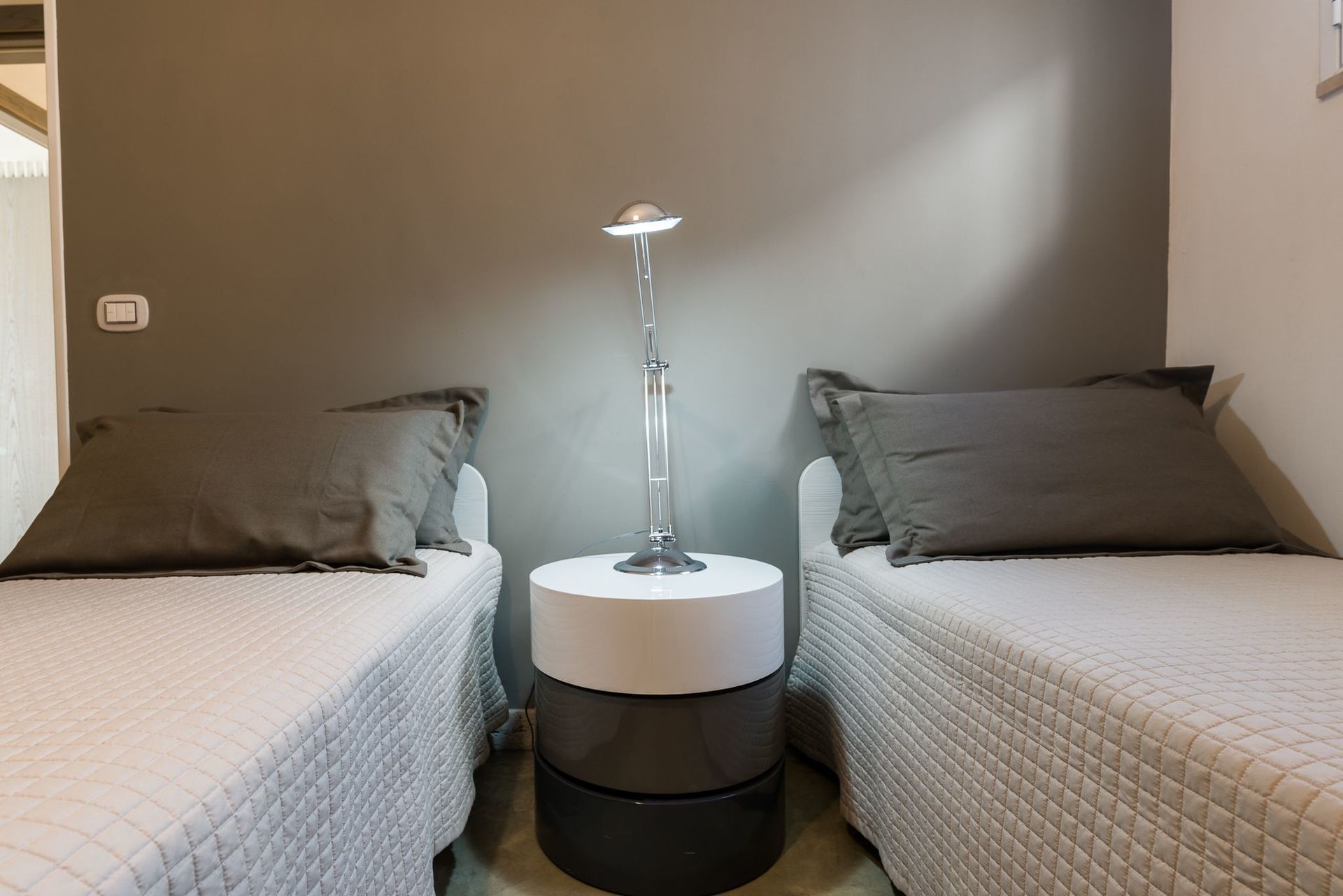 The next double bedroom has twin beds, with stone shelving, bedside cabinets, and plenty of room for either two adults or two children. These two bedrooms share a bathroom, with modern shower, black sink, built on a stone support. Toilet, bidet. From the lounge there is also patio doors that open up onto the gardens, and pool area, with plenty of covered veranda space, for 9. There are comfortable seating areas throughout and covered veranda's, where you can enjoy breakfast with warm croissants, and freshly brewed coffee. The next trullo adjoining, but accessed from a separate entrance, gives you an open plan lounge, kitchen area. Ideal for a couple. Independent of the main trullo, there is also a gas hob, electric oven, and dishwasher Wall mounted white TV. With coffee making facilities, sink, and drainer. Through to the bathroom on the left, again high quality, fittings, with stone washbasin, in black, toilet and bidet, and large shower area. There is also storage to the right, opposite the bathroom for your luggage. From here you go through to the bedroom, which has wardrobes, and a king sized bed. All rooms have air conditioning throughout.