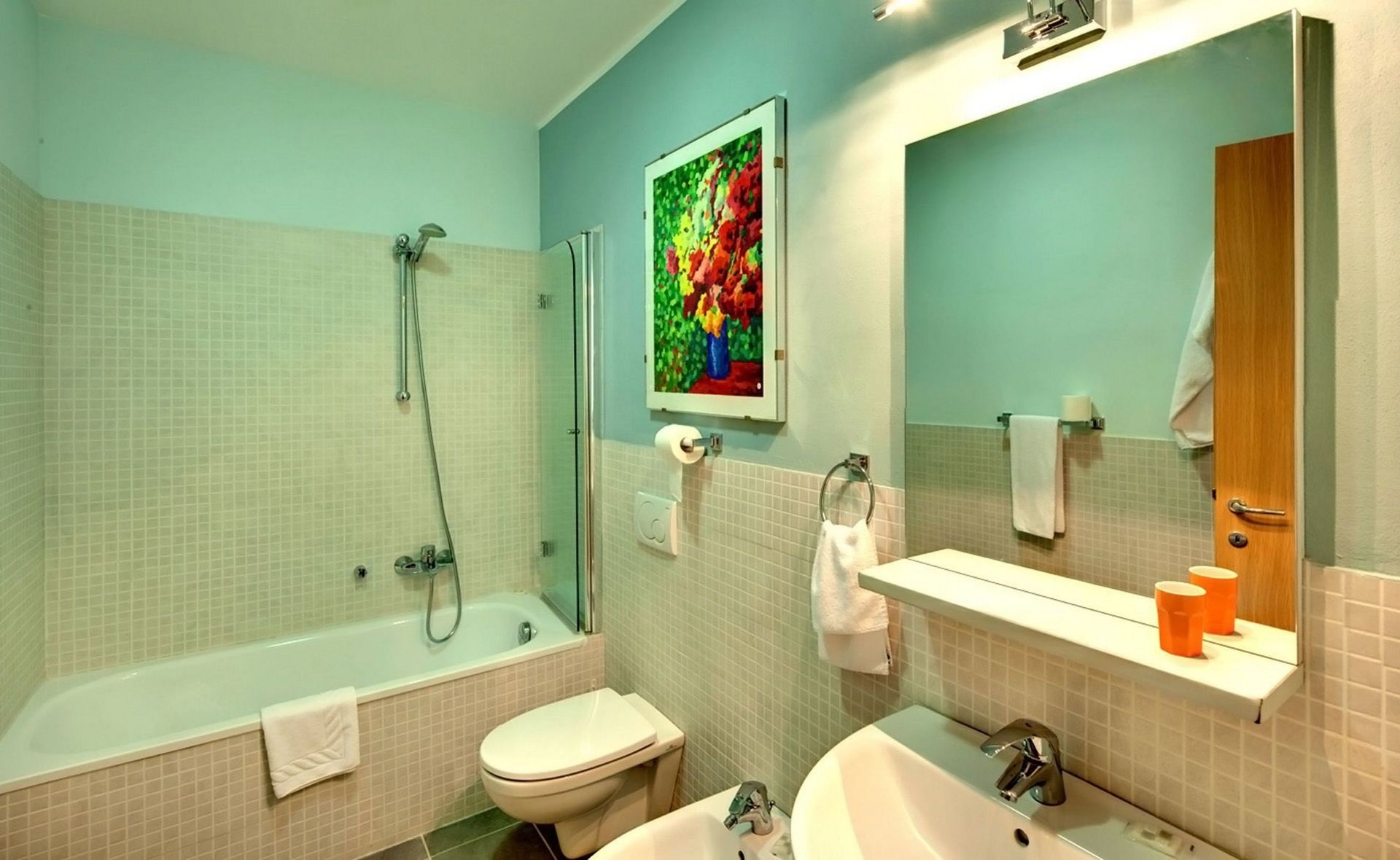Badeværelse: vask, wc, bidet, badekar, hårtørrer.