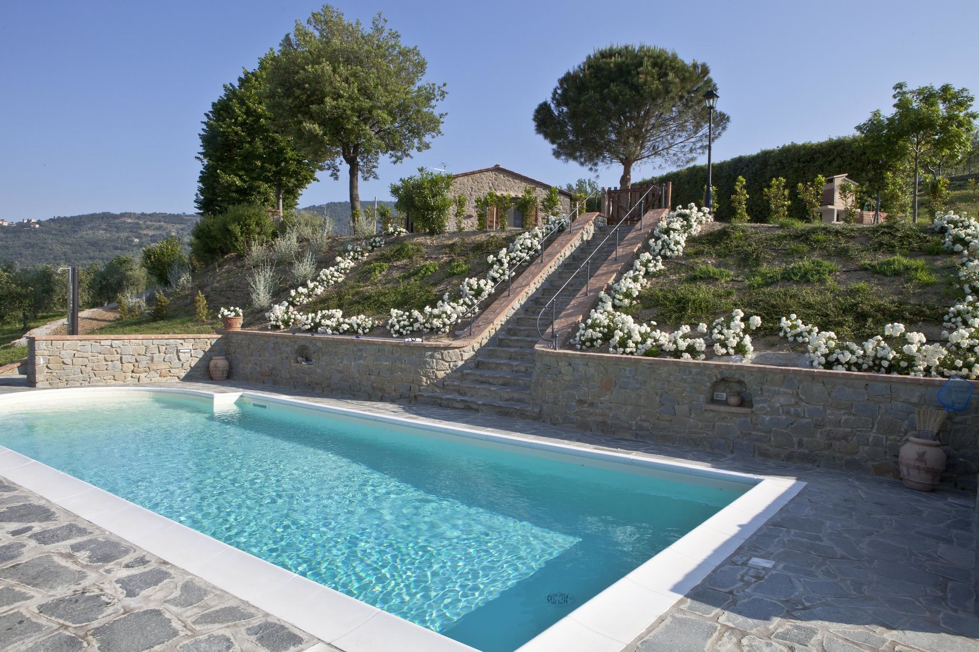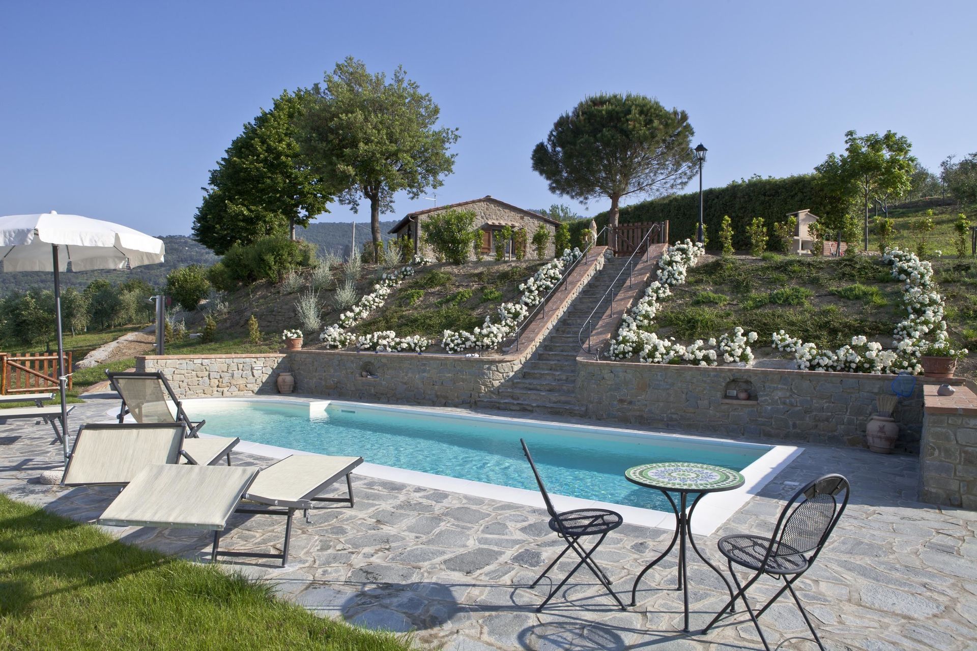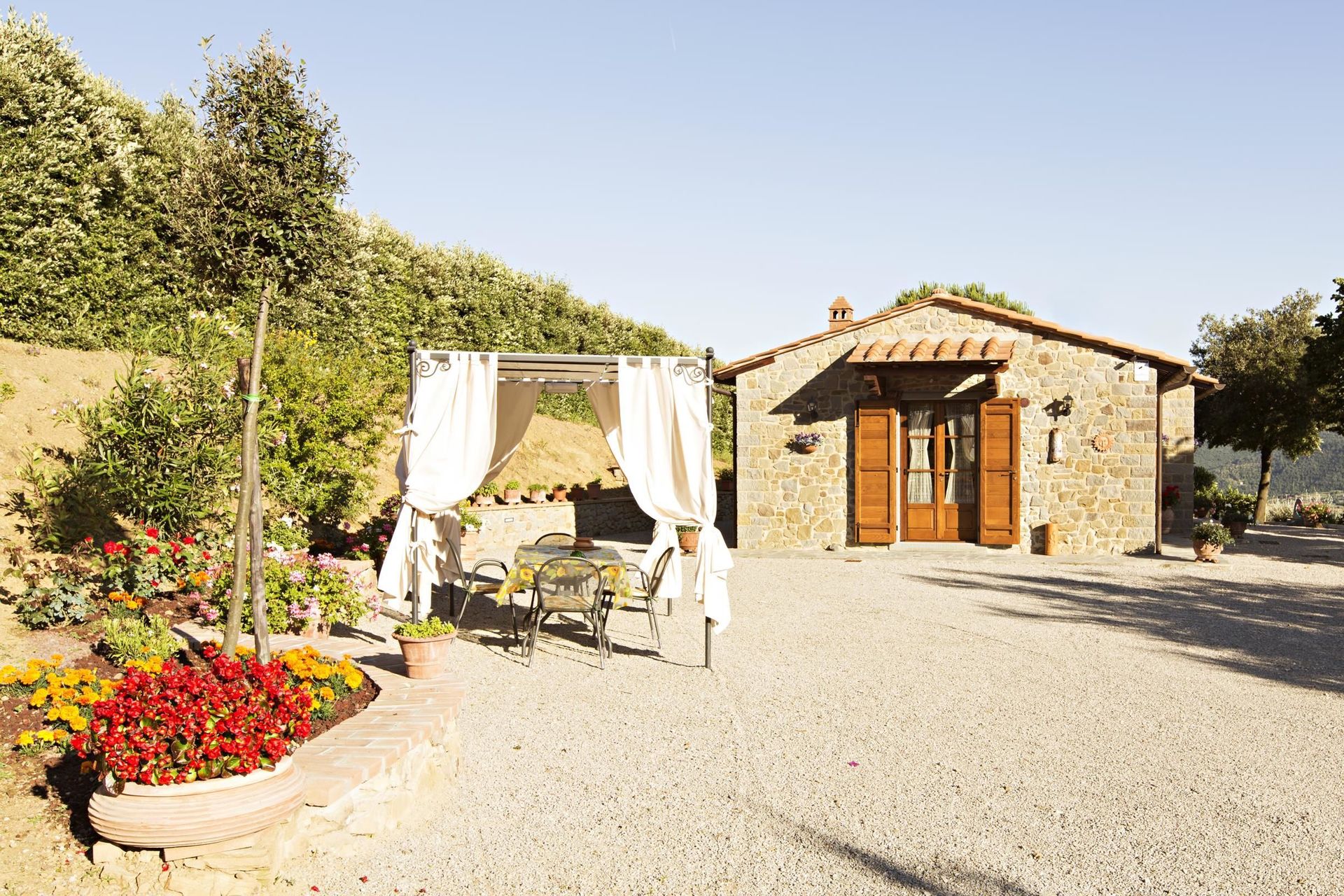 Ved ankomst vil I møde en fin ren velholdt ejendom med udsigt over bakkerne ideel til rolig ferie i Toscana. Efter en hektisk dag med sightseeing, er det dejligt at nyde lidt tid med venner og familie ved kanten af poolen med et glas vin - det er en perfekt måde at køle ned på sidst på dagen. At nyde et måltid med venner og familie er en kæmpe del af den toskanske kultur. Benyt det velekviperede køkken til madlavning med lokale produkter, når du er på ferie. Køkkenet indeholder kaffemaskine, mikroovn, brødrister, komfur og køleskab, samt, masser af service og bestik til op til fire personer. Spis 'al fresco' som en ægte toskaner. Den fuldt møblerede have er det ideele sted for at nyde sit måltid, familien og det flotte toskanske vejr.