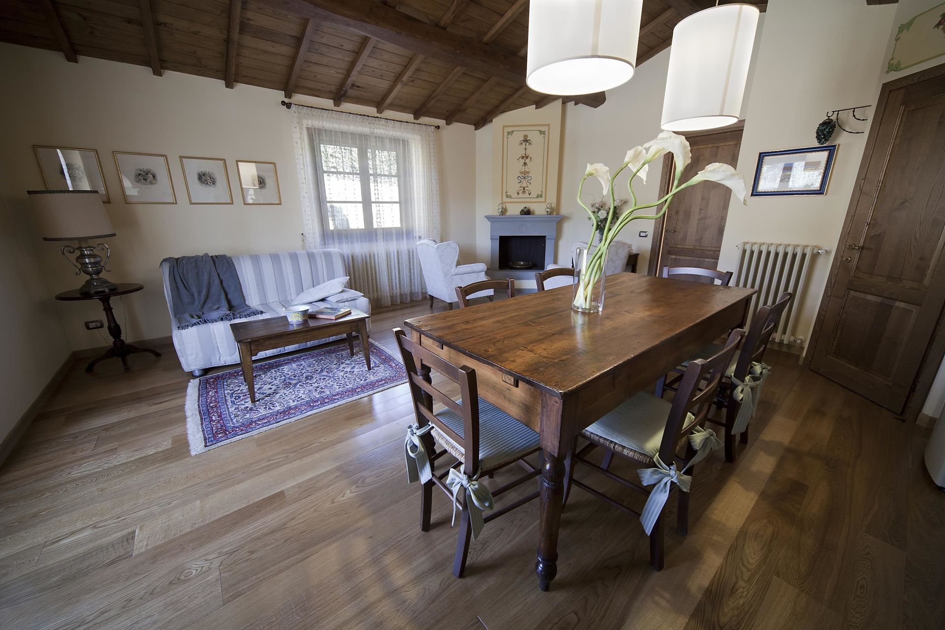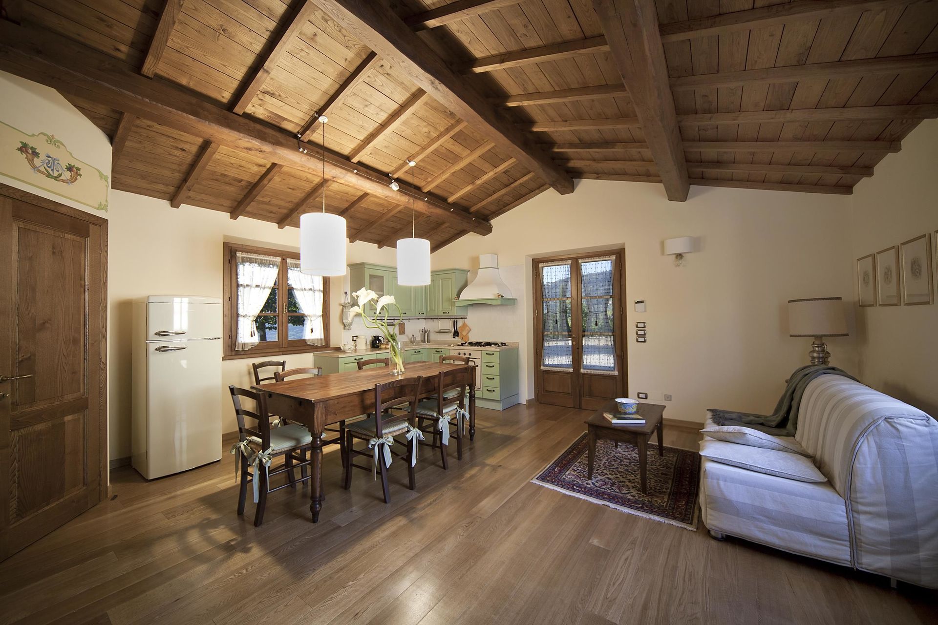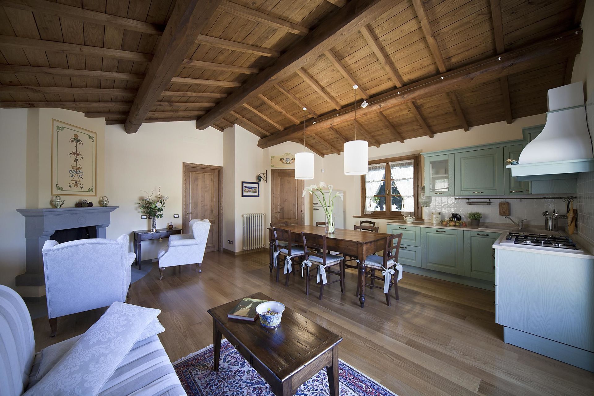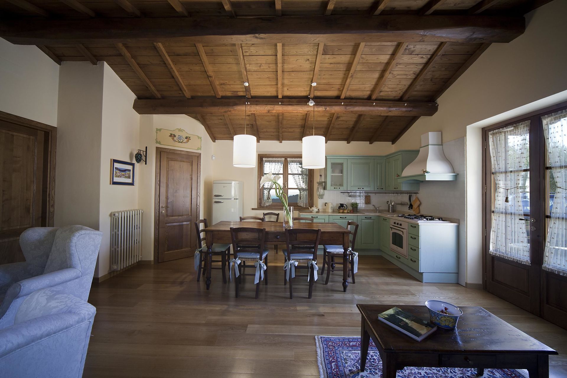 Køkken - stue: veludstyret køkken, spisebord (personer: 6), opvaskemaskine, køleskab, fryser, kogeplader, ovn, brødrister, italiensk kaffemaskine, to lænestole, kamin, dobbelt sovesofa, WIFI internet, klimaanlæg, satellit tv, udgang til have.
