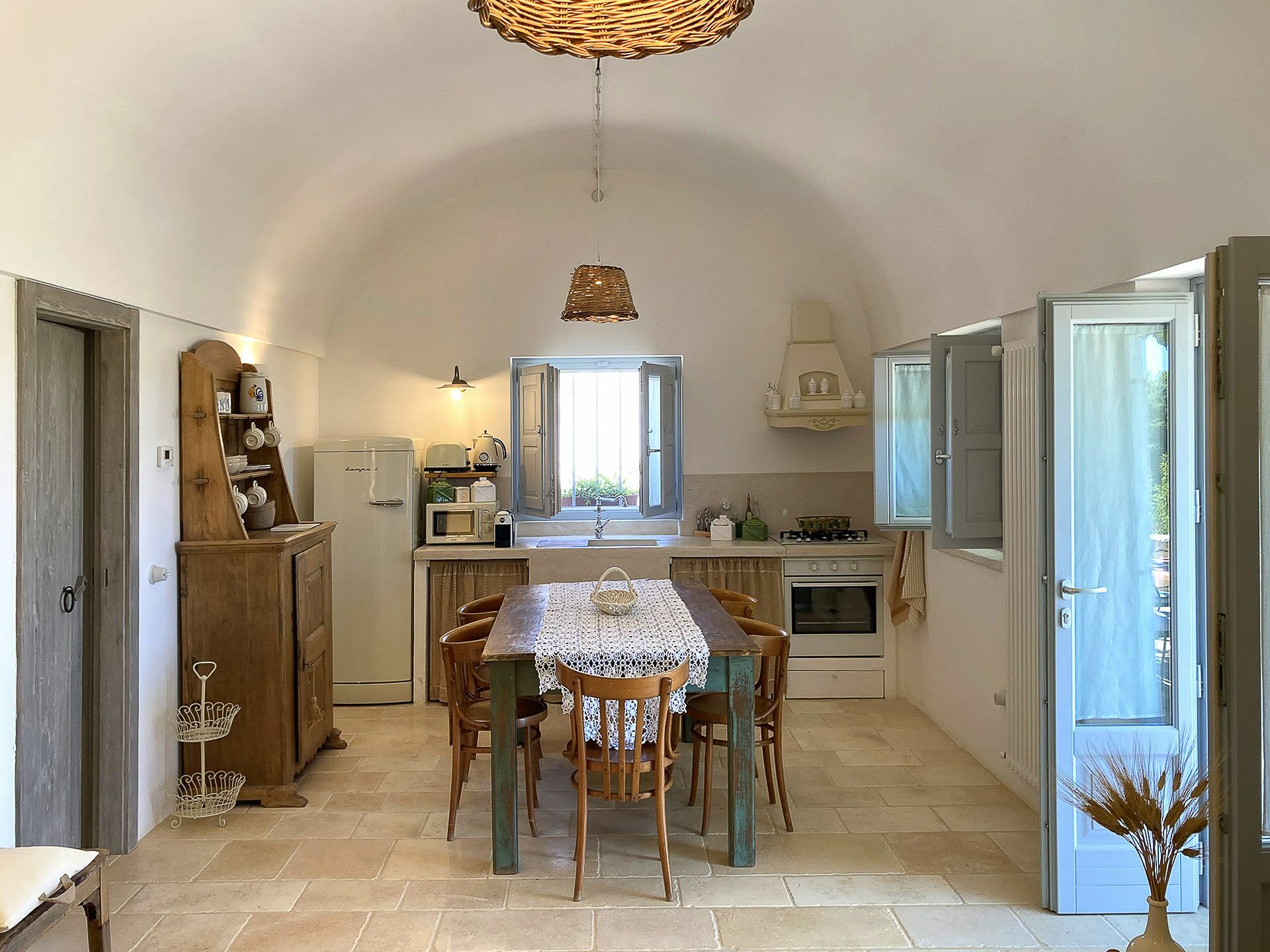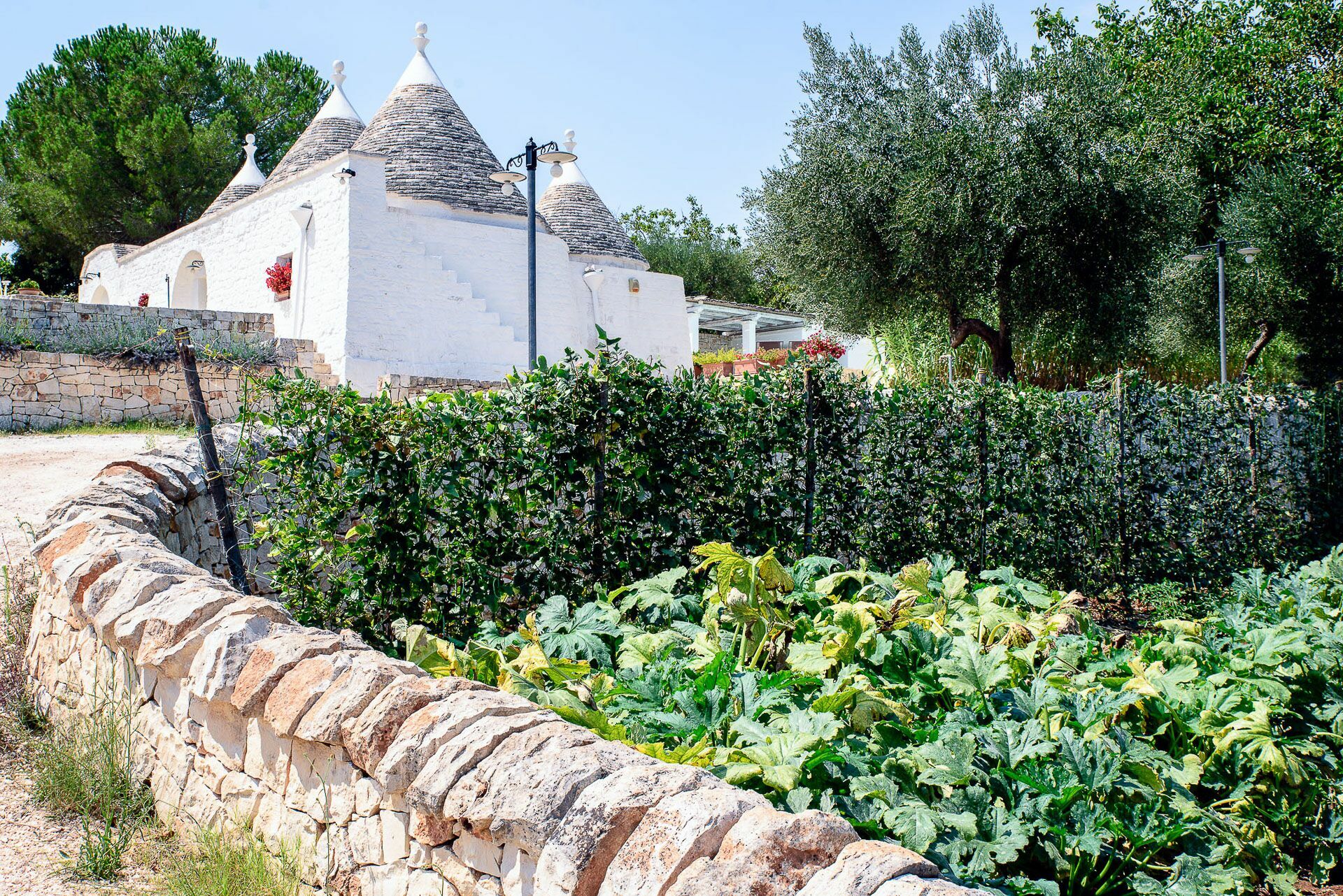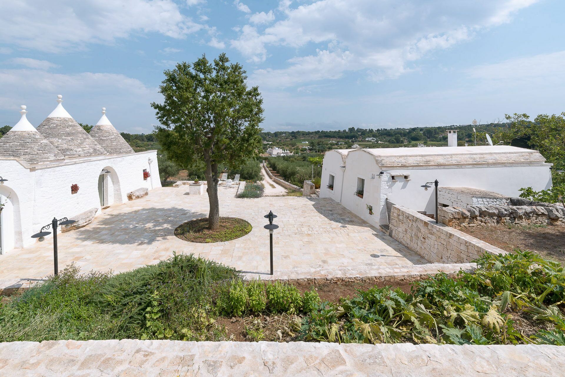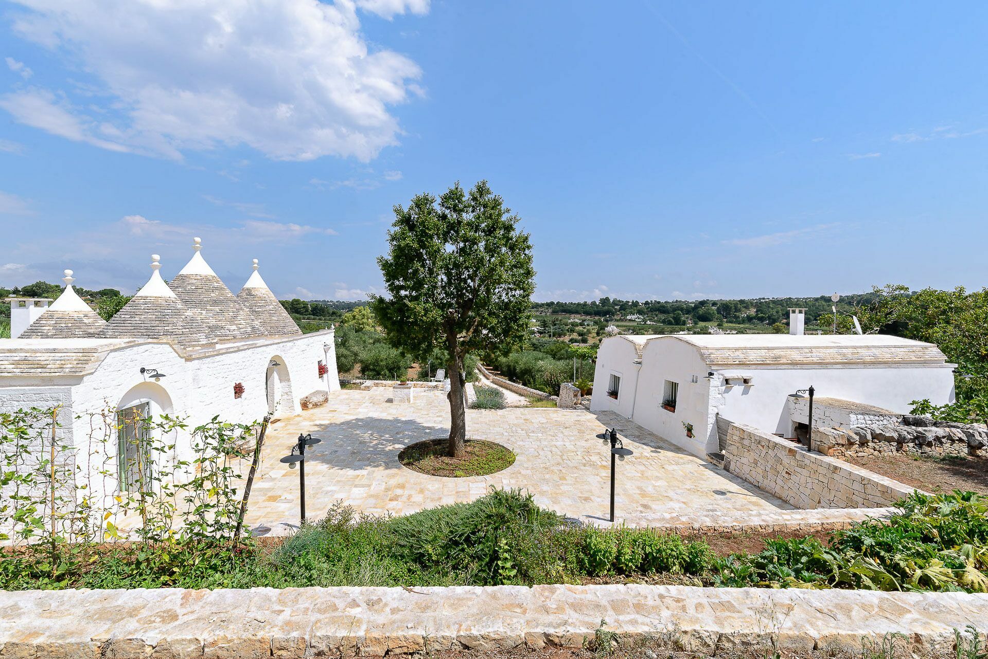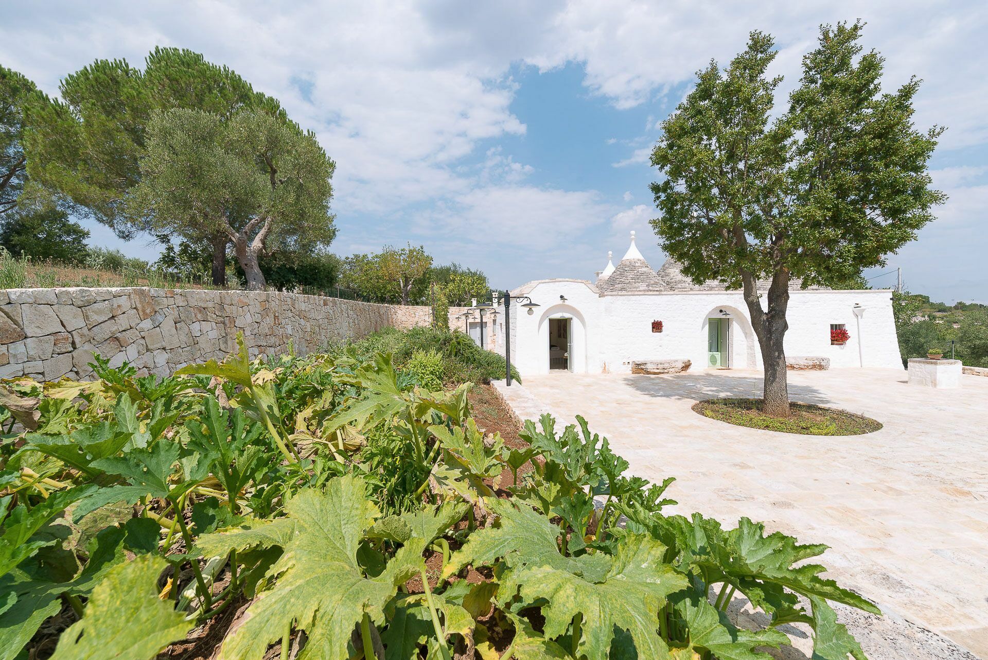 Outside the Trullo for rent there is a large garden with outdoor kitchen (wood oven and dishwasher), BOSE piped music system and the organic vegetable garden with two fresh verandahs.
