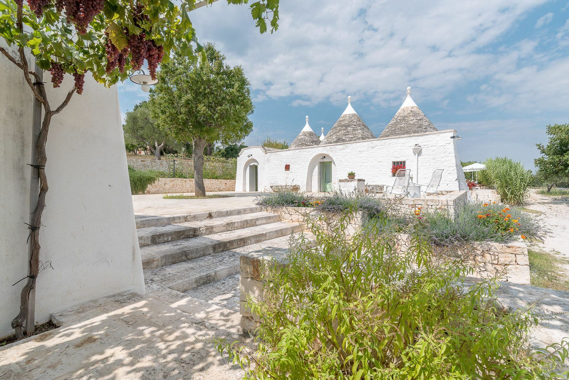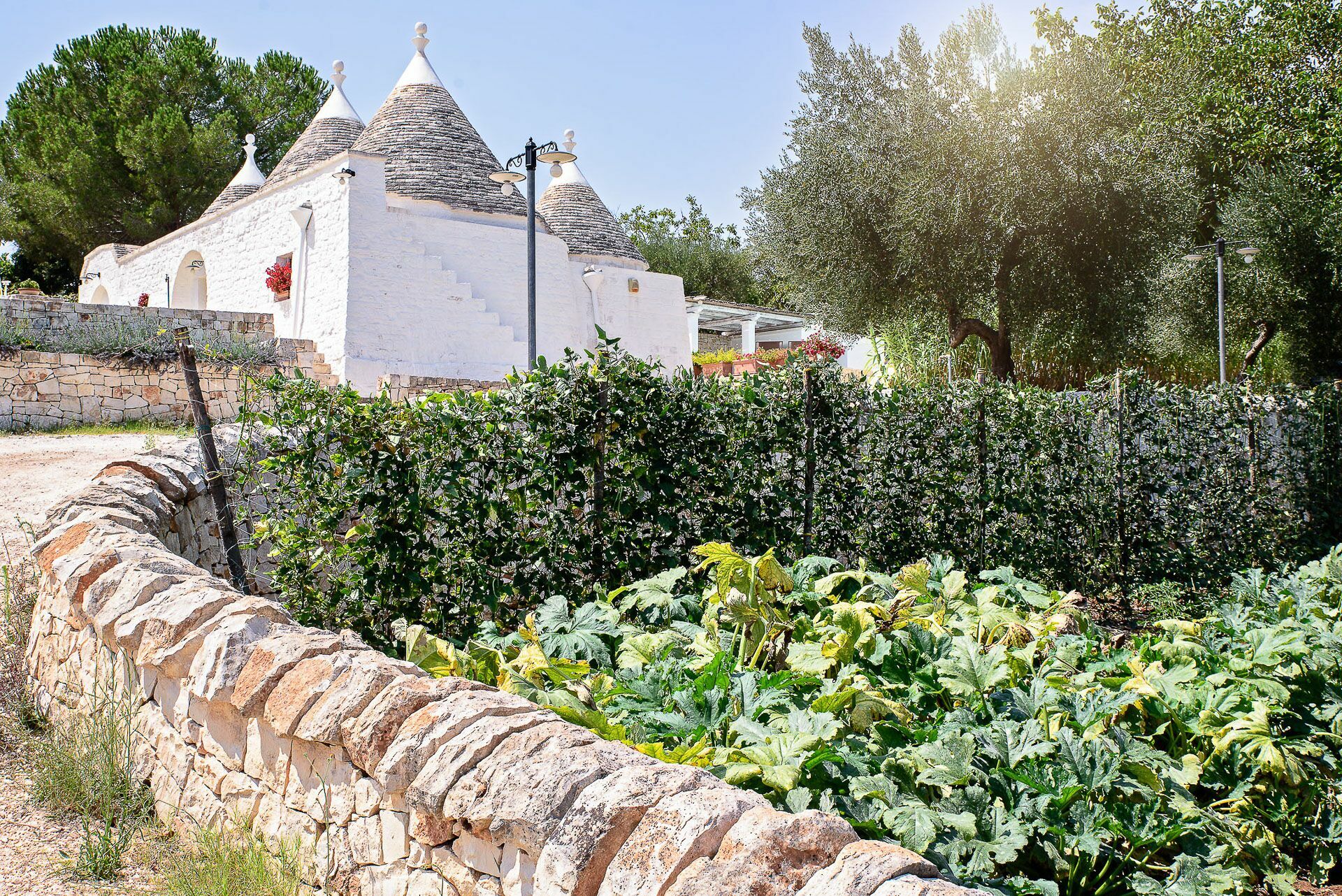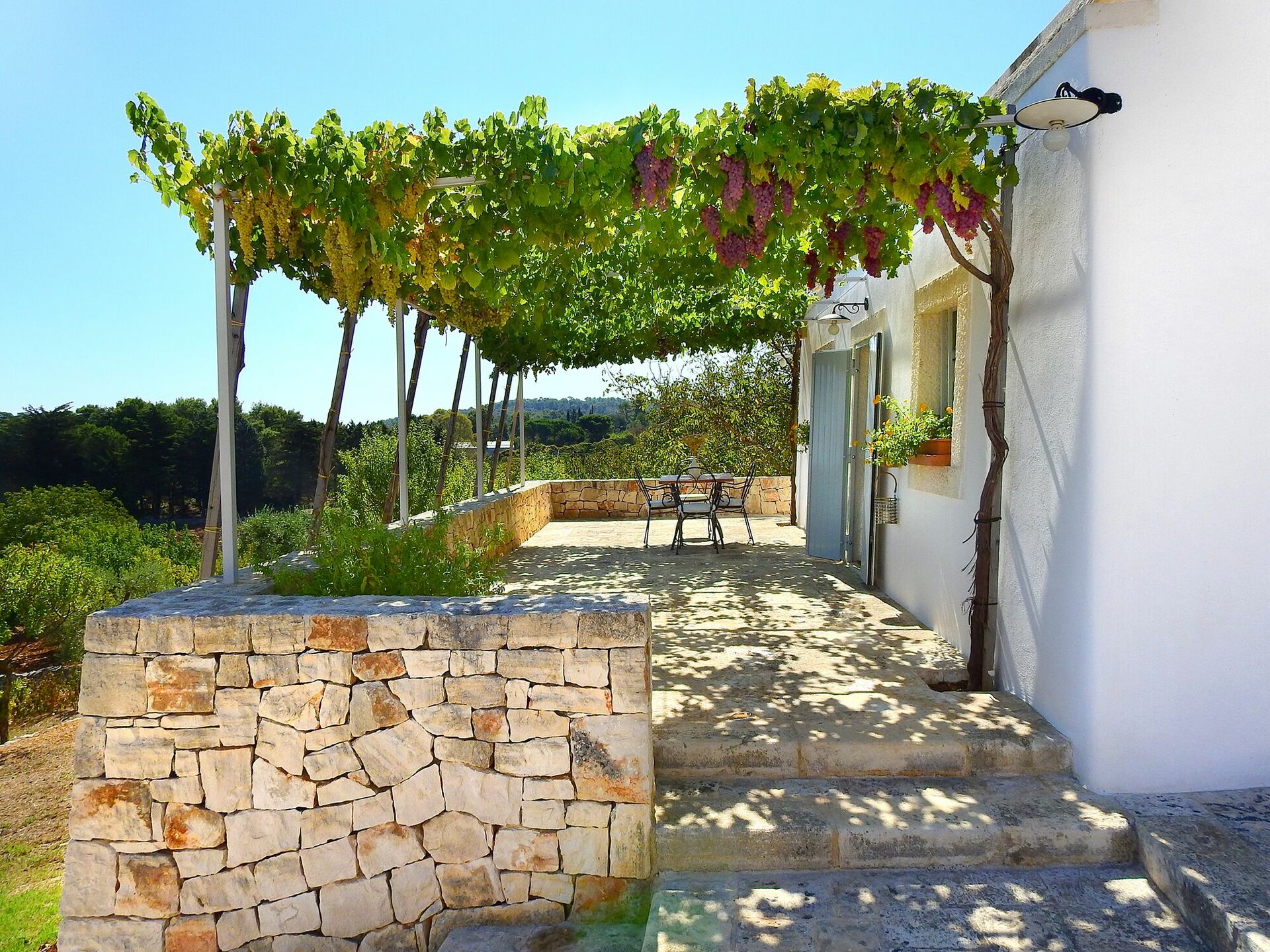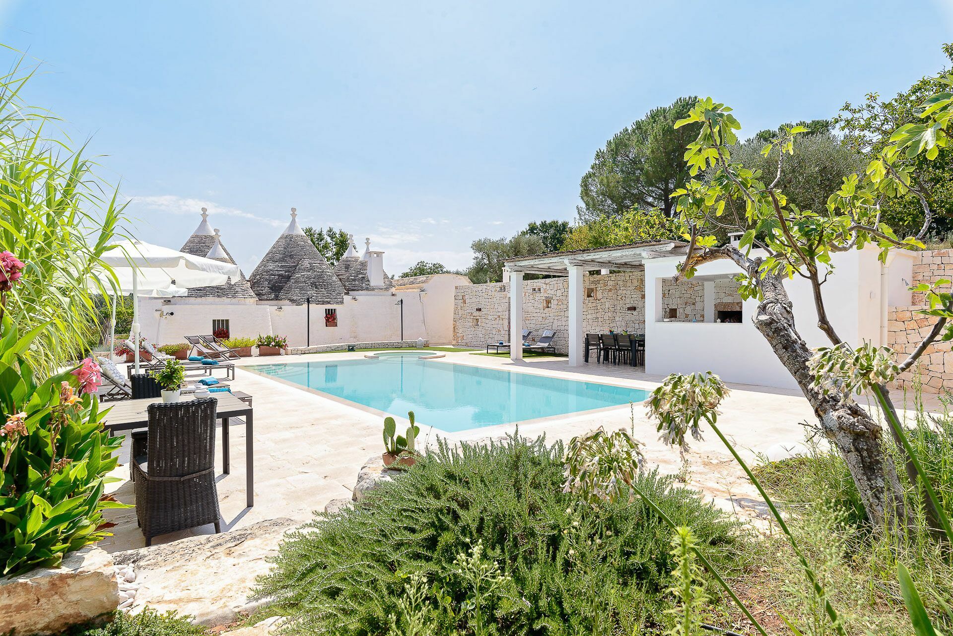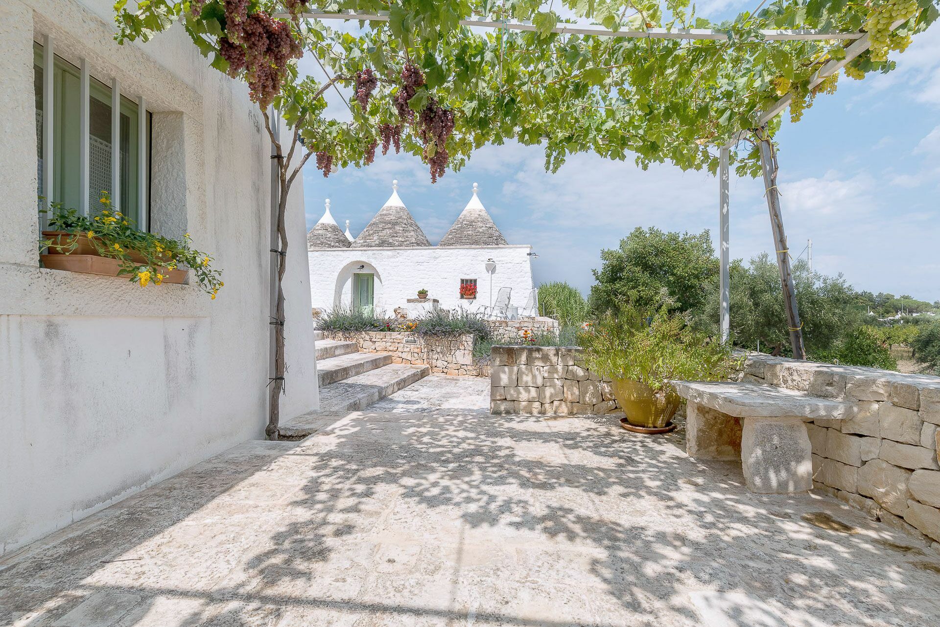 Outside the Trullo for rent there is a large garden with outdoor kitchen (wood oven and dishwasher), BOSE piped music system and the organic vegetable garden with two fresh verandahs.