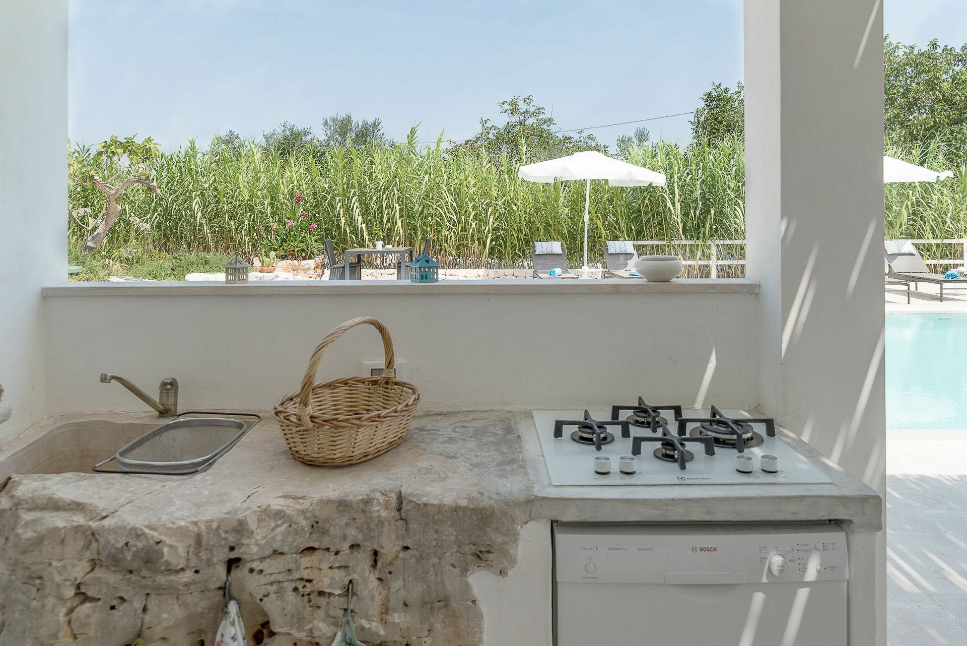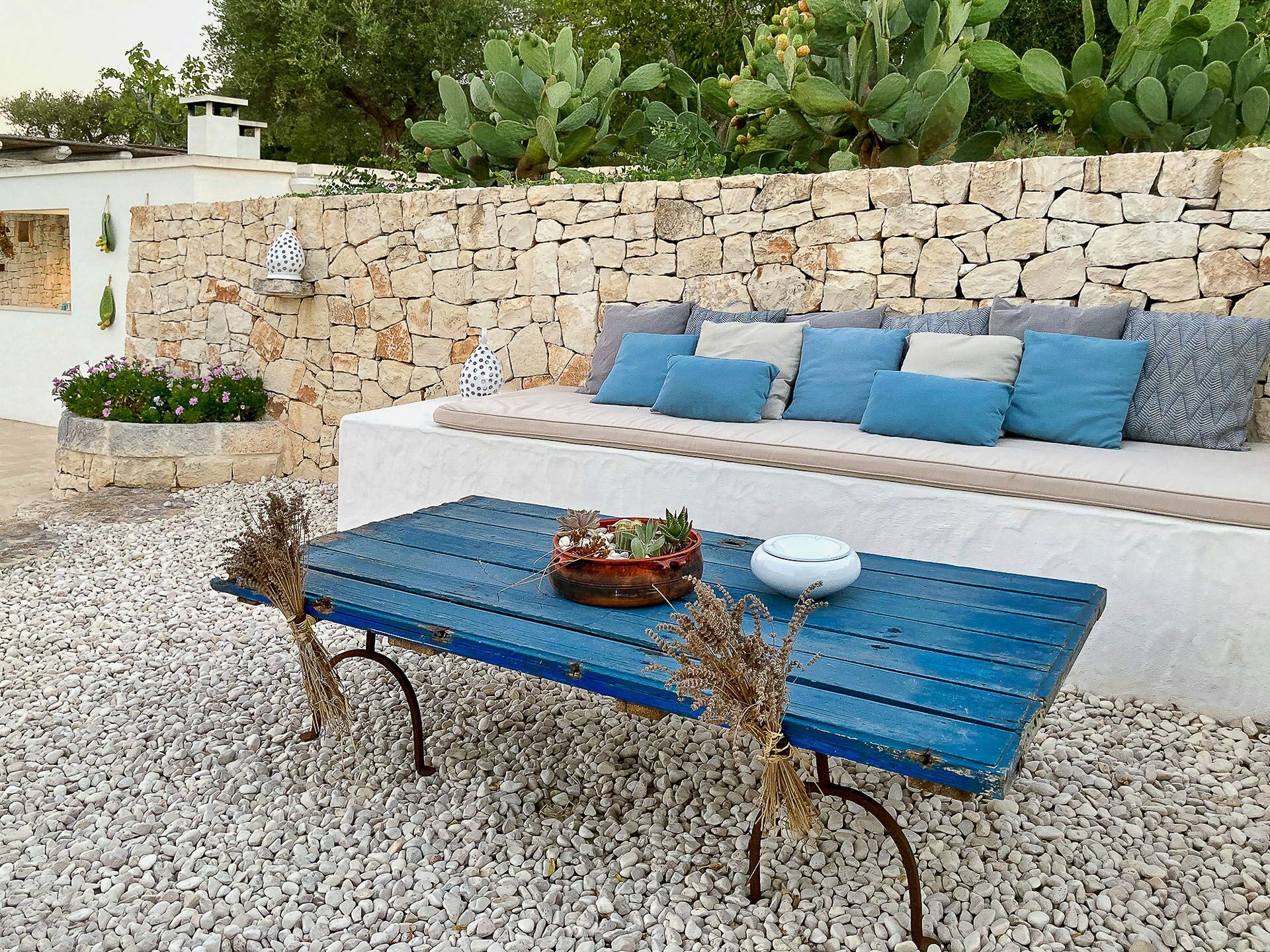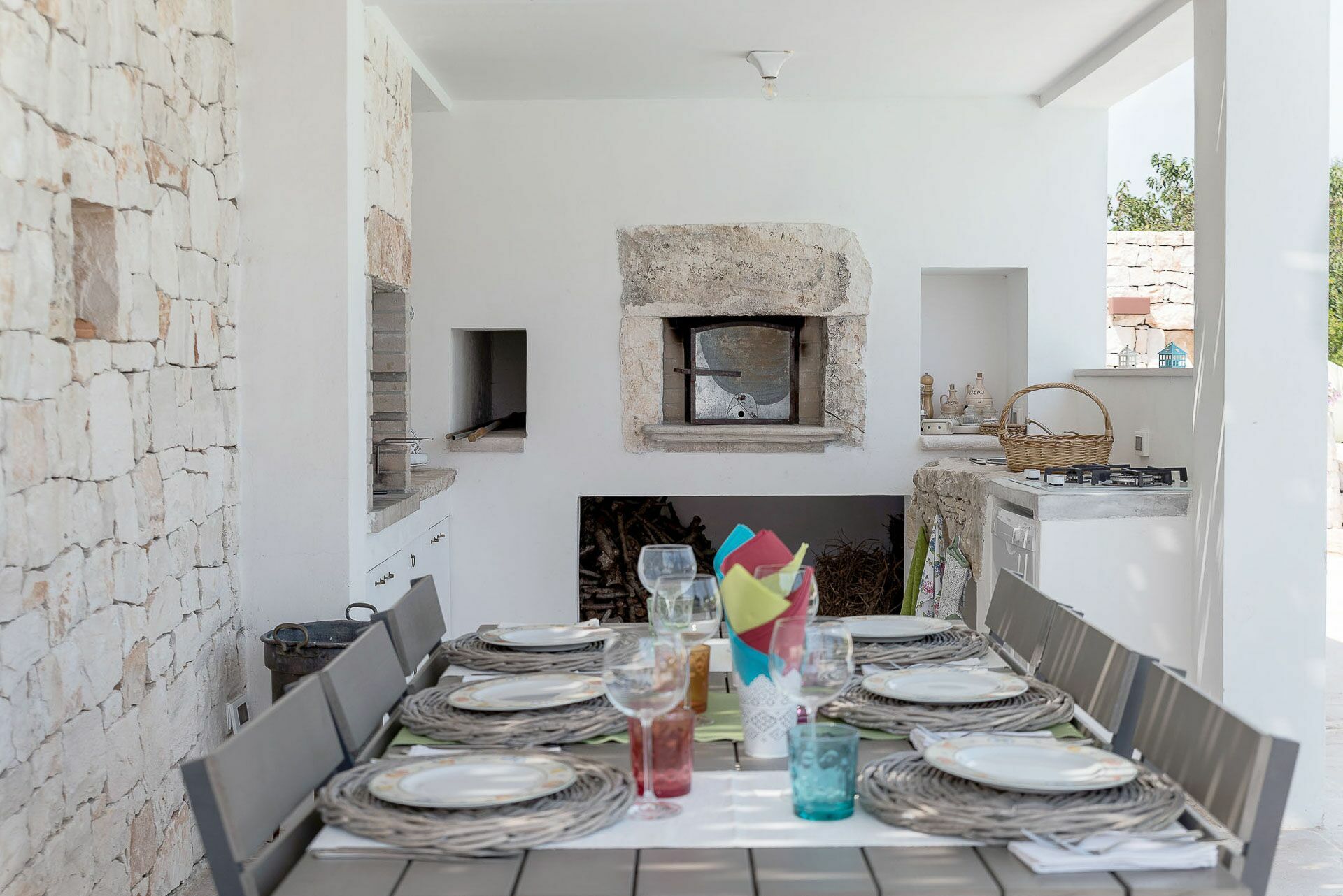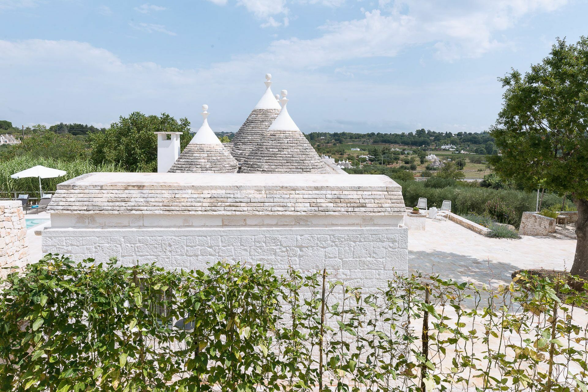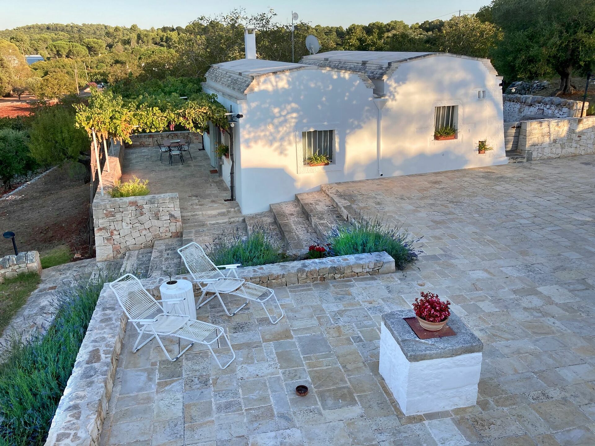 Outside the Trullo for rent there is a large garden with outdoor kitchen (wood oven and dishwasher), BOSE piped music system and the organic vegetable garden with two fresh verandahs.