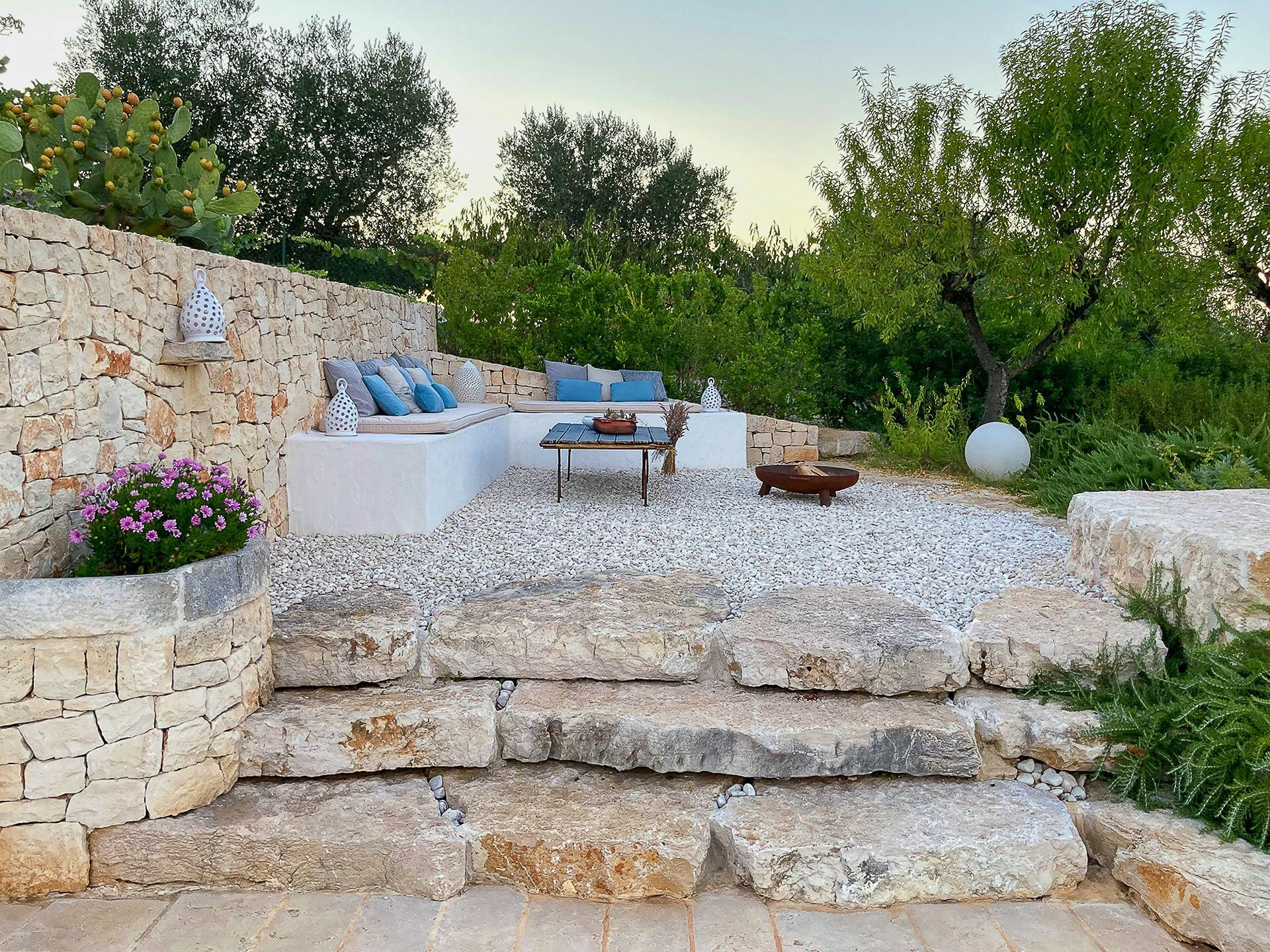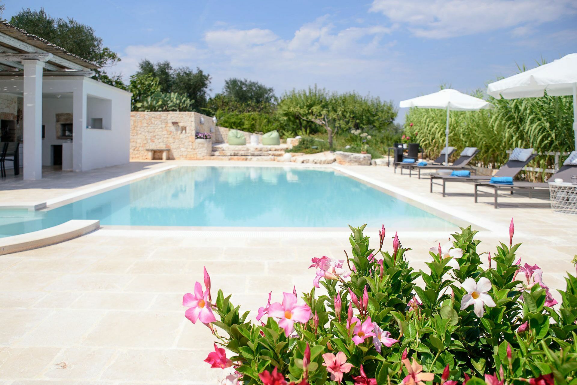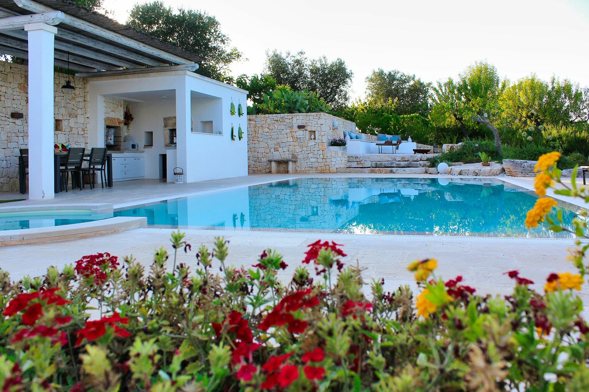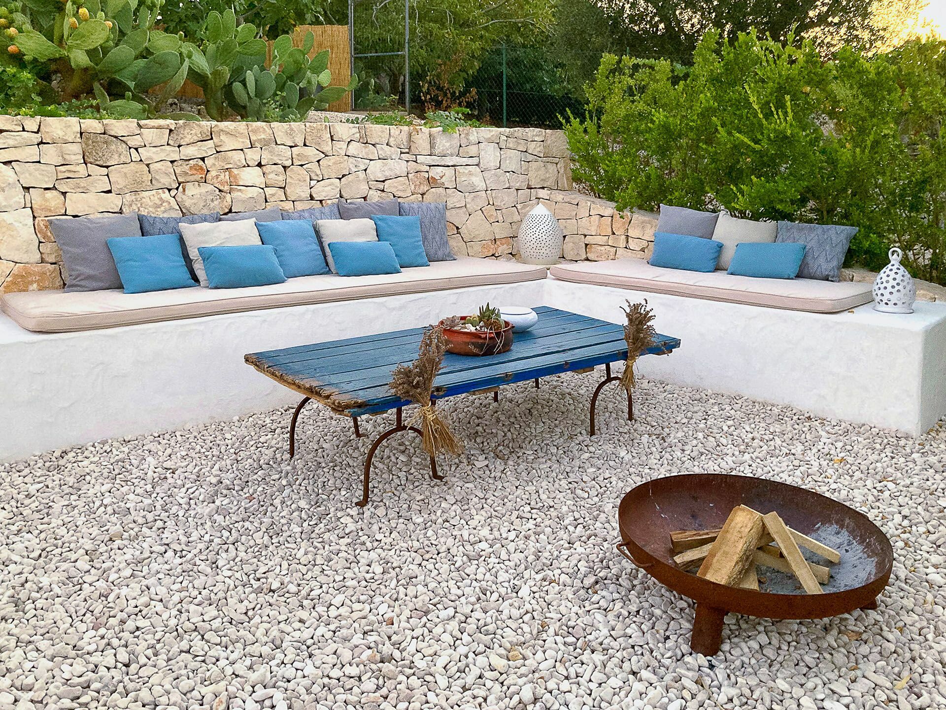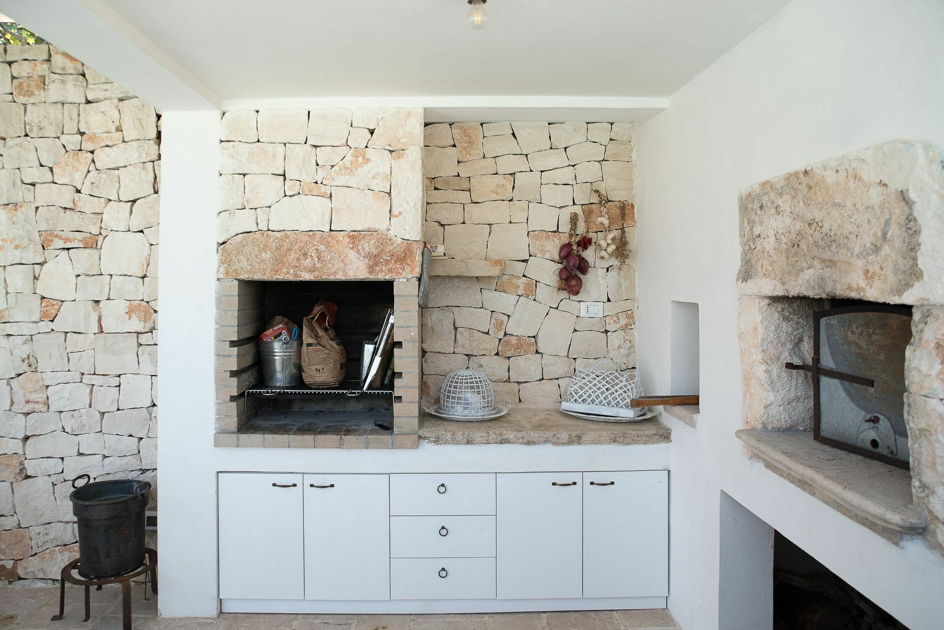 Outside the Trullo for rent there is a large garden with outdoor kitchen (wood oven and dishwasher), BOSE piped music system and the organic vegetable garden with two fresh verandahs.