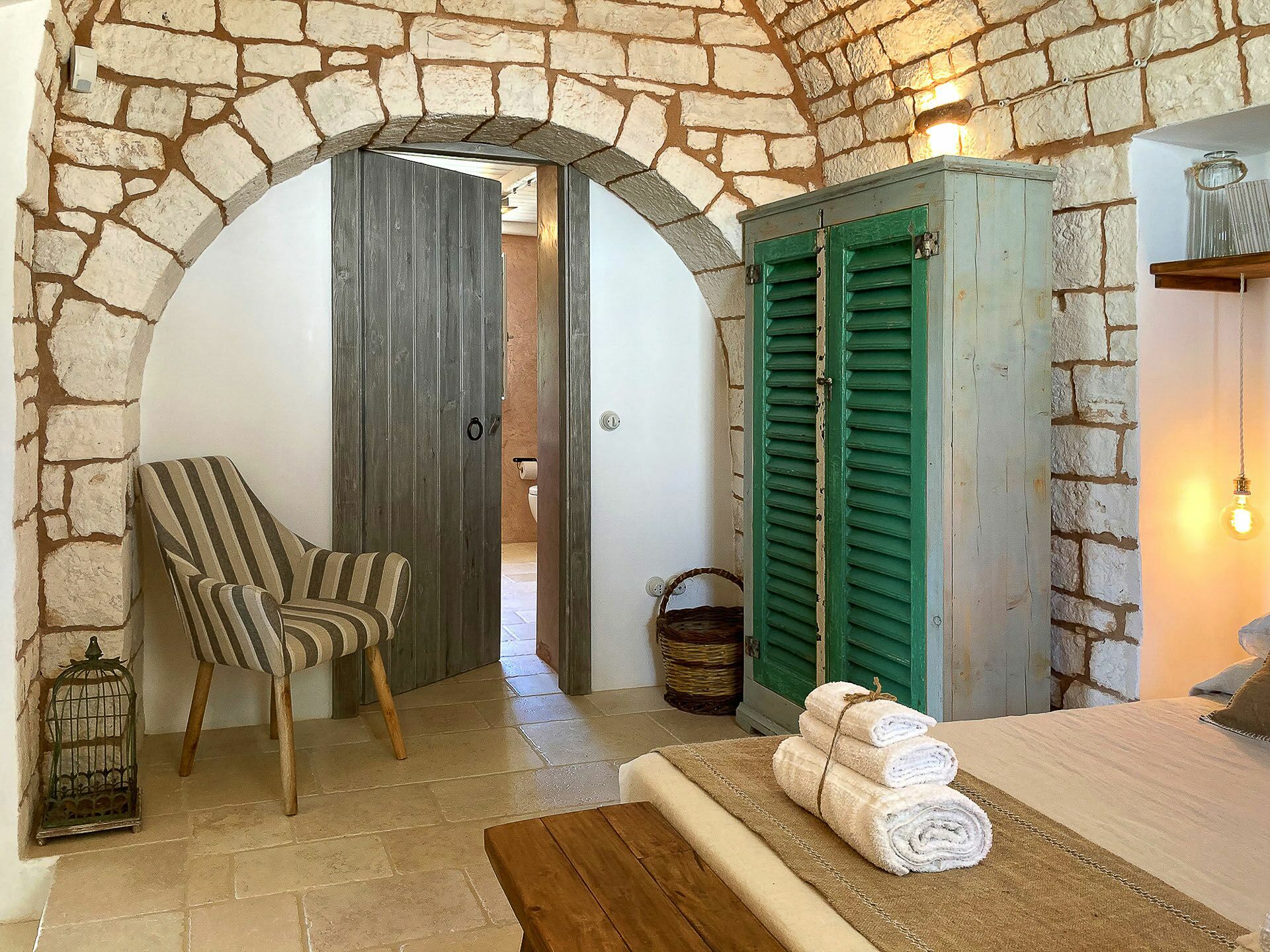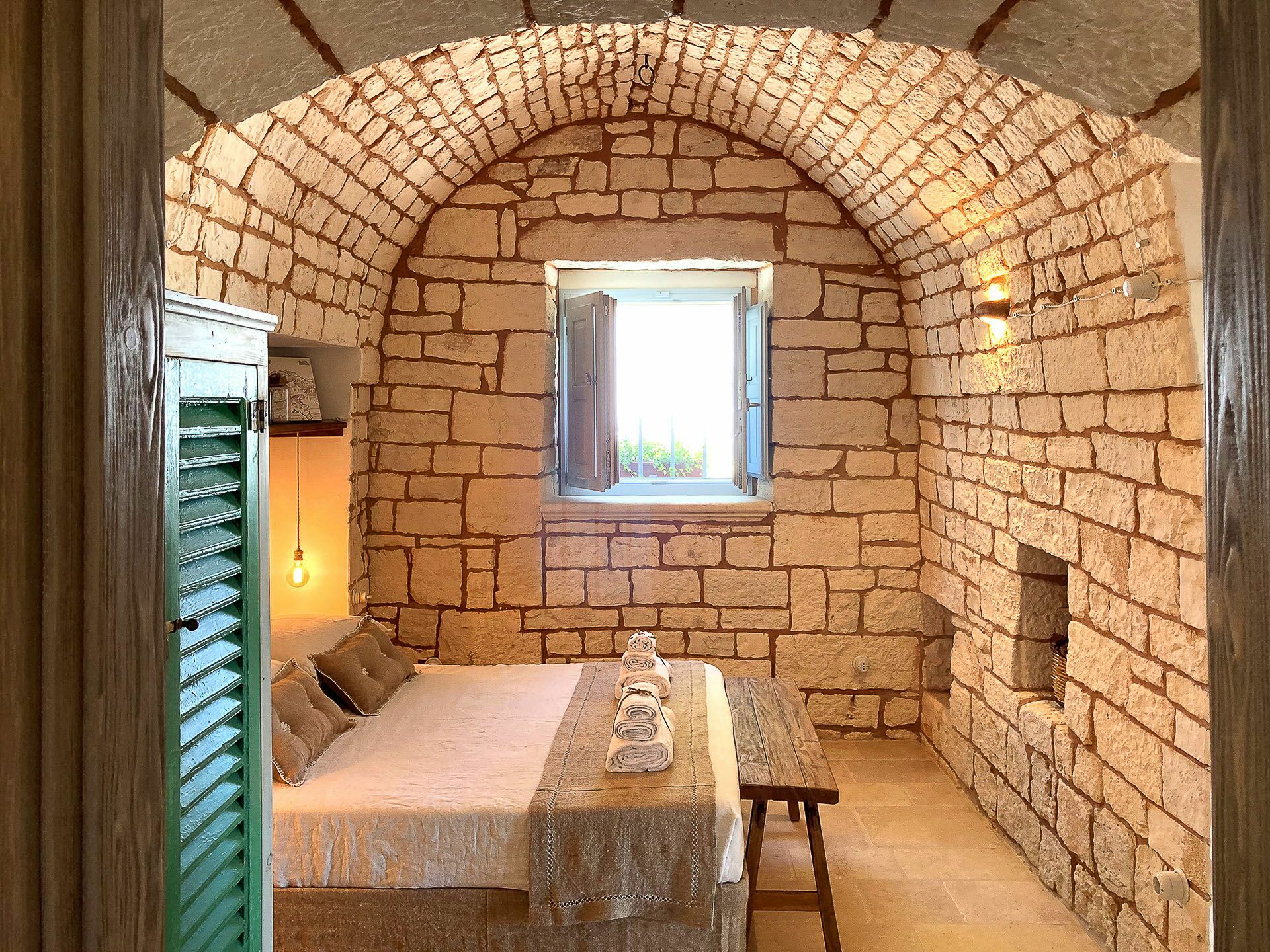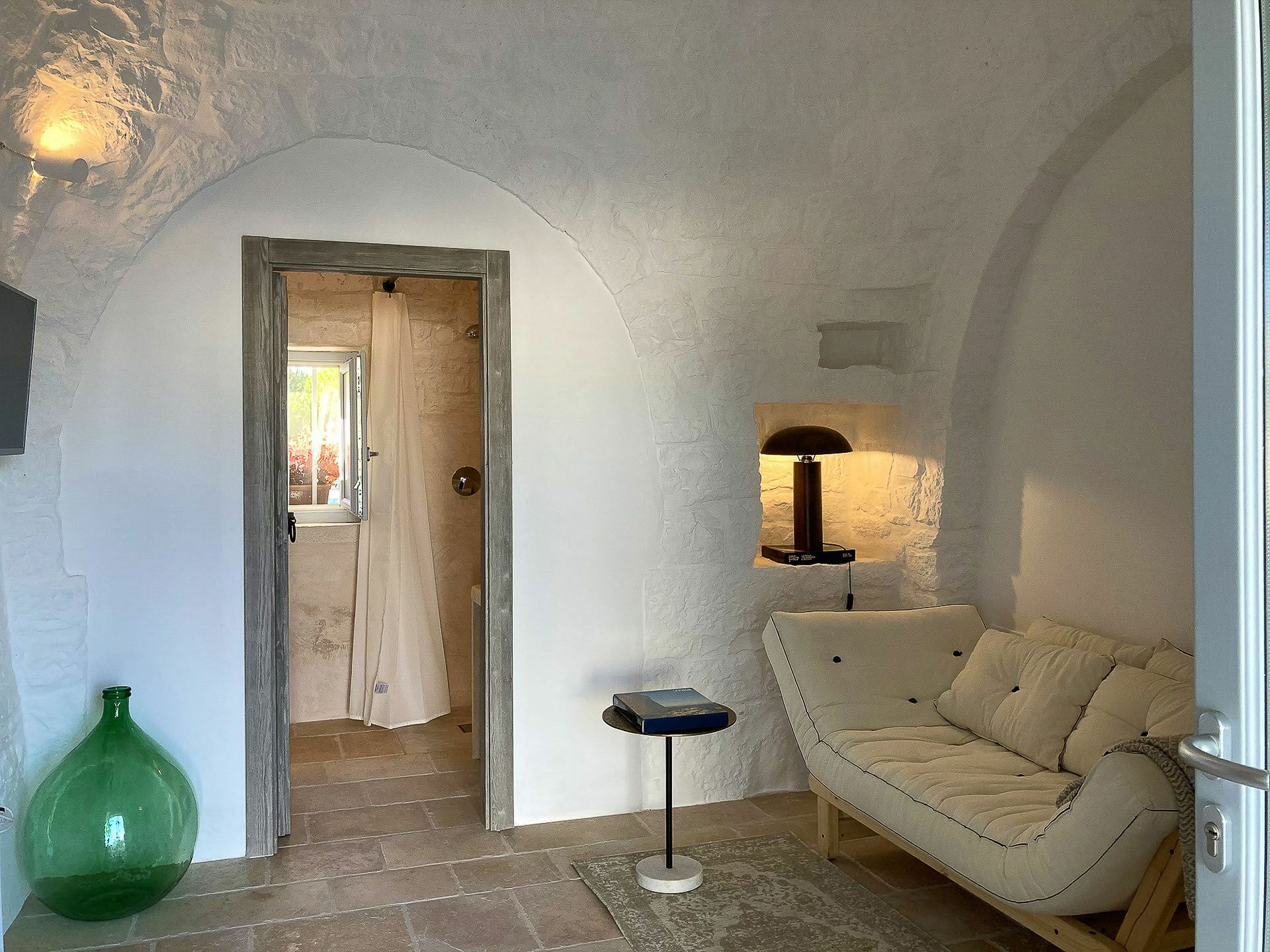 Trullo Oak consists of two very bright double bedrooms and one twin bedroom with windows that allow a view of the surrounding countryside, but what makes them unique are the vaults with exposed stone that give a characteristic, unique and special touch to these environments. There are 5 bathrooms in all, one of which is outside near the pool; the bathrooms consist of WC, bidet, sink and shower.