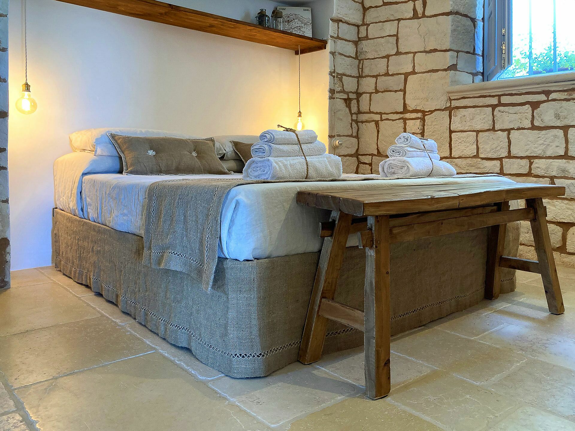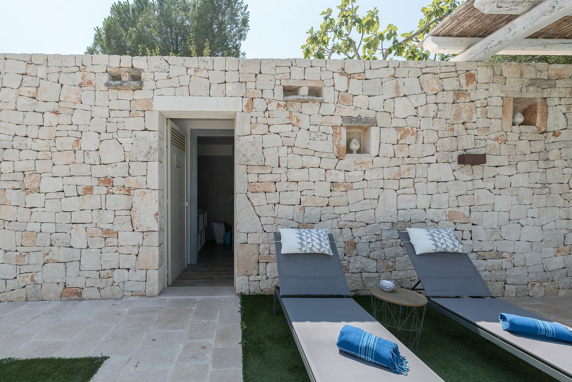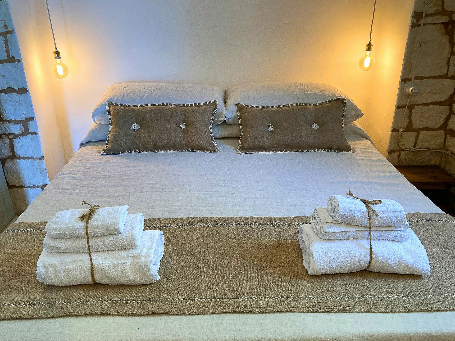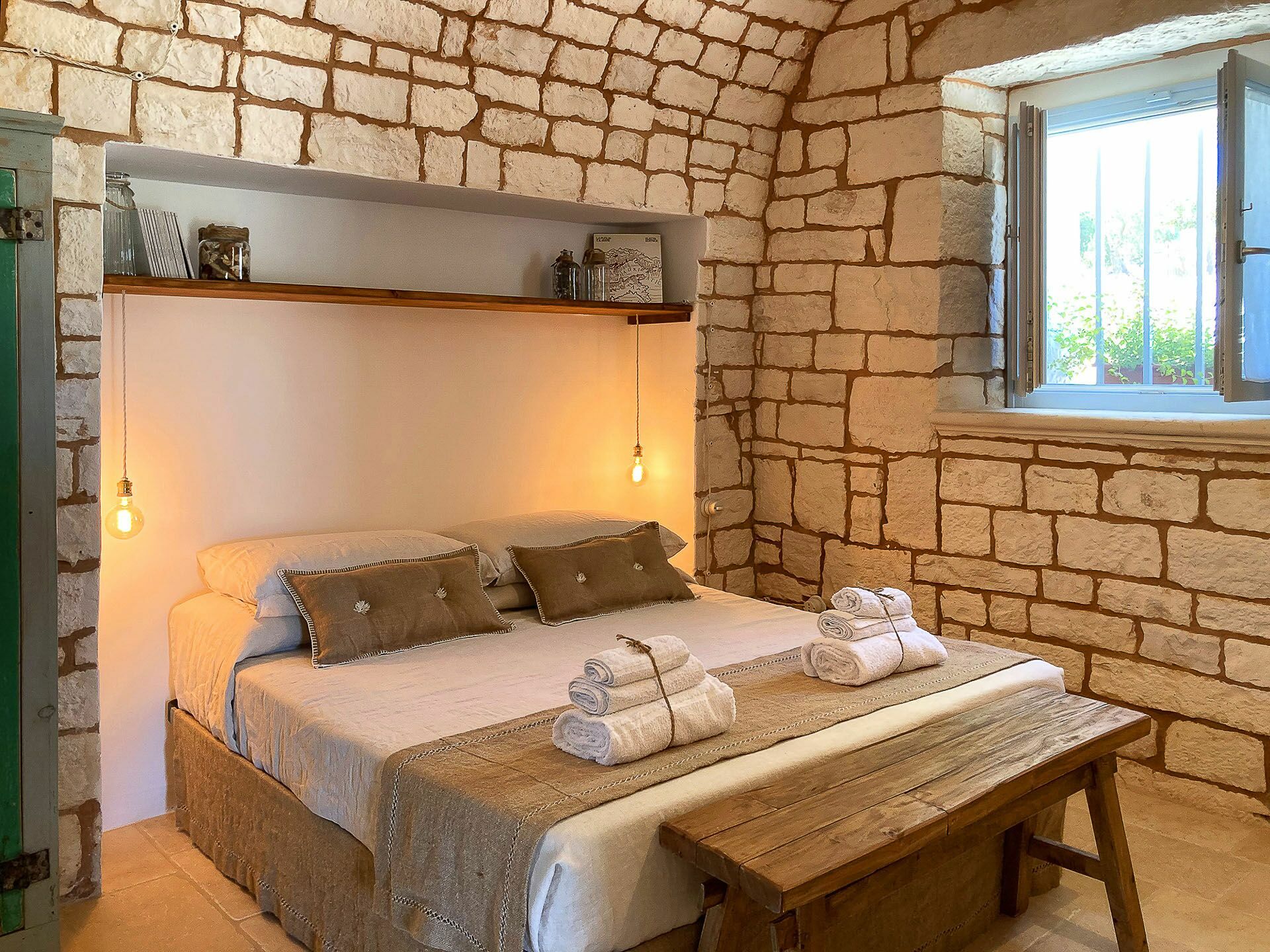 Trullo Oak consists of two very bright double bedrooms and one twin bedroom with windows that allow a view of the surrounding countryside, but what makes them unique are the vaults with exposed stone that give a characteristic, unique and special touch to these environments. There are 5 bathrooms in all, one of which is outside near the pool; the bathrooms consist of WC, bidet, sink and shower.