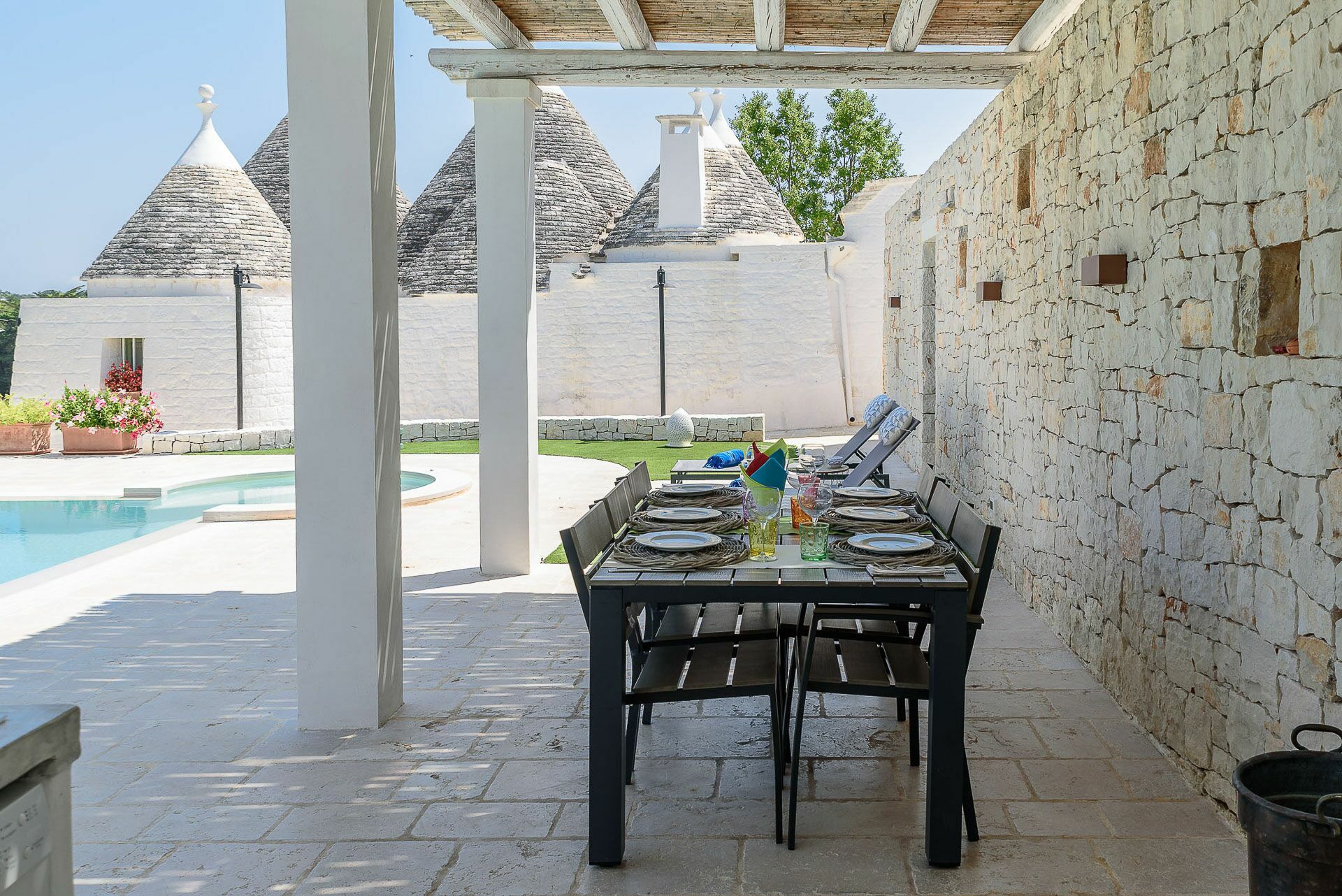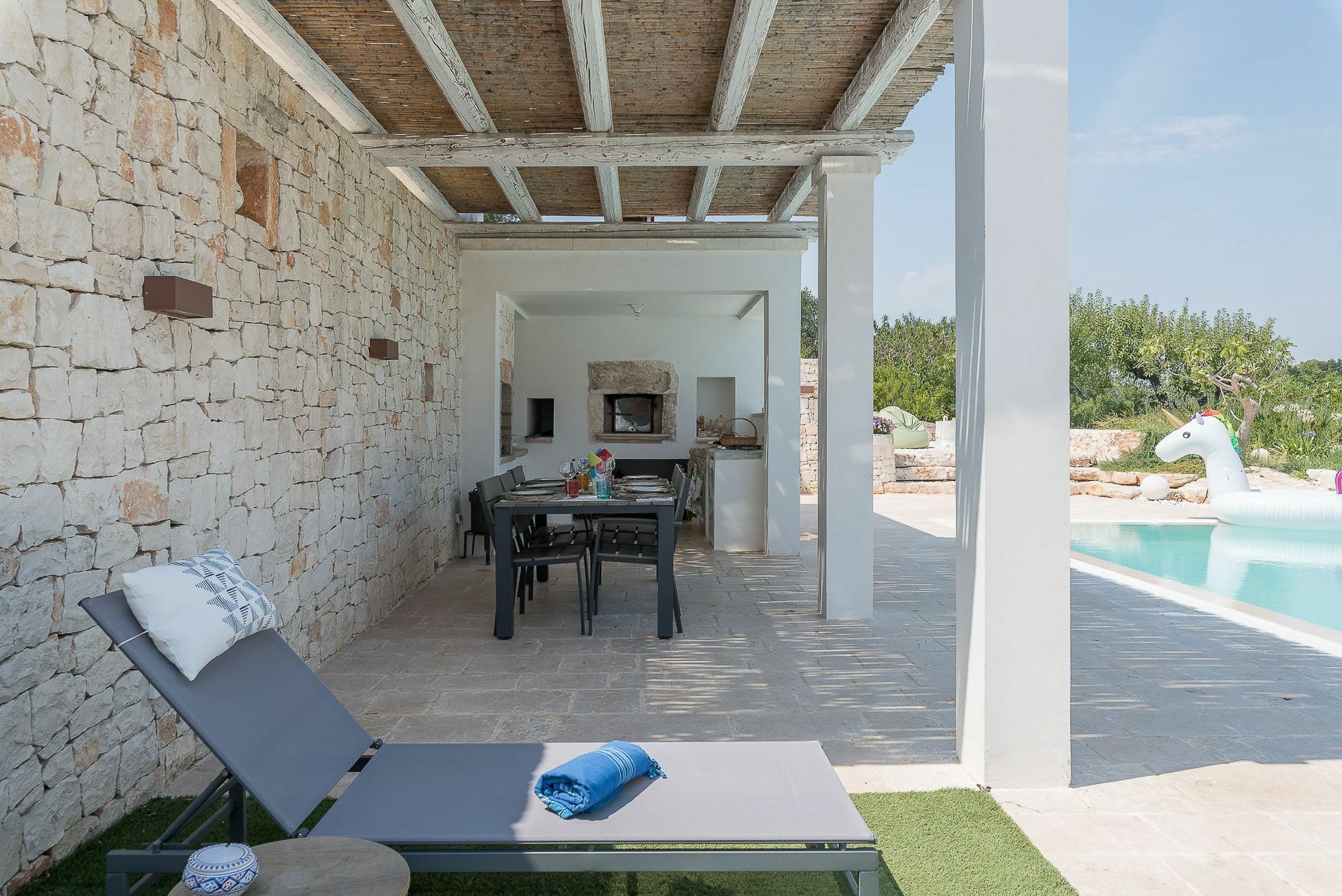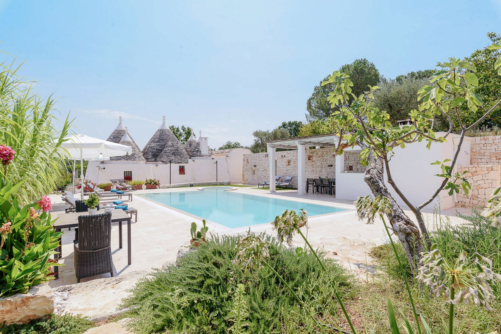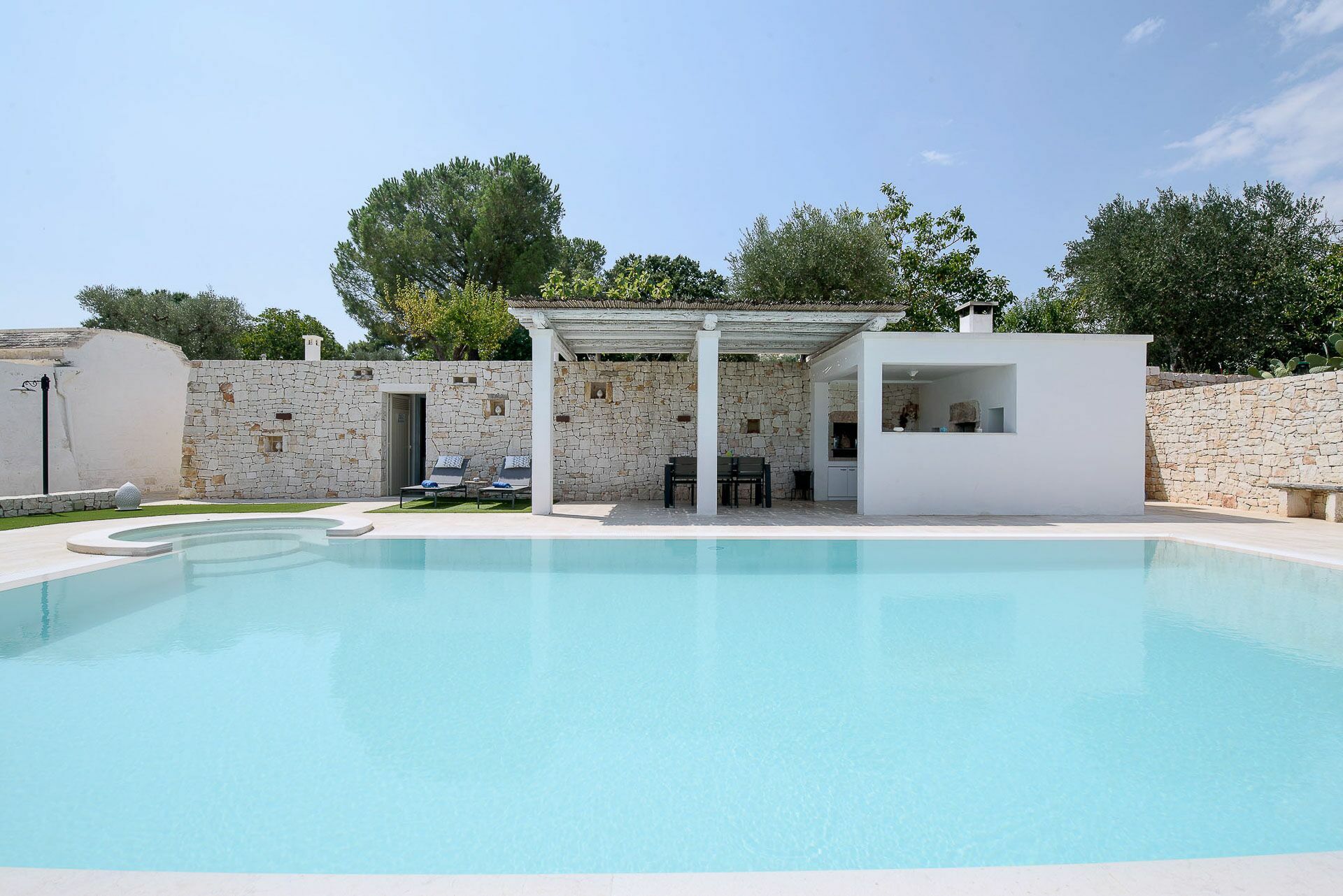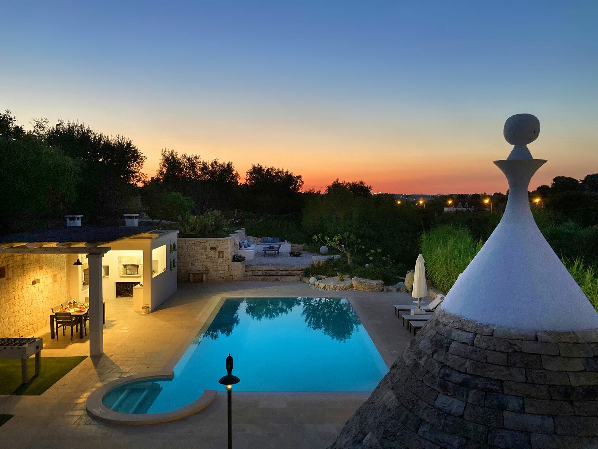 Trullo Oak consists of a very large outdoor area with a spectacular swimming pool, by the pool there are sunbeds where you can lie down to sunbathe and right next to it a splendid pergola / veranda where you can will be able to repair during the hottest hours and maybe sip a glass of wine while contemplating the sunset or have dinner after having prepared a delicious barbecue thanks to the presence of an external BBQ with a support surface where you can delight in the preparation. In addition to this area, there is another outdoor area equipped with table and chairs, from which you have a splendid view of the valley and where it will be wonderful to have breakfast at dawn.