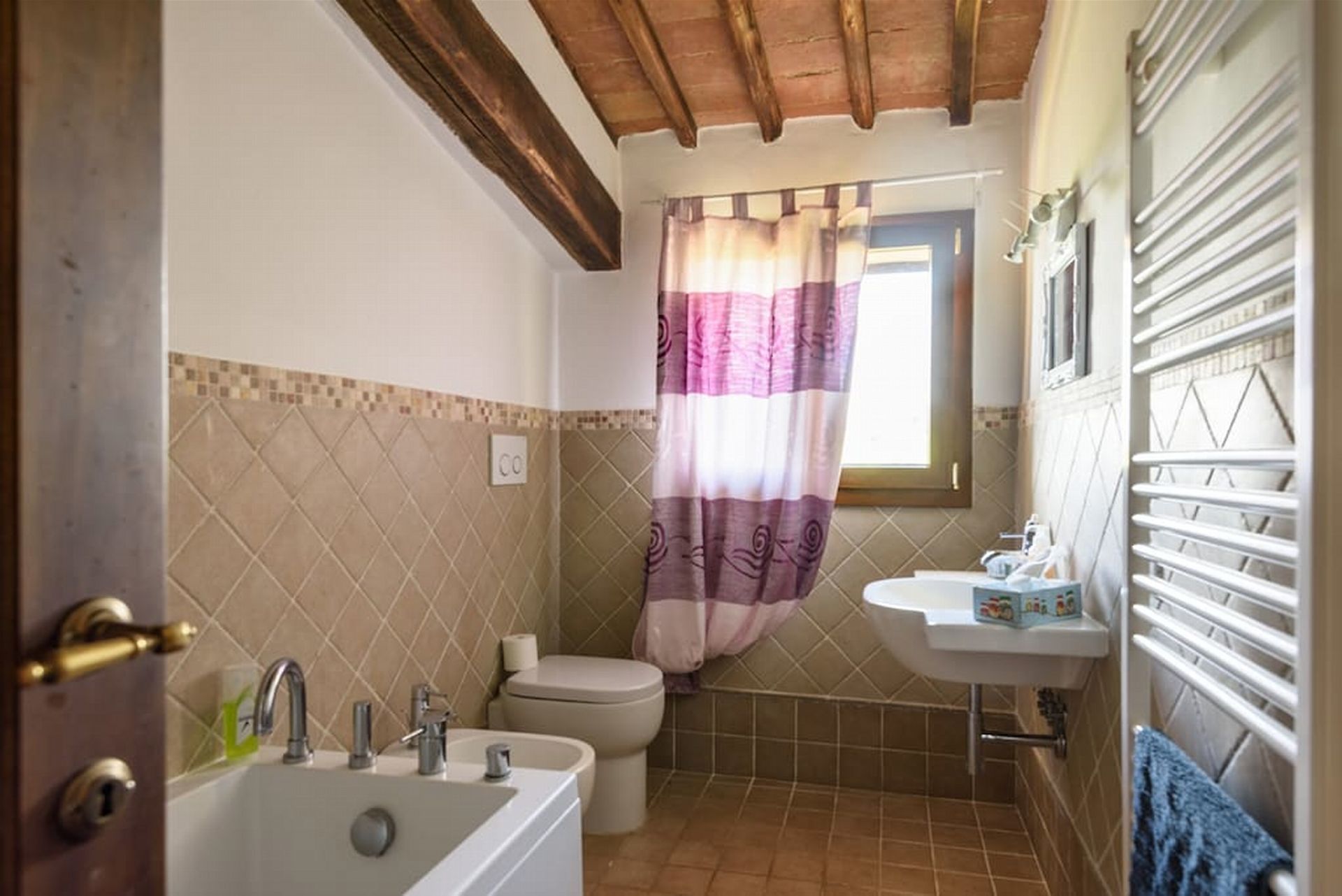 Badeværelse: vask, wc, bidet, bruser, hårtørrer.