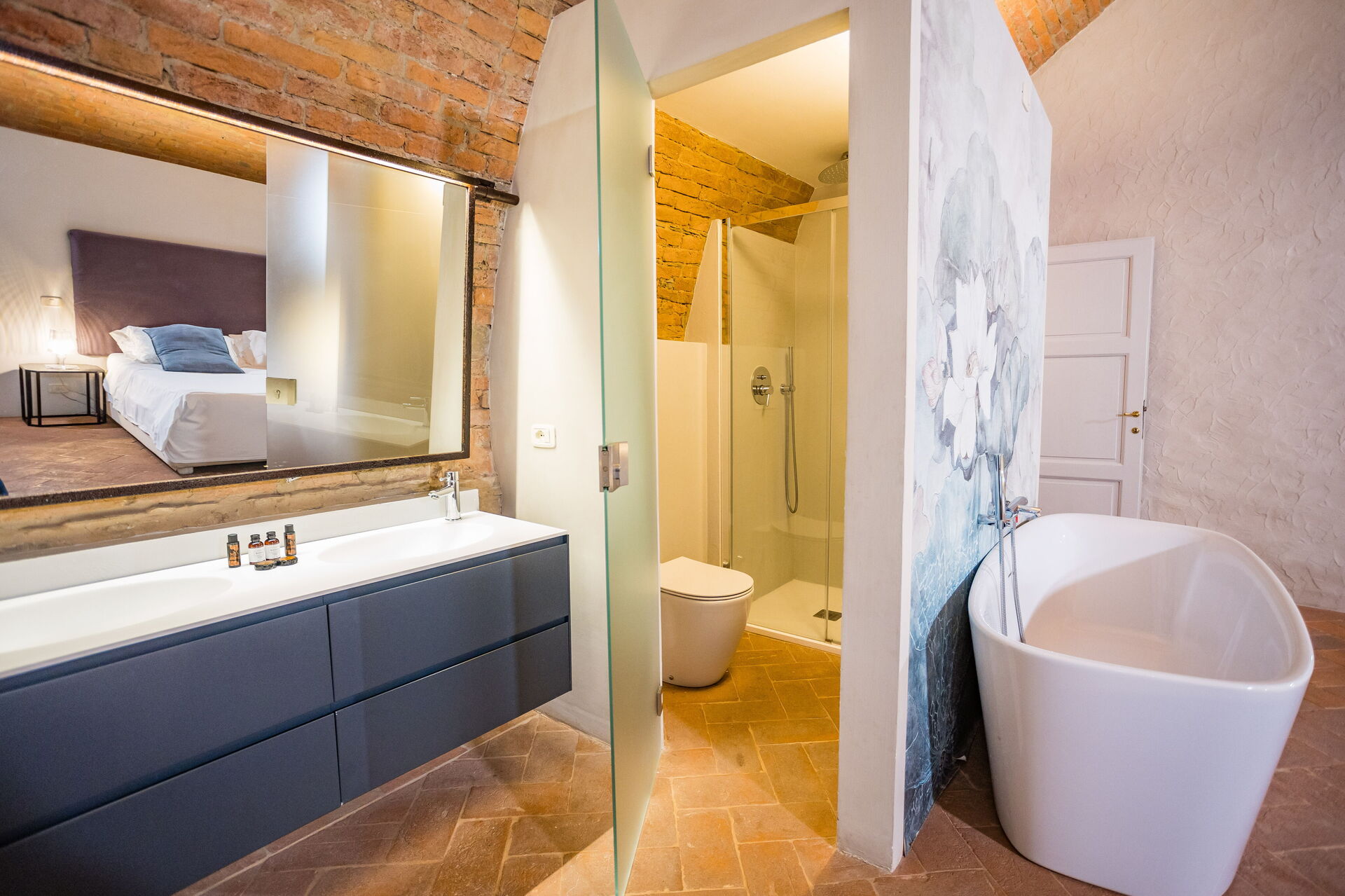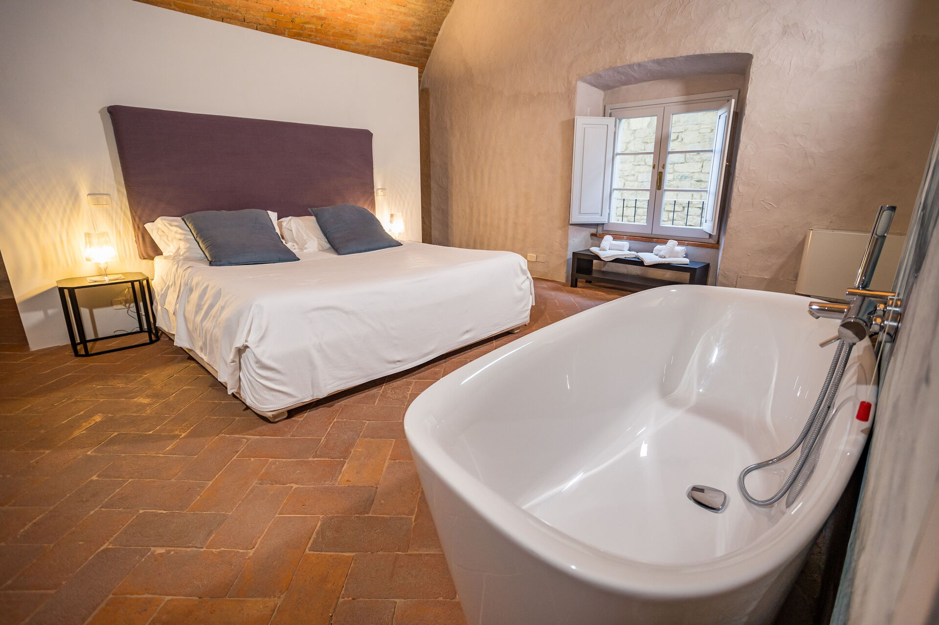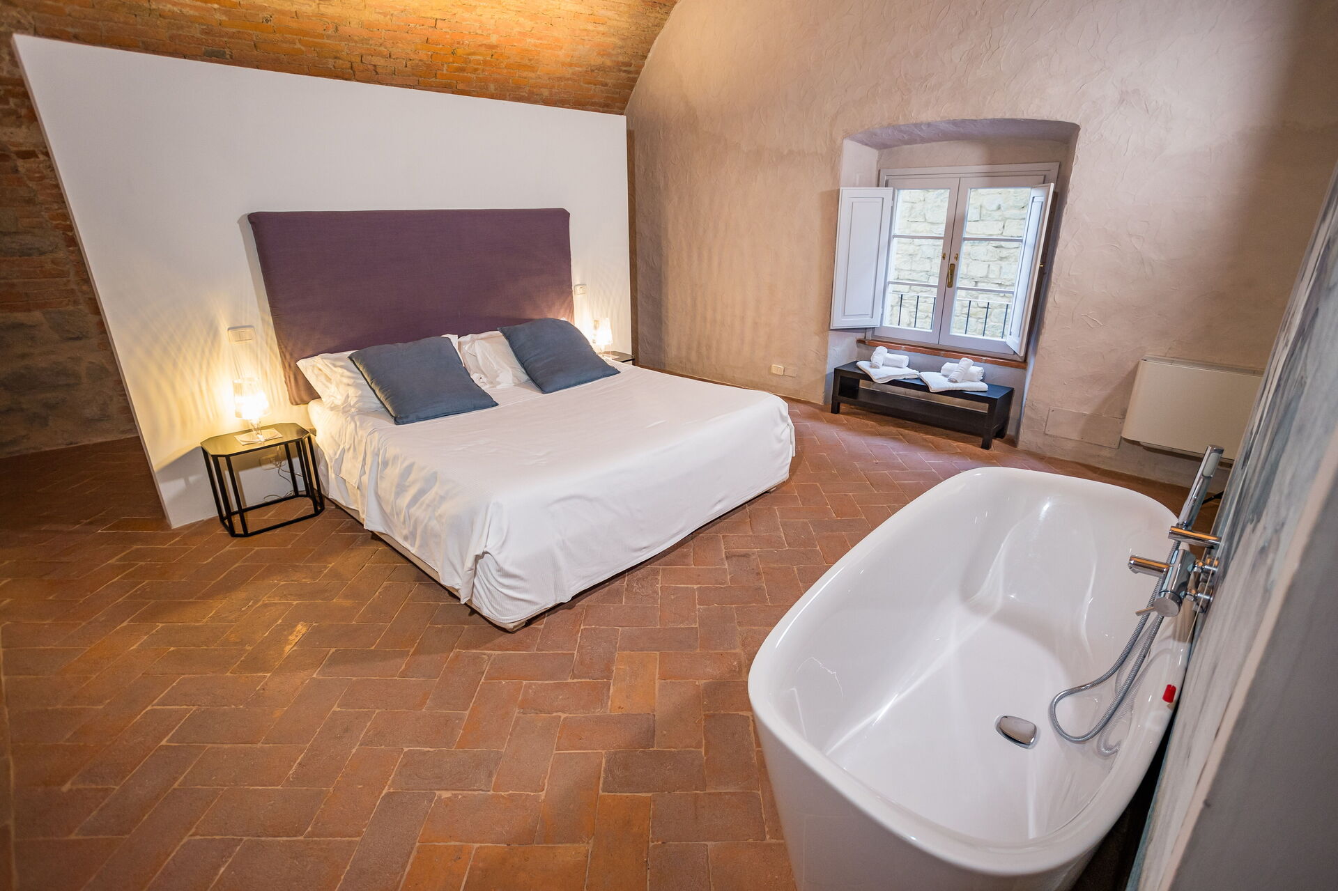 Soveværelse med bad: king size seng, WIFI internet, klimaanlæg, vask, wc, bidet, badekar, bruser, hårtørrer, badeværelse uden vindue.