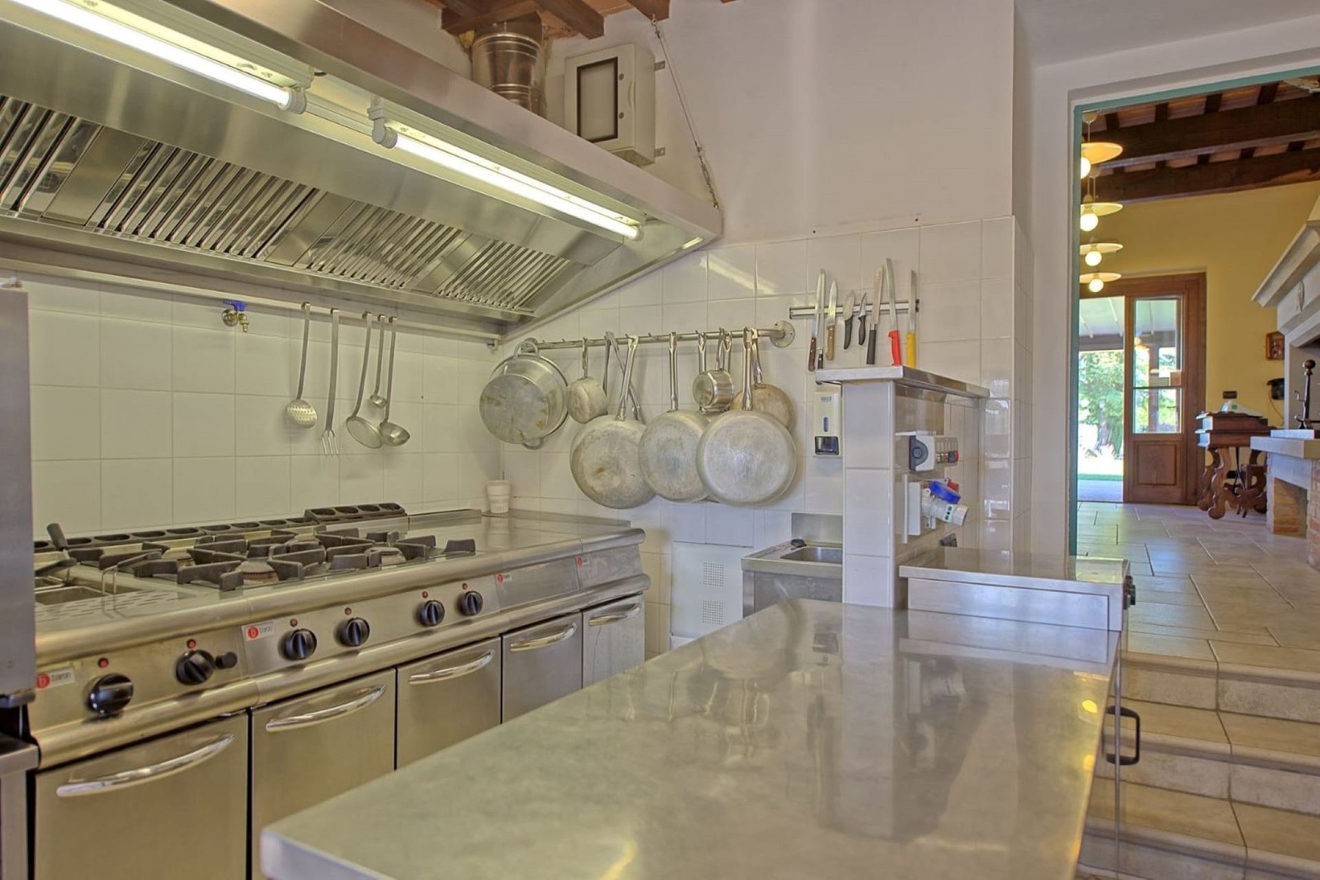 VIGTIGT: Ejendommen er opdelt intern i 3 ikke-kommunikerende lejligheder: 1 (rummer 5 personer) i stueetagen og 2 (rummer 4 og 6 personer) ovenpå. I stueetagen er der også et stort rum til brug for gæsterne, som er i 2 etager med stor pejs, borde og stole, toilet og 3 trin længere nede er: et stort professionelt køkken med ovn, fryser, komfur og opvaskemaskine.