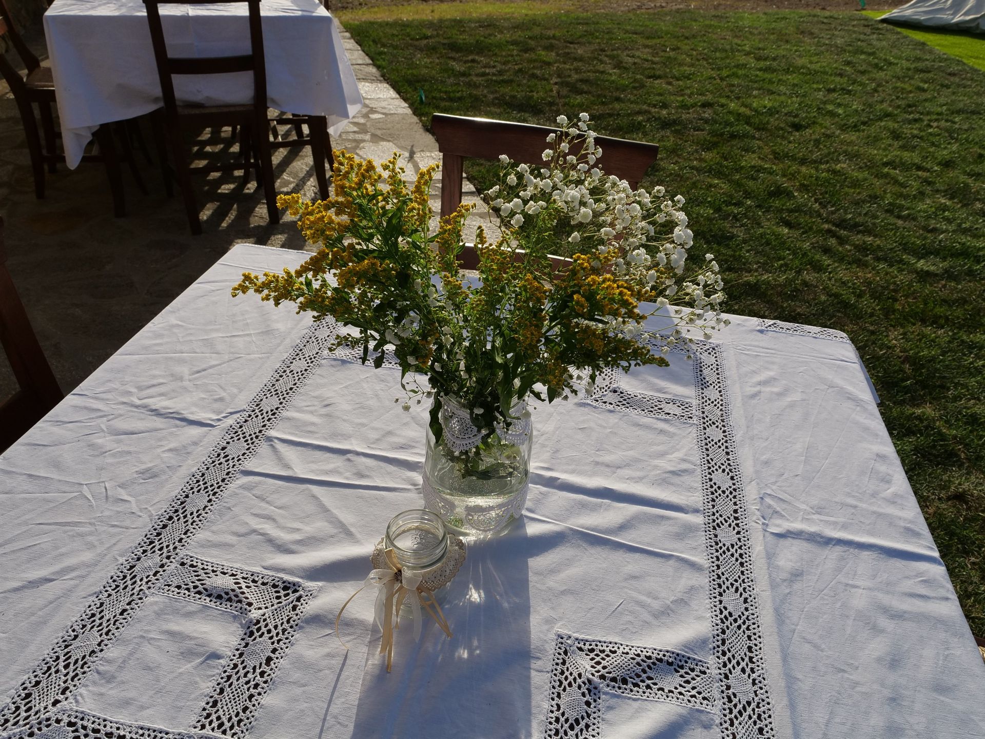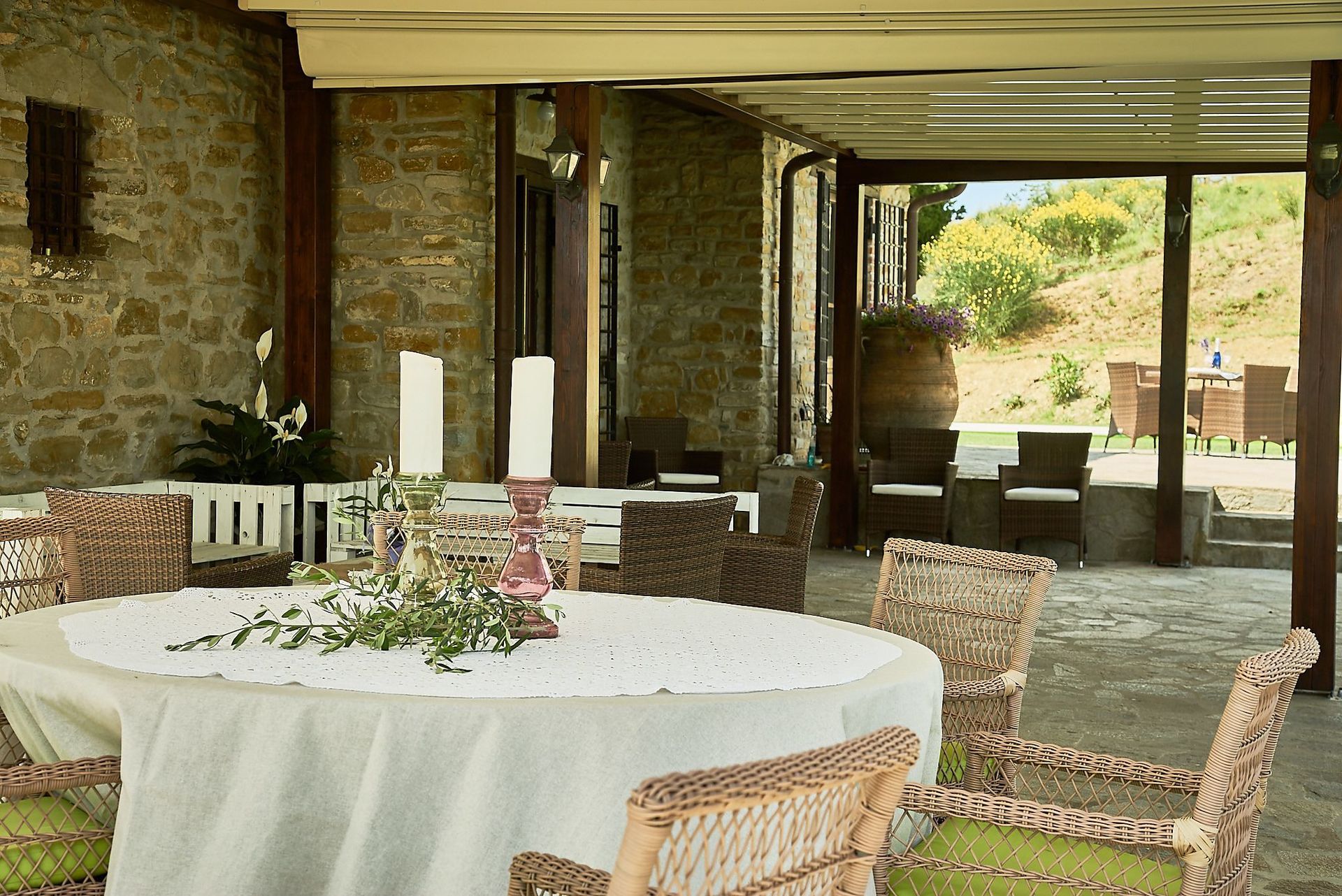 Terrasse 1: udendørs spiseplads, to spiseborde (personer: 15), terrassemøbel.