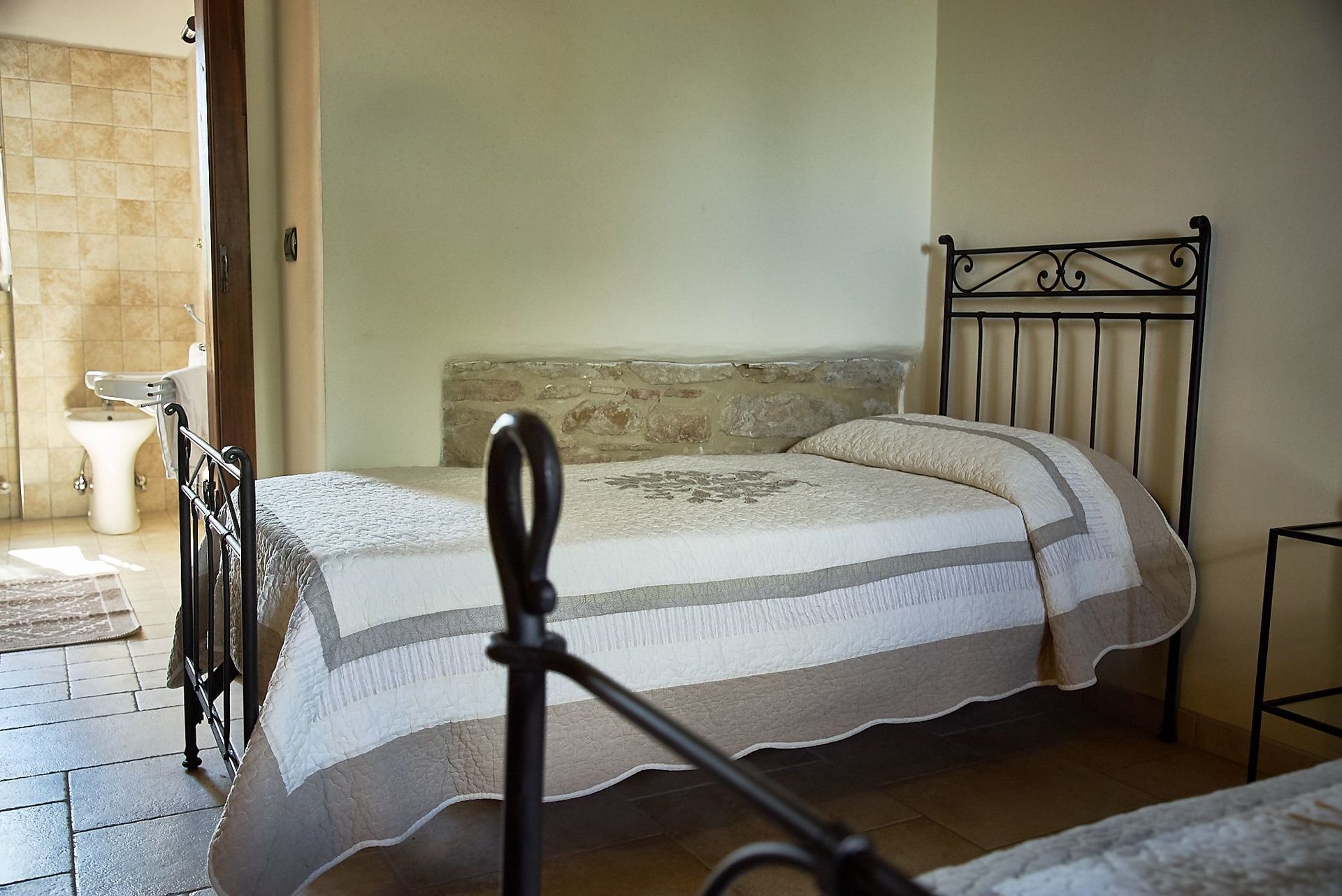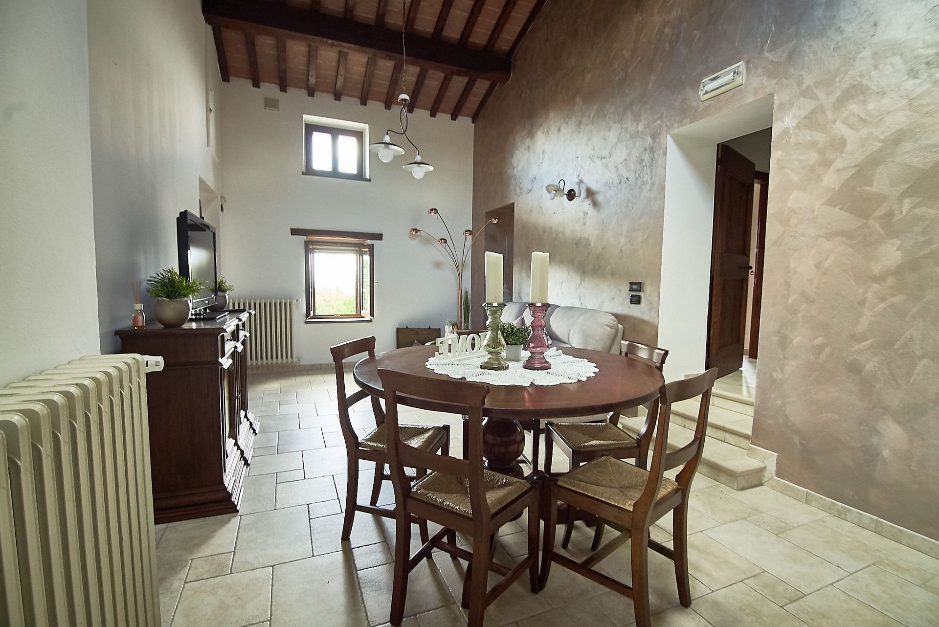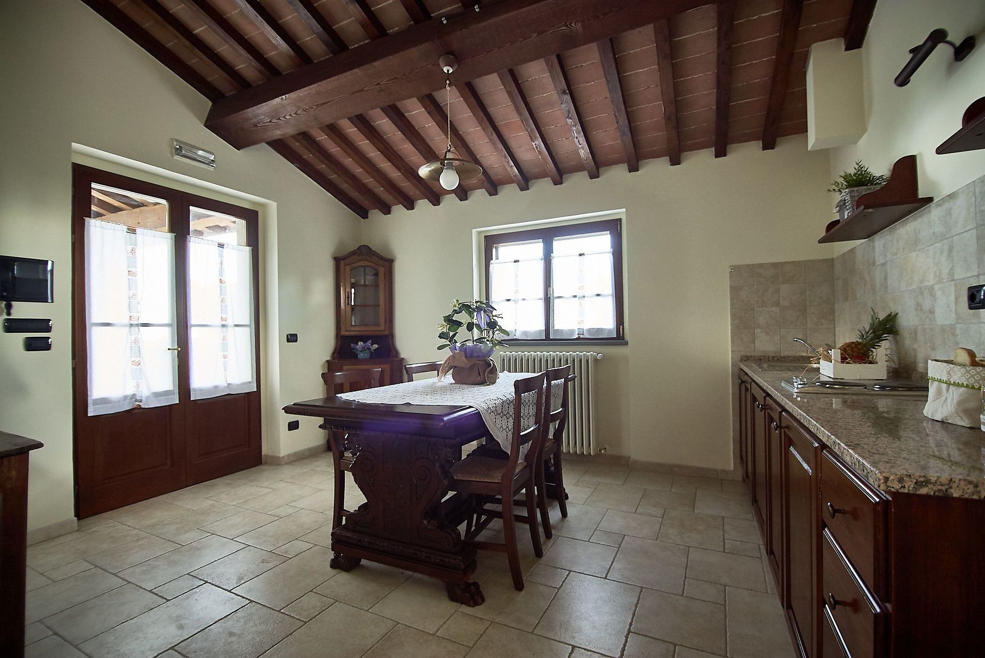 Denne smukke gård er internt opdelt i 3 ikke-kommunikerende lejligheder: 1 (rummer 5 personer) i stueetagen og 2 (rummer 4 og 6 personer) ovenpå. I stueetagen er der også et stort rum til brug for gæsterne, som er i 2 etager med stor pejs, borde og stole, toilet og 3 trin længere nede er: et stort professionelt køkken med ovn, fryser, komfur og opvaskemaskine.