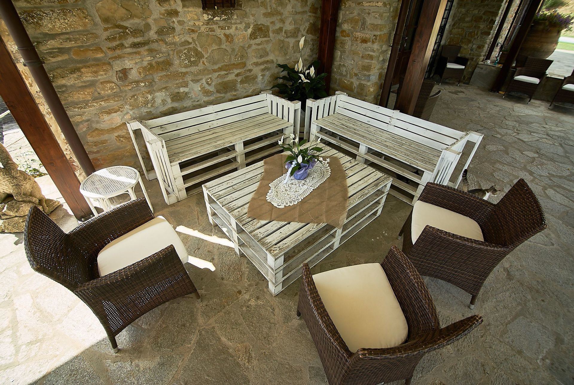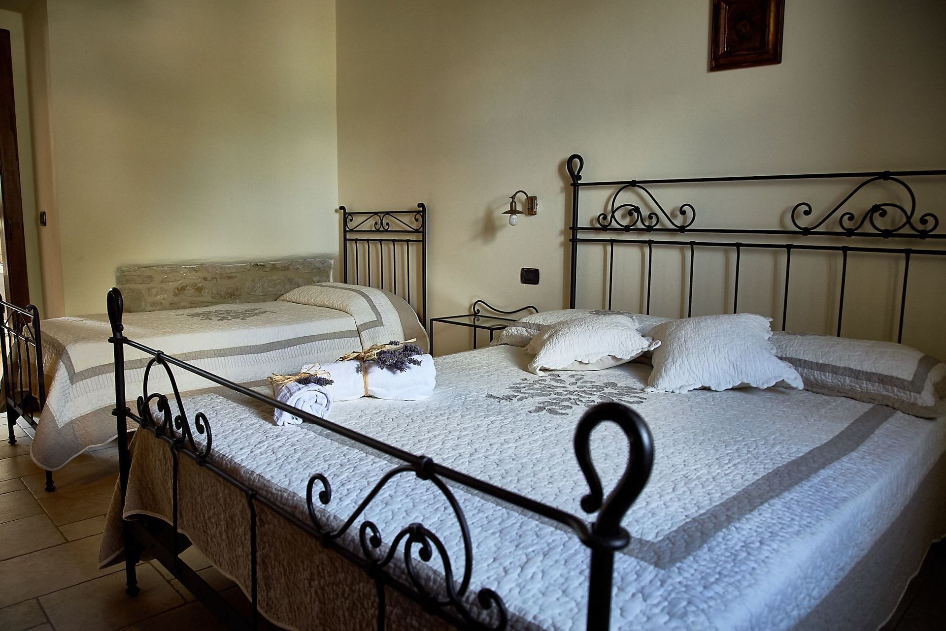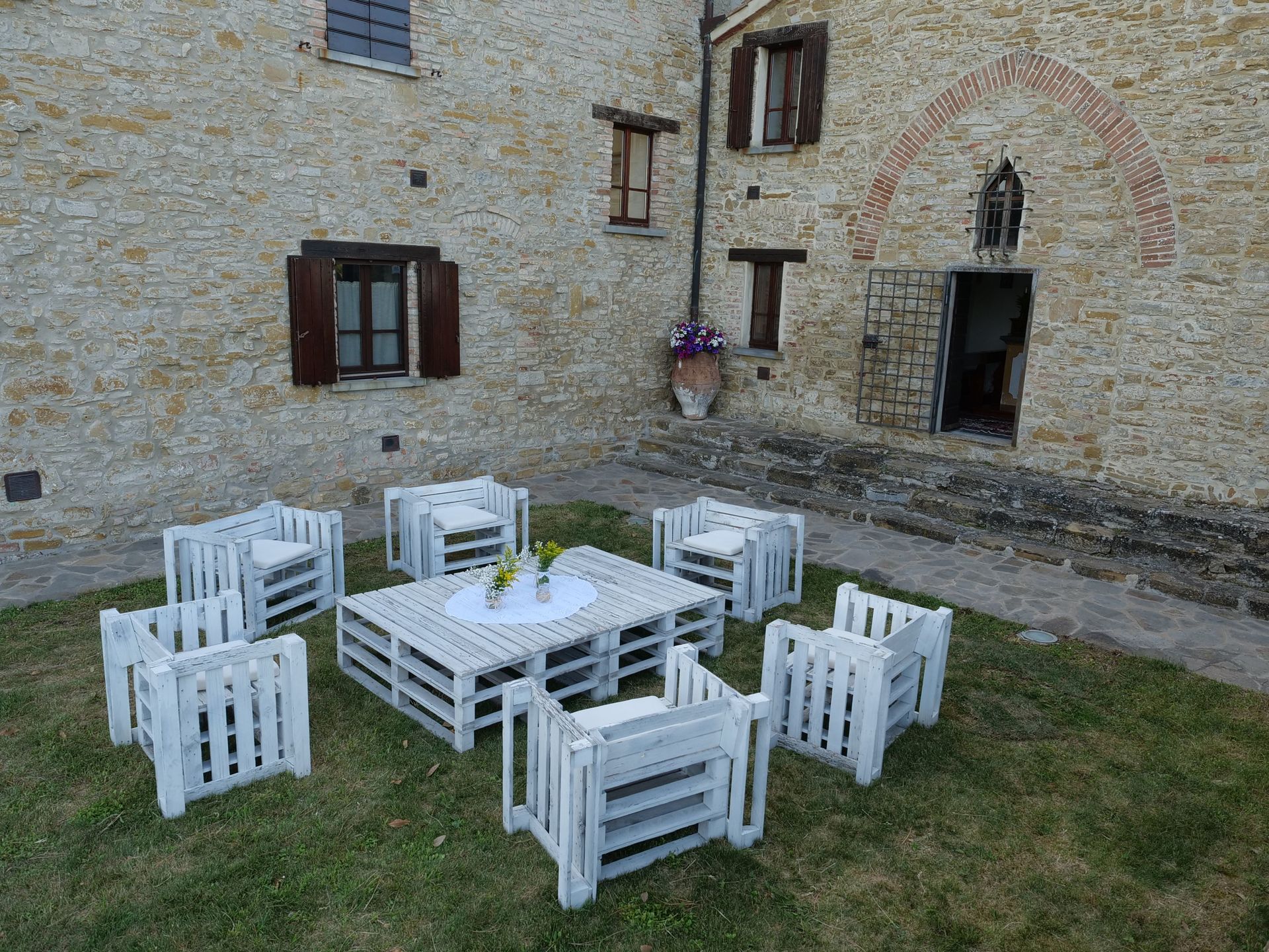 Denne smukke gård er internt opdelt i 3 ikke-kommunikerende lejligheder: 1 (rummer 5 personer) i stueetagen og 2 (rummer 4 og 6 personer) ovenpå. I stueetagen er der også et stort rum til brug for gæsterne, som er i 2 etager med stor pejs, borde og stole, toilet og 3 trin længere nede er: et stort professionelt køkken med ovn, fryser, komfur og opvaskemaskine.