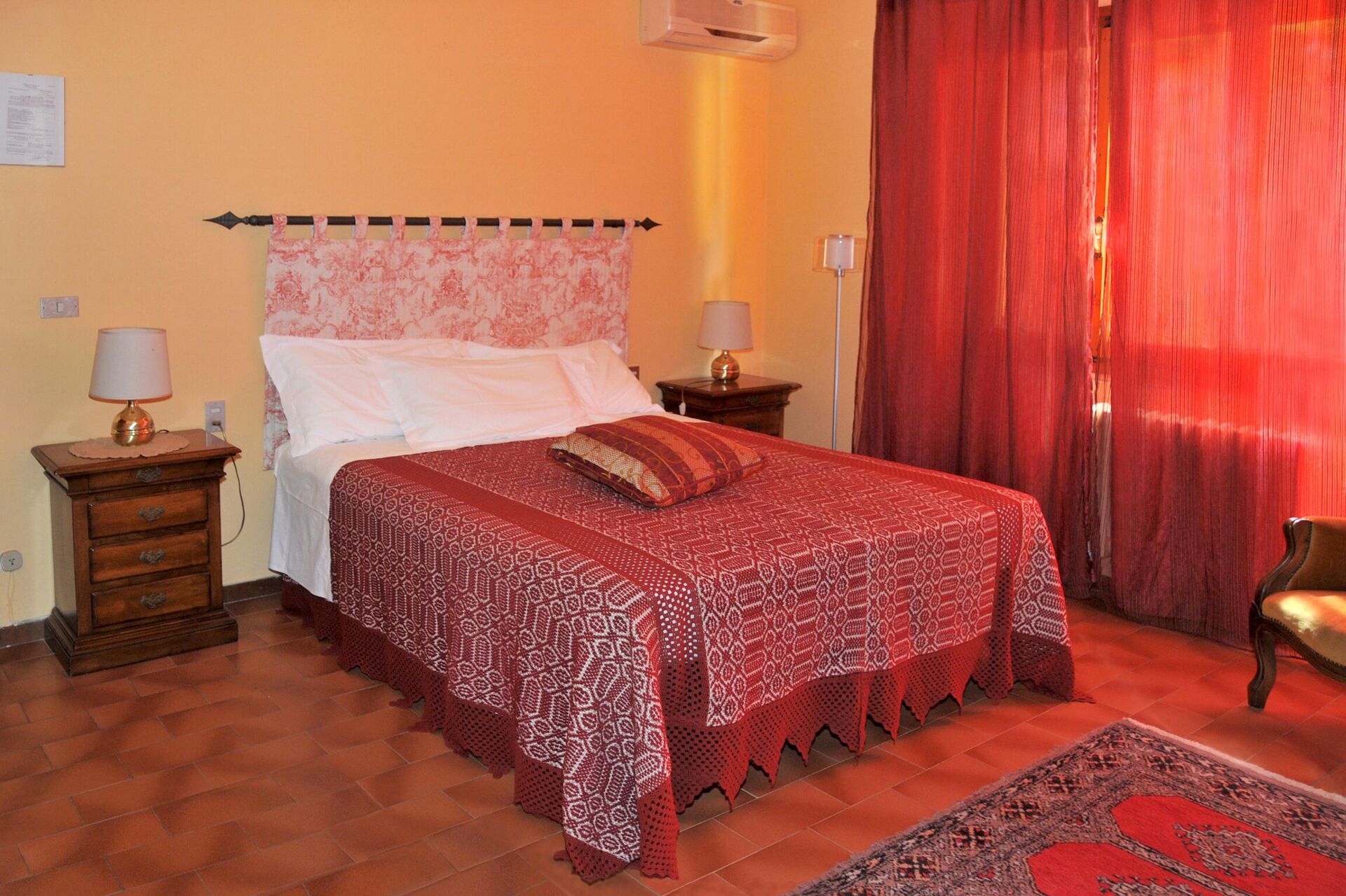 Soveværelse med bad: dobbeltseng, klimaanlæg, wc, bidet, bruser.