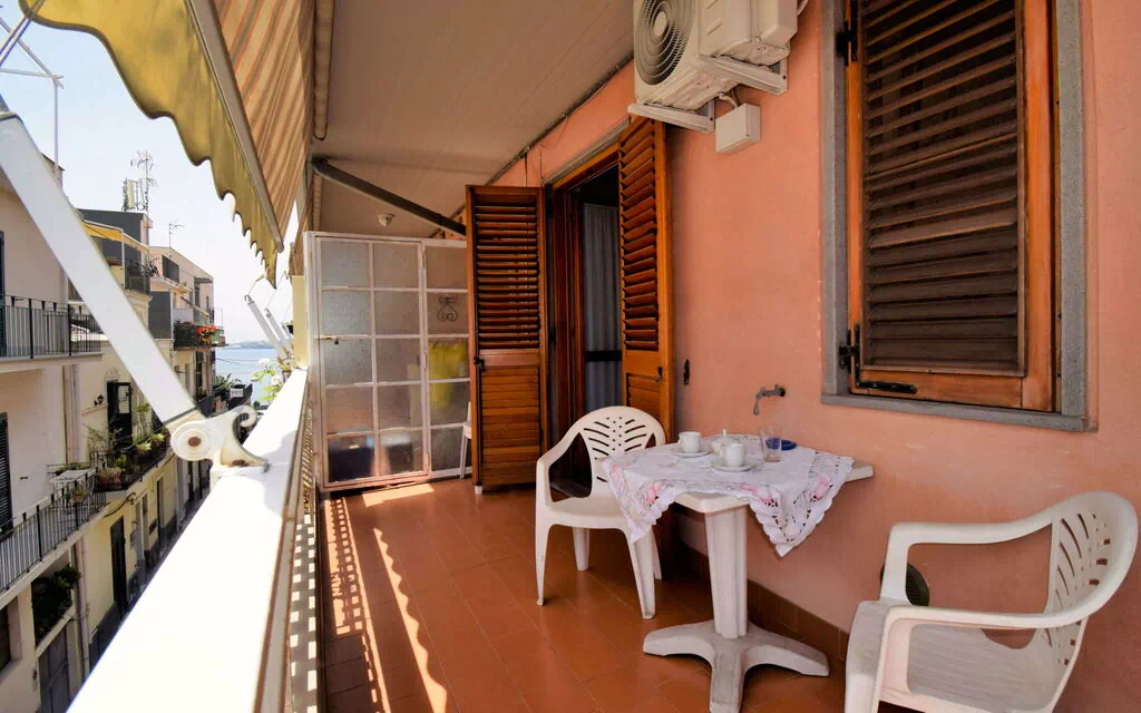 1-værelse-lejlighed 40 m2 i 2. etage. Enkelt og hensigtsmæssig indrettet: stue/soveværelse med 1 fransk seng (140 cm), sat-TV (fladskærms TV), klimaanlæg, ventilator og varmluft opvarming. Udgang til terrasse. Kogeniche (4 kogeplader, miniovn, Brødrister, kedel, mikroovn, fryser) med spisebord. Brus/bidet/WC. Opvarming (ekstra), klimaanlæg, varmluftsopvarming (ekstra), vandkoger (50 liter). Opvarme kun tilgængelig fra 01.12. til 31.03. Terrasse 10 m2, overdækket. Altanmøbler. Indskrænkede udsigt over havet. Til benyttelse: vaskemaskine, strygejern hårtørrer. Internet (trådløs LAN [WLAN], gratis). Parkeringsplads (ekstra, overdækket). Bemærk venligst: brandalarm, brandslukker, ingen elevator. IT087002C2L99FRSI8