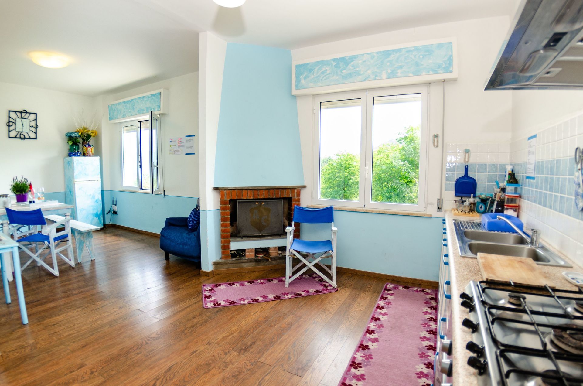 Køkken: spisebord (personer: 10), køleskab, fryser, kogeplader, ovn, kamin, tv.