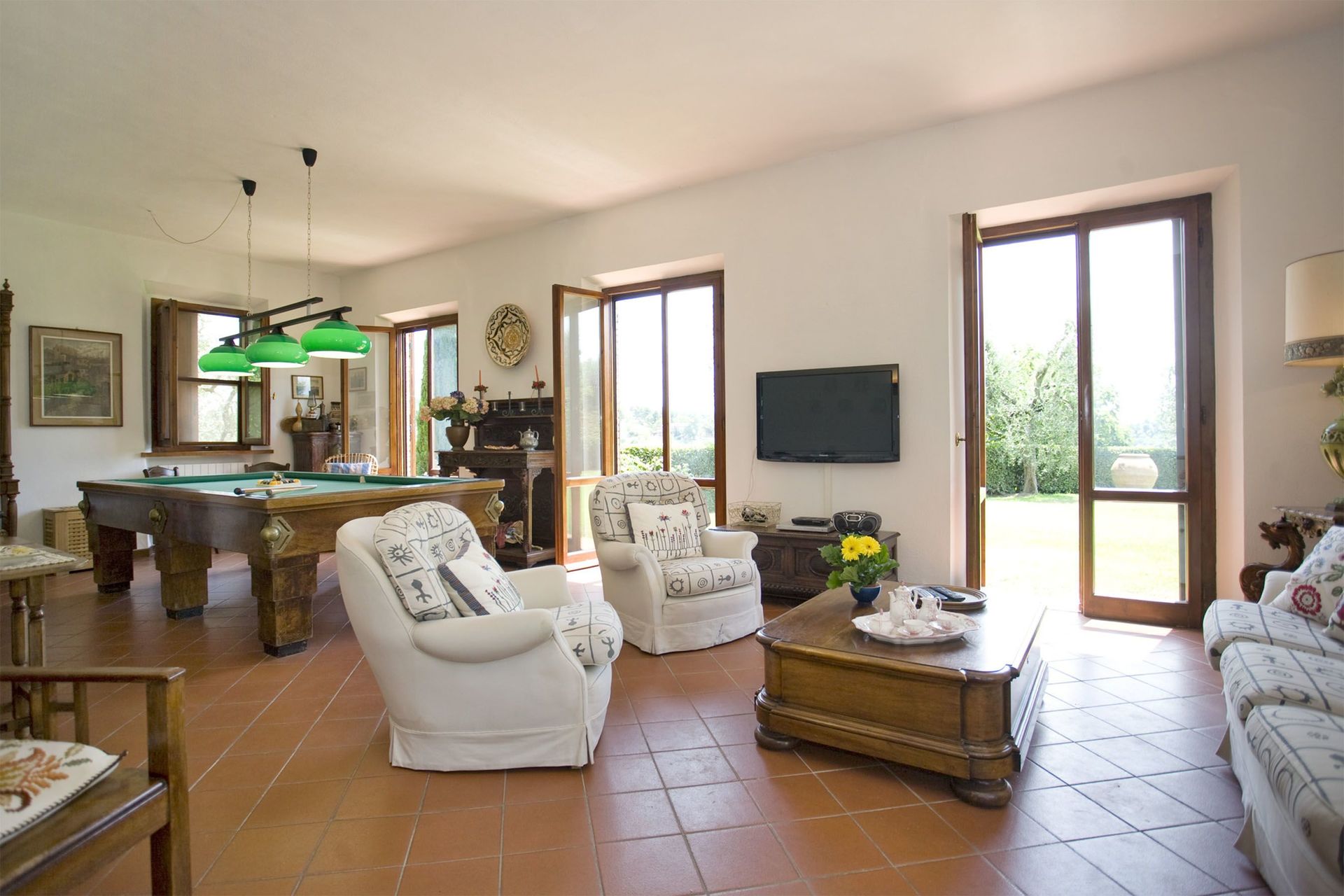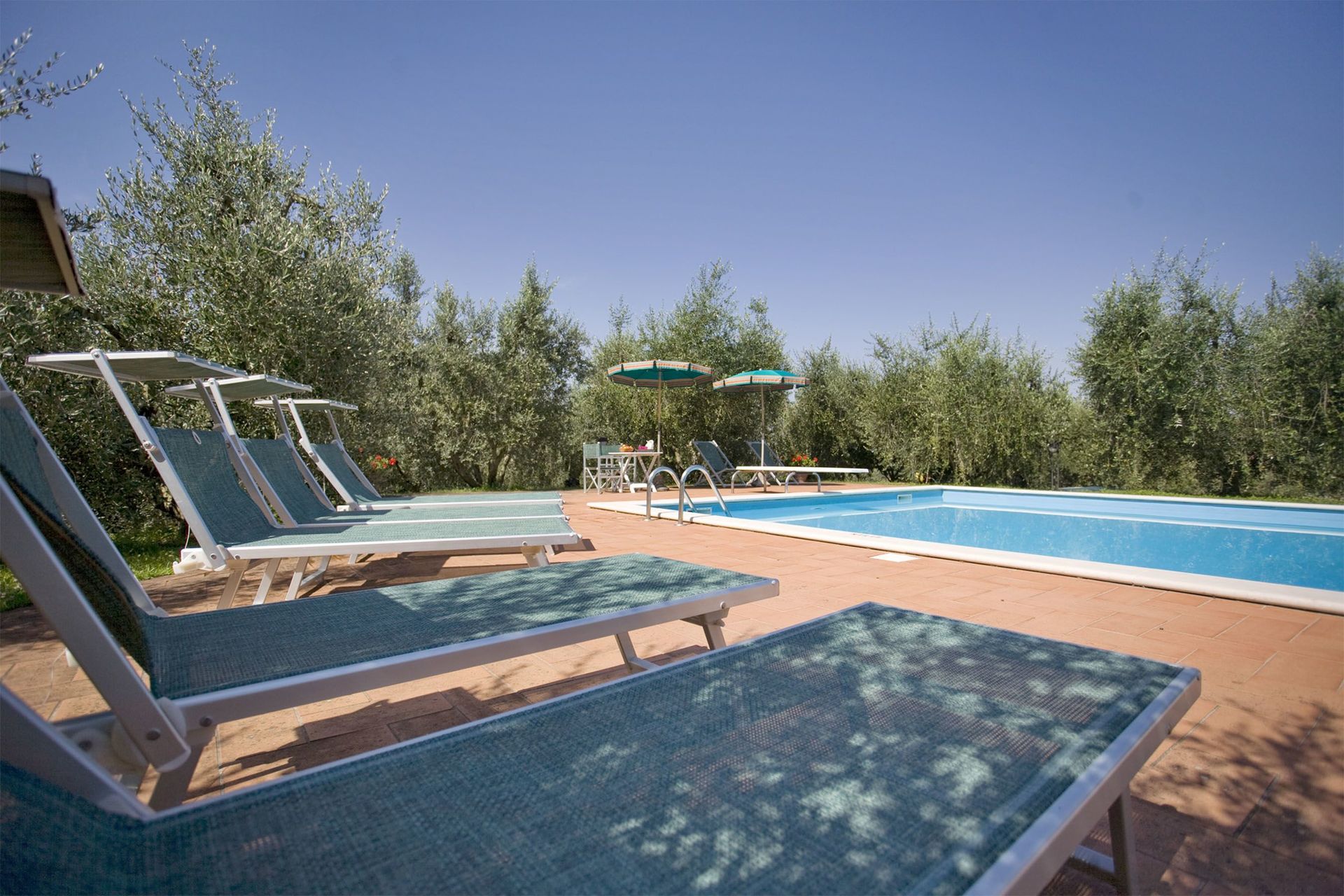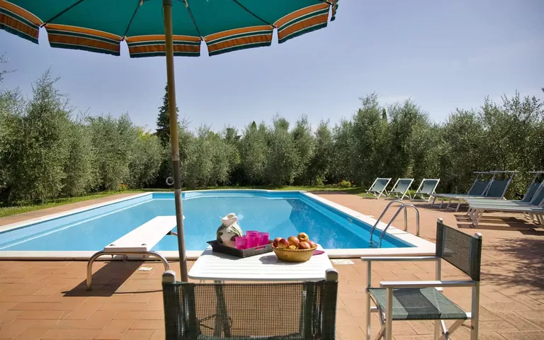 Denne smukke ejendom ligger roligt og i gåafstand fra landsbyen Palaia fra det 12. århundrede og har en smuk udsigt over de omkringliggende olivenlunde, vinmarker og middelalderlige landsbyer. De udendørs boligarealer og den indhegnede have er særlig velholdt og gør ejendommen ideel til familier med børn. På den ene side af huset er der en overdækket loggia, møbleret til udendørs spisning. Der er en anden udendørs spiseplads med indbygget grill/ ovn, så gæsterne kan spise i det toskanske solskin.