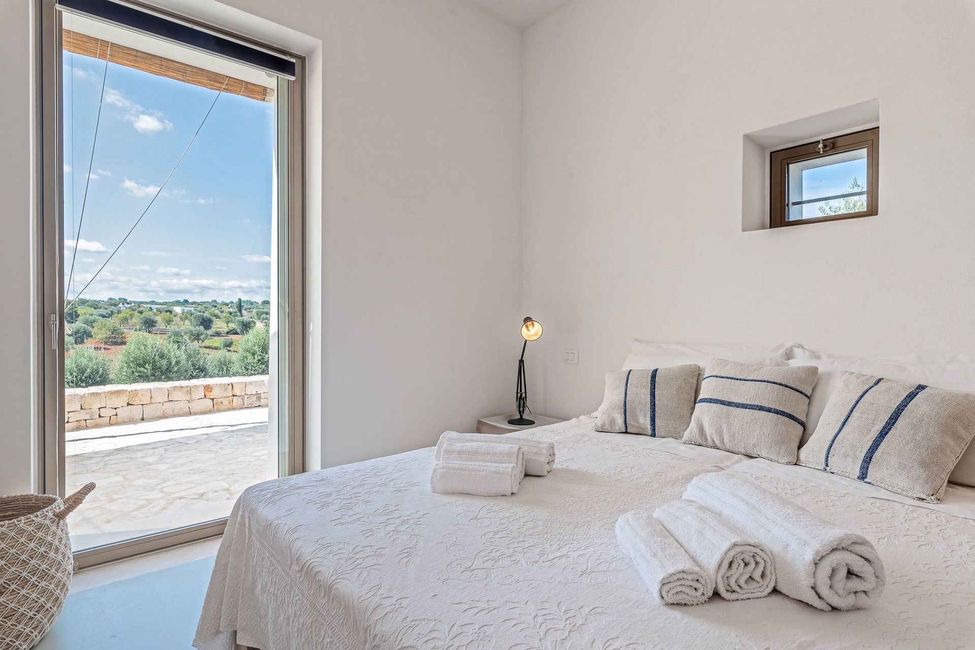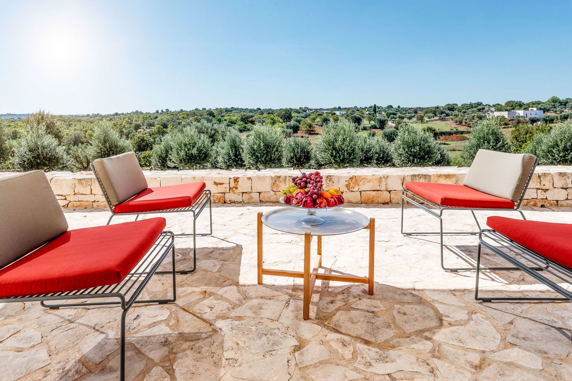 The villa for rent, is immersed in the countryside of Valle d'Itria, one of the most popular and attractive areas of central Puglia. A terraced hilly plateau, rich in woodlands, pastures and game. Famous for the presence of the characteristic and unique Trulli, rural buildings, with numerous dry stone walls and ancient and centuries-old olive trees. The area is also characterized by historical centers, with alleys and narrow streets paved with the typical "Chianche", from houses whitewashed to churches and monuments from various eras.