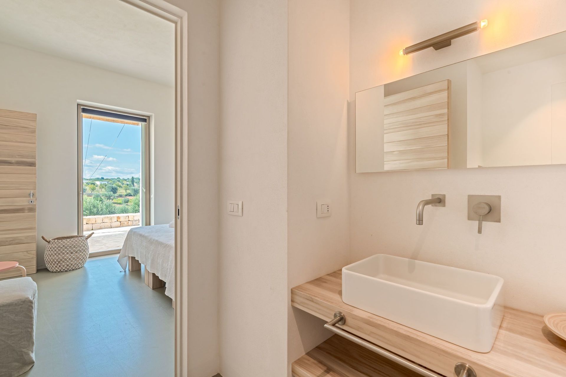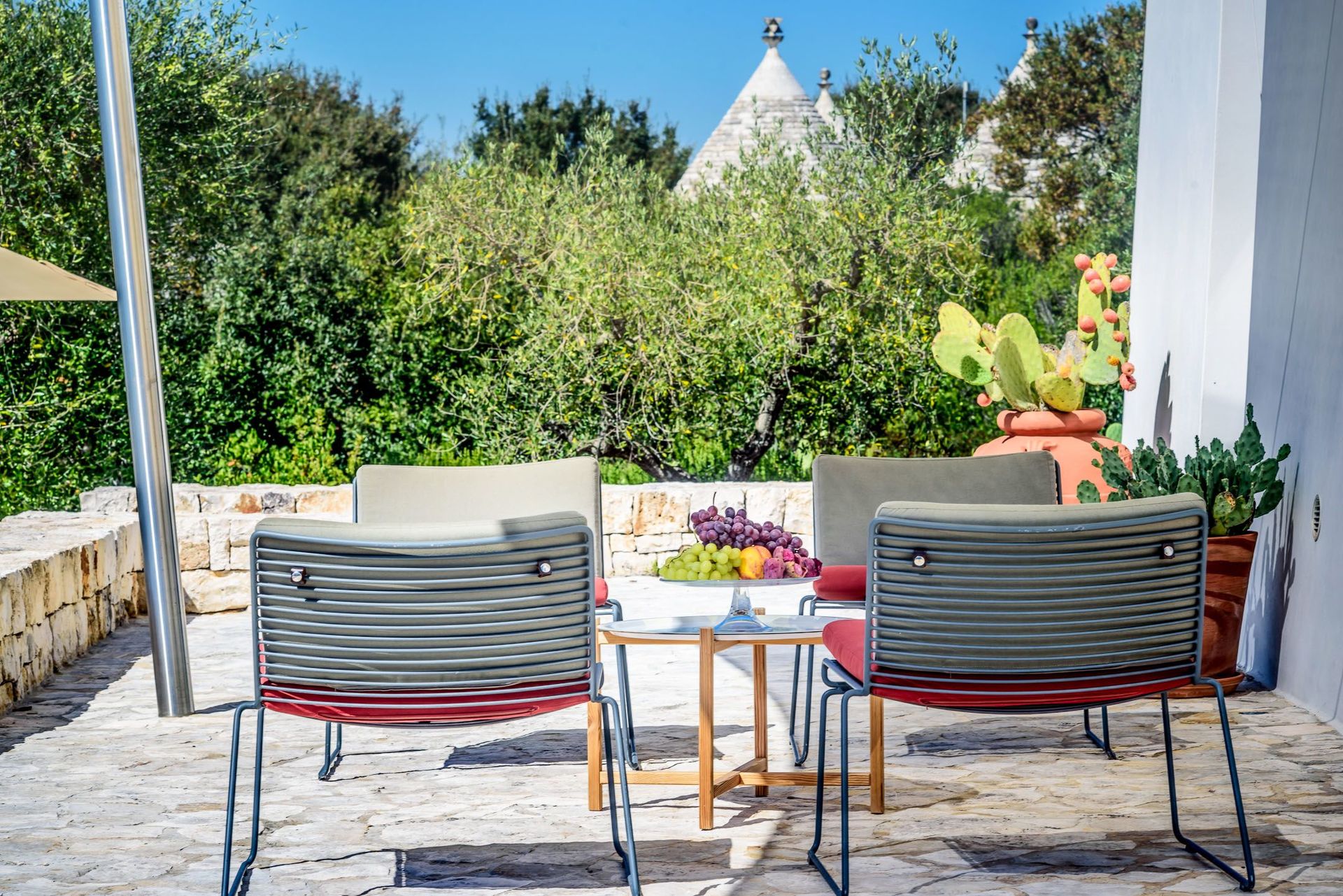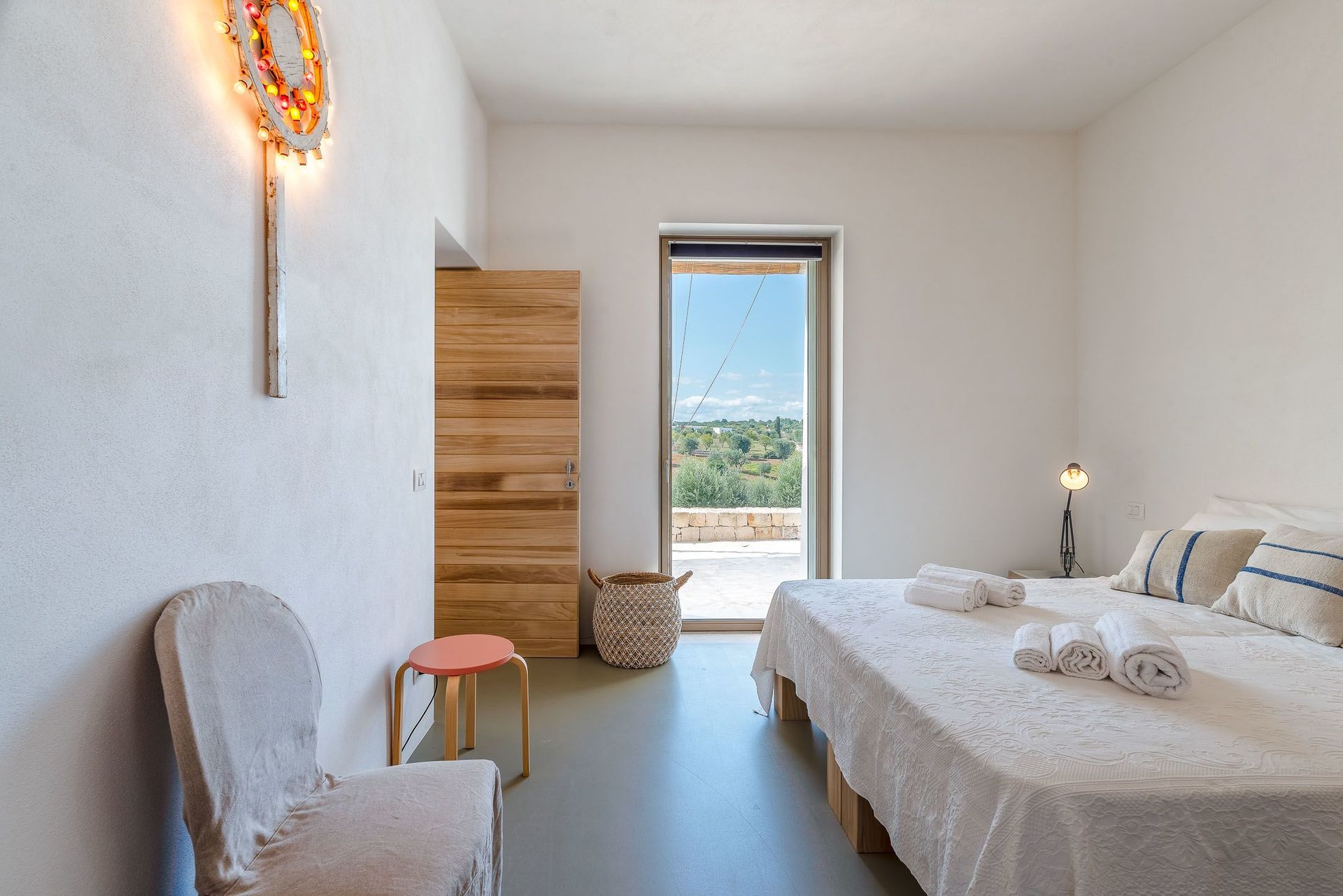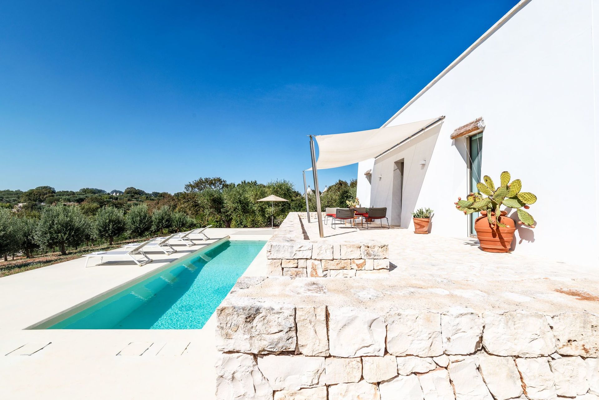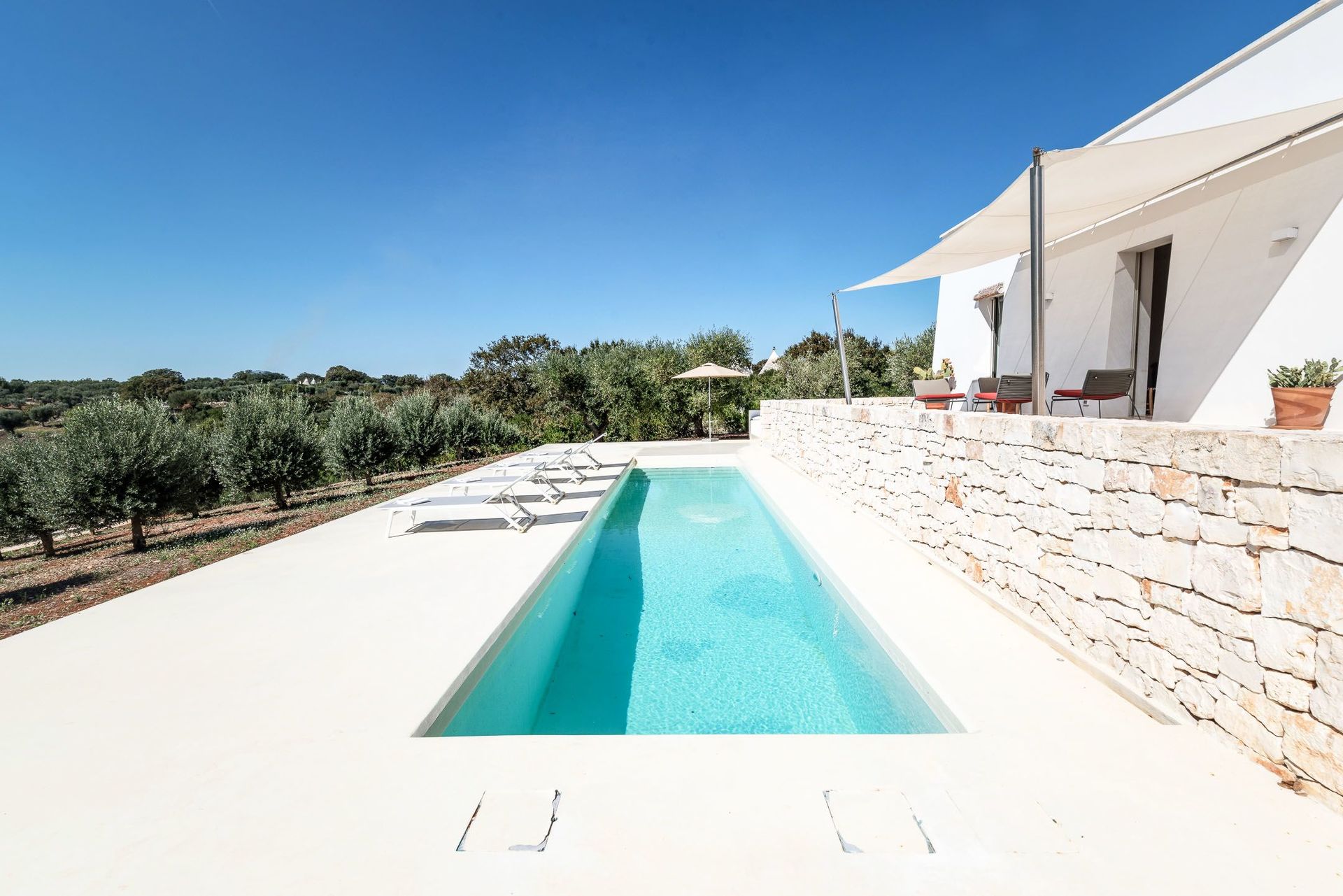 The view of the dwarf olive trees and the swimming pool for the exclusive and private use of the guests is characteristic.