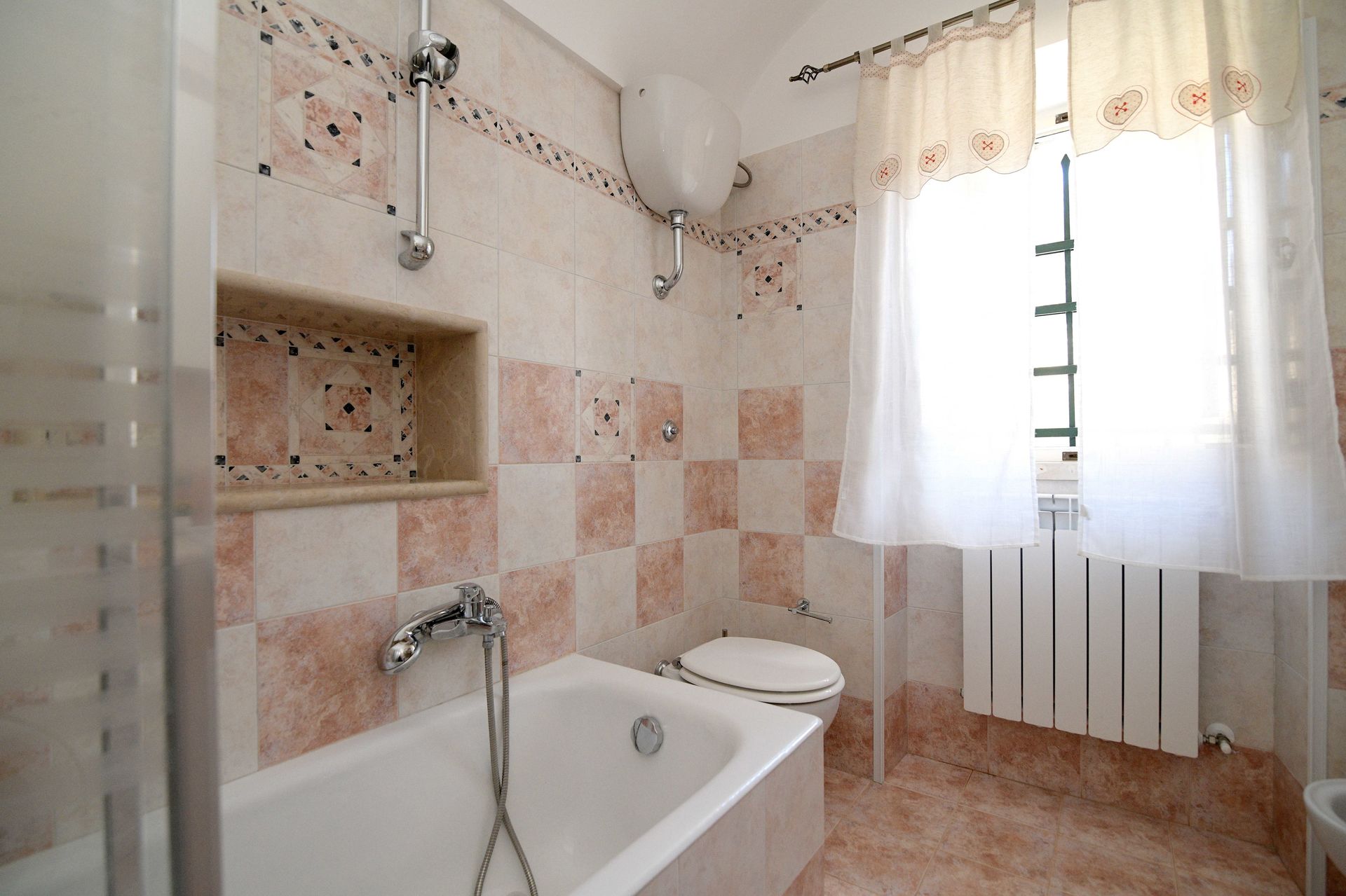 Badeværelse: vask, wc, bidet, badekar, hårtørrer, myggenet.