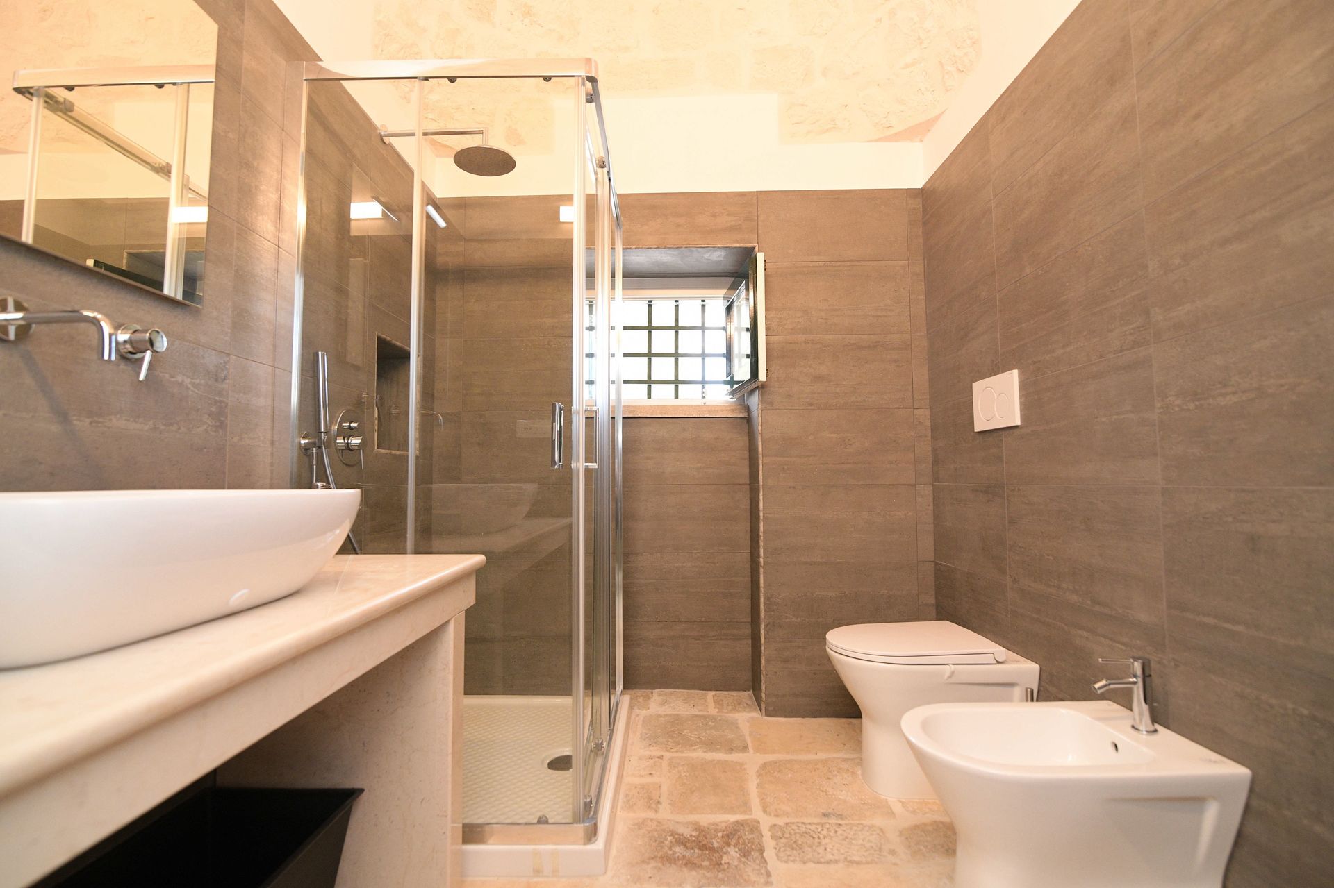 Badeværelse 1: vask, wc, bidet, bruser, hårtørrer, myggenet.