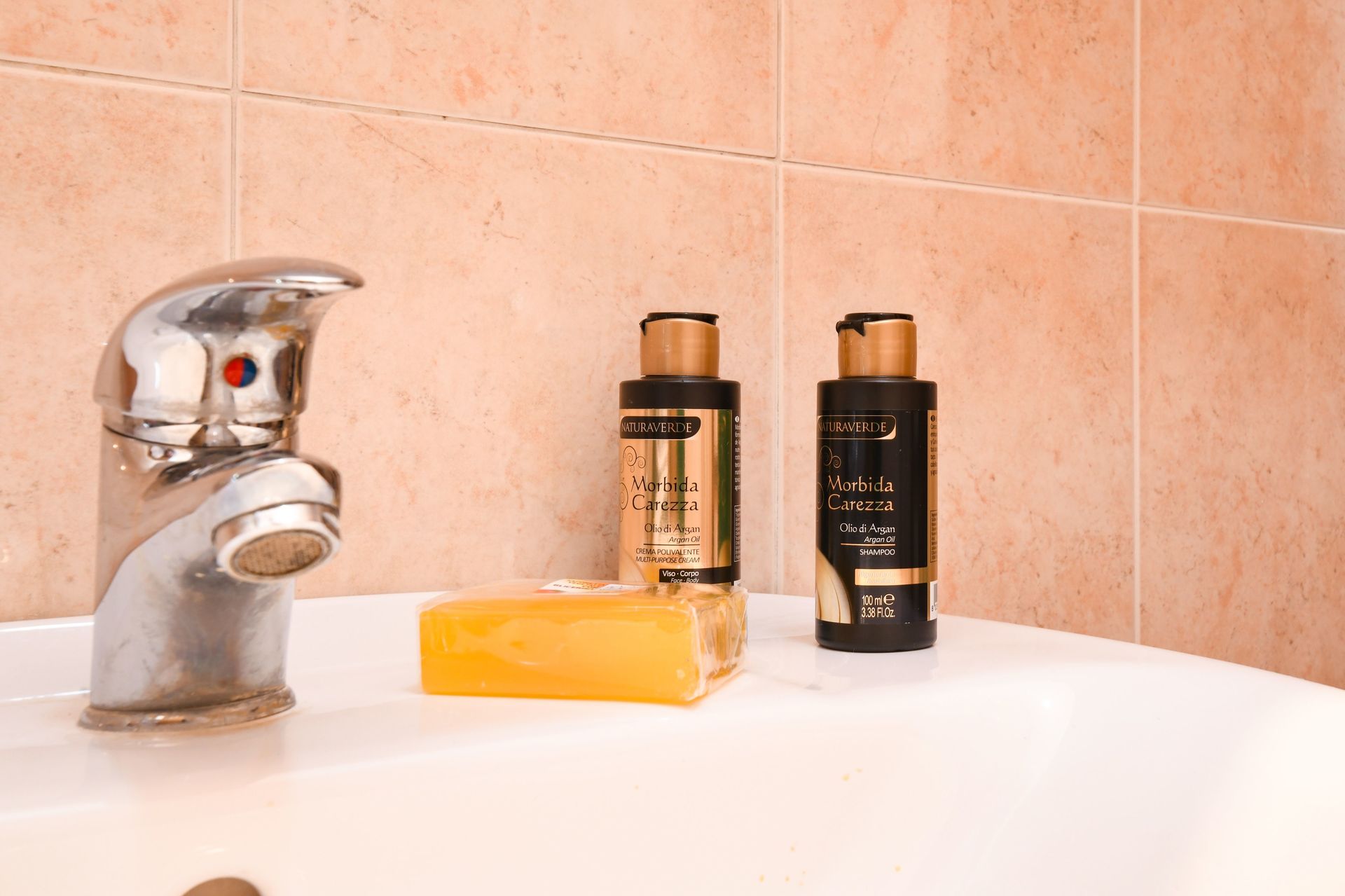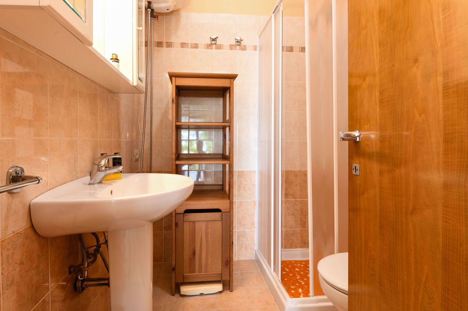 Badeværelse: vask, wc, bruser, hårtørrer.