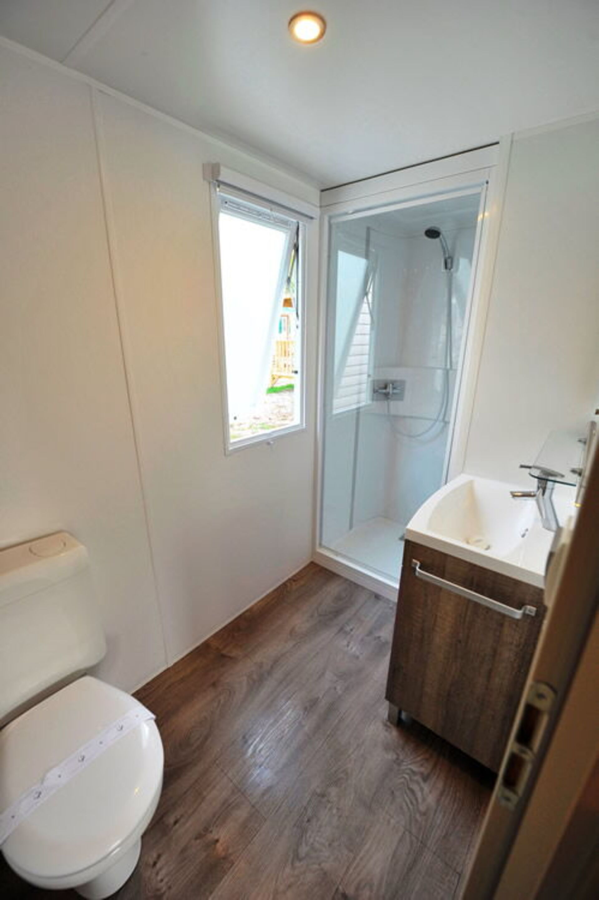 Køkken - stue: spisebord, køleskab, kogeplader, dobbelt sovesofa, WIFI internet, klimaanlæg, tv, udgang til have.