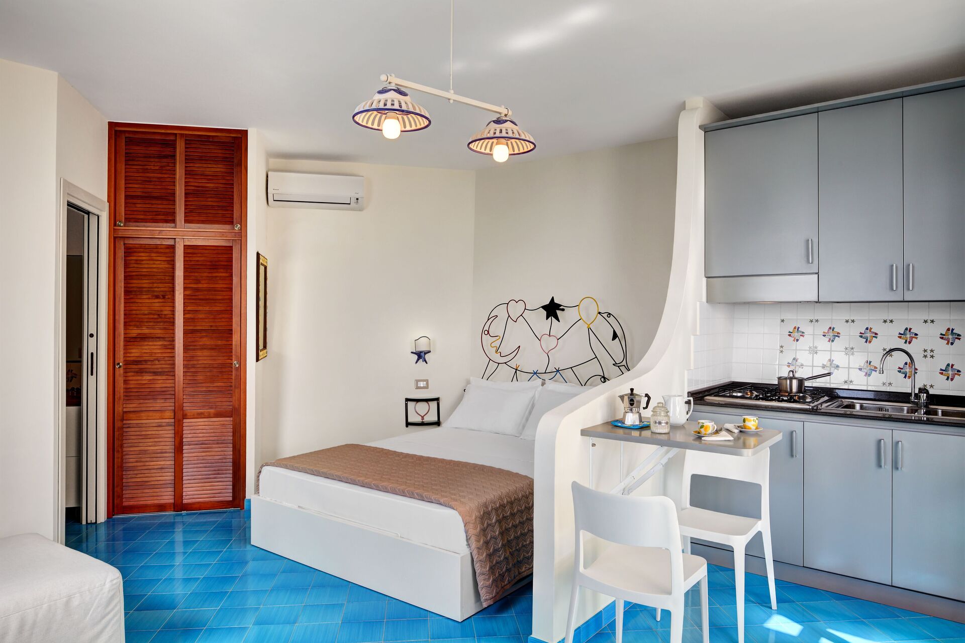 Ved ankomst vil I blive modtaget af ejeren eller repræsentanten og I vil finde en skøn ren og velholdt ejendom med udsigt over havet ideel til en fredelig ferie i Campanien. Den store gevinst ved at leje en feriebolig i stedet for flere hotelværelser er muligheden for at slappe af med familie og venner efter en travl dag. Nyd en middag sammen akkompagneret med lidt lokal vin for at afslutte dagen. At spise med venner og familie er en stor del af den italienske kultur. Benyt køkkenet til madlavning med lokale produkter, når du er på ferie. Køkkenet indeholder brødrister, komfur og køleskab, samt, masser af service og bestik til op til to personer.