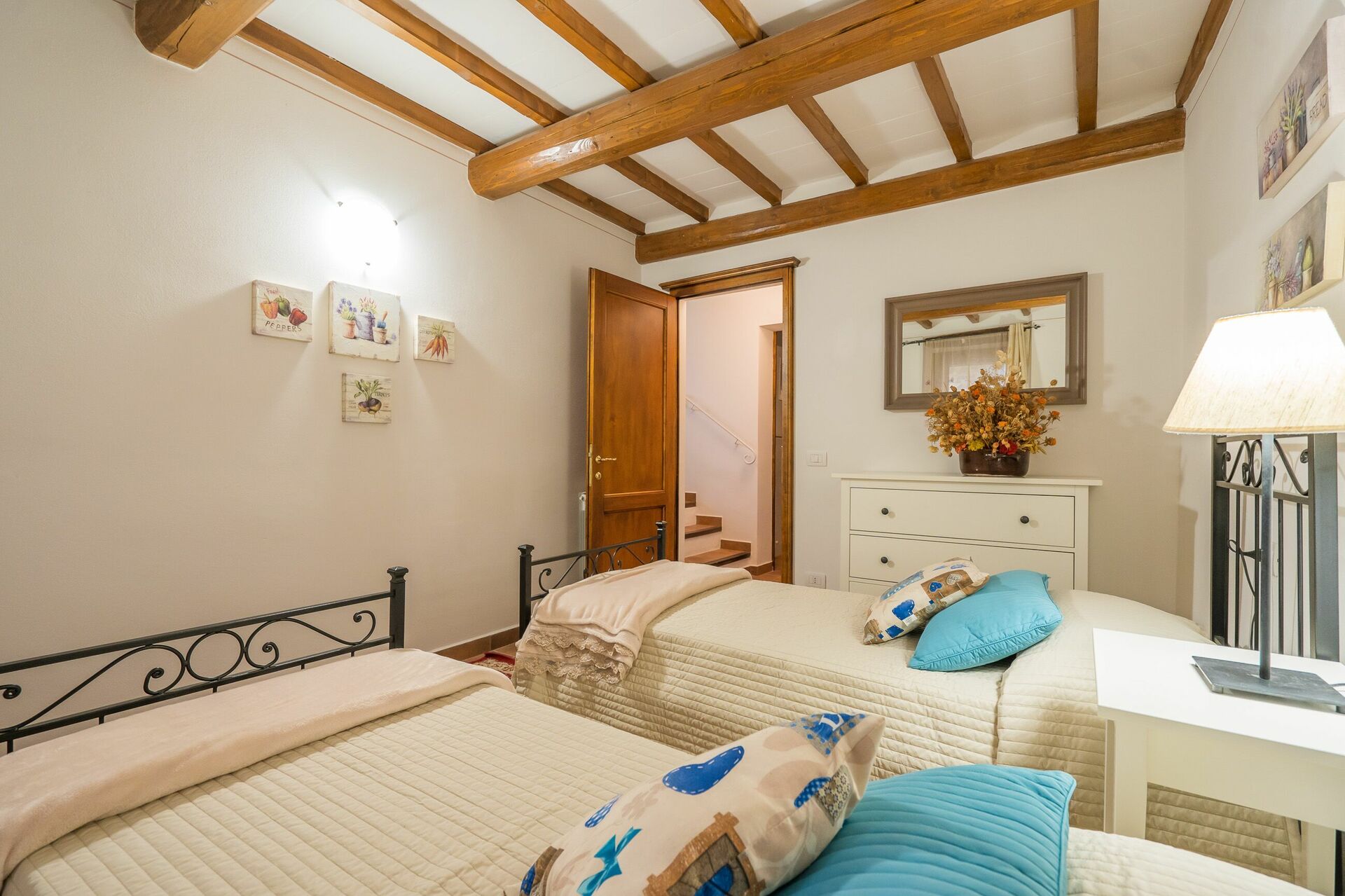 Soveværelse med bad 1: to enkeltsenge, WIFI internet, klimaanlæg, vask, wc, bidet, bruser, hårtørrer, udgang til gårdhave.