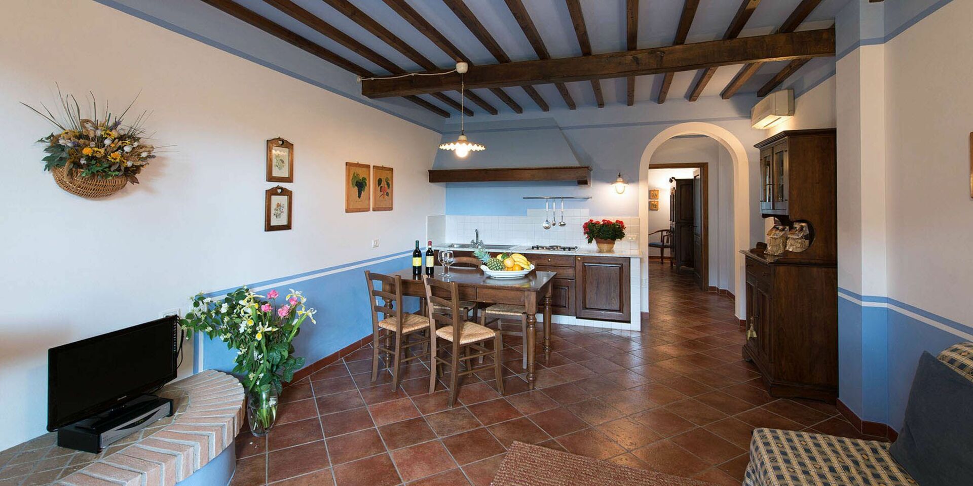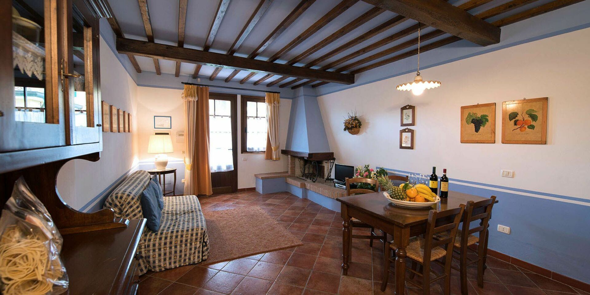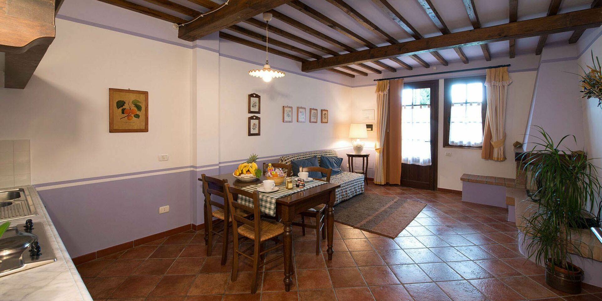 50 m2 Stueetage: indgang til stue (TV Sat) med køkkenhjørne (lille ovn, fryser) og dobbelt sovesofa, badeværelse med bruser, soveværelse med dobbeltseng og balkon.