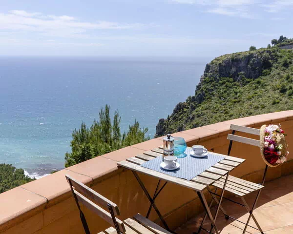 "Le Sperlonghe", 3-room house 85 m2 on 2 levels. Comfortable and cosy furnishings: 1 double bedroom with TV (flat screen). Exit to the terrace. 1 room with 1 x 2 bunk beds, TV (flat screen). On the lower ground floor: (spiral staircase) living/dining room with kitchen corner and TV (flat screen). Exit to the terrace. Kitchenette (oven, dishwasher, 4 induction hot plates, microwave, freezer). Shower/bidet/WC. Air-conditioning. Terrace furniture. Marvellous panoramic view of the ocean. Facilities: washing machine, mosquito net, hair dryer. Internet (WiFi).