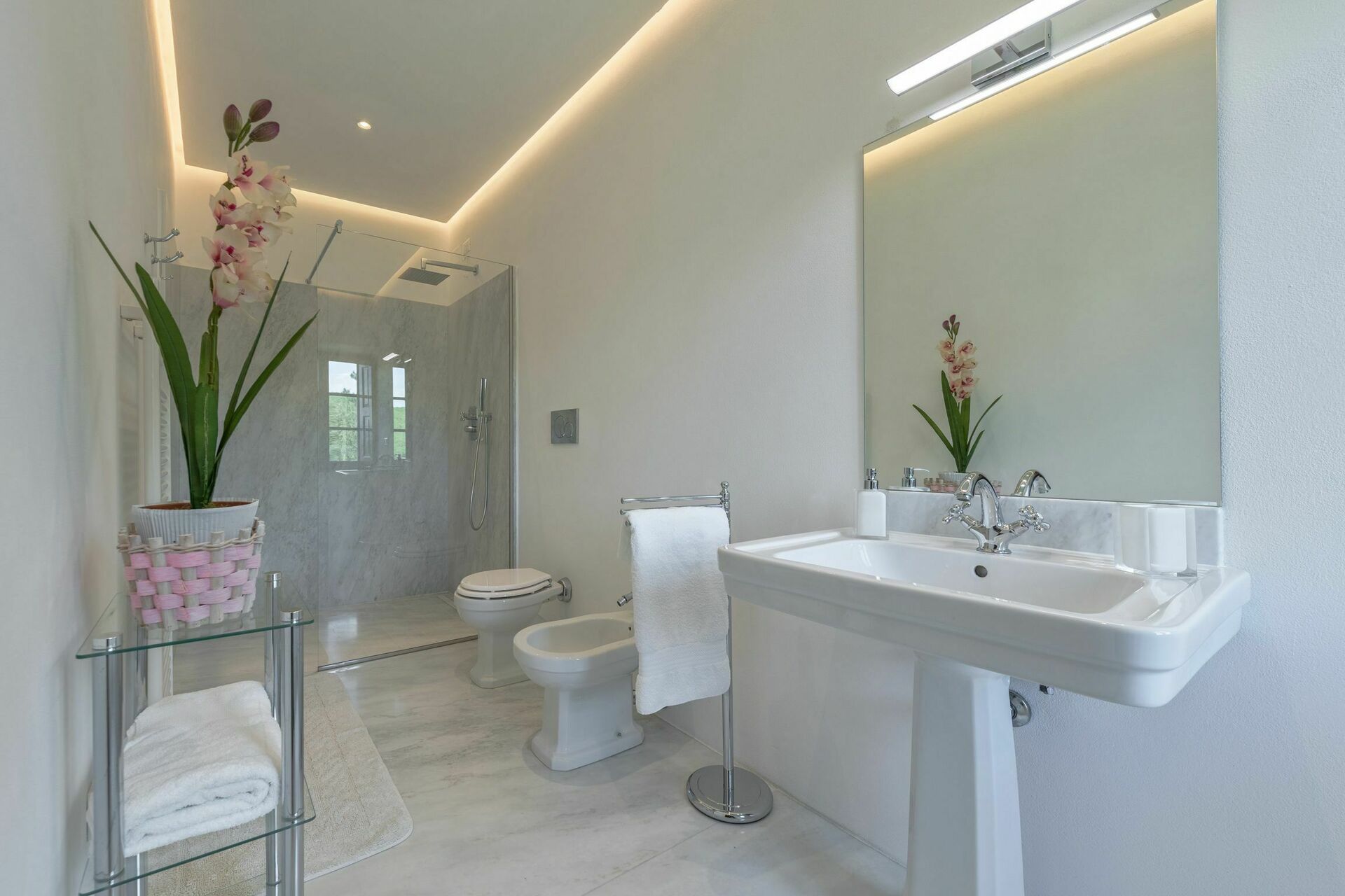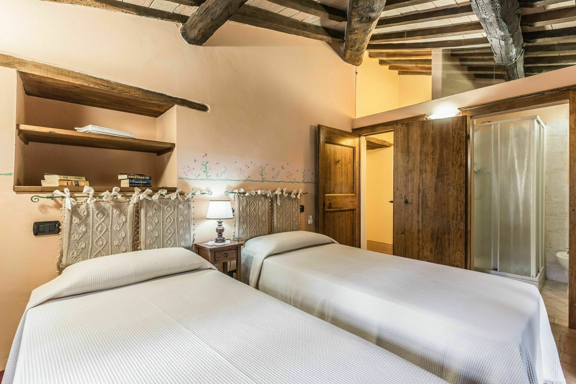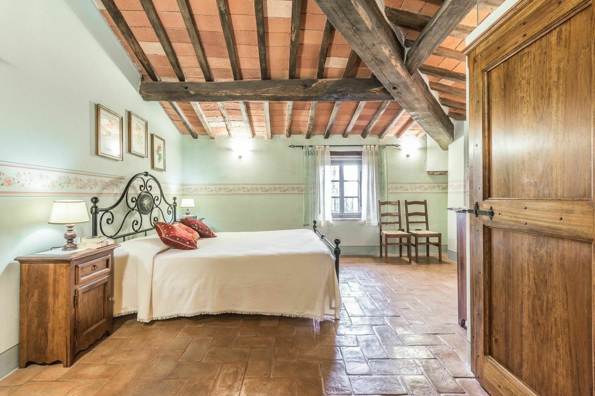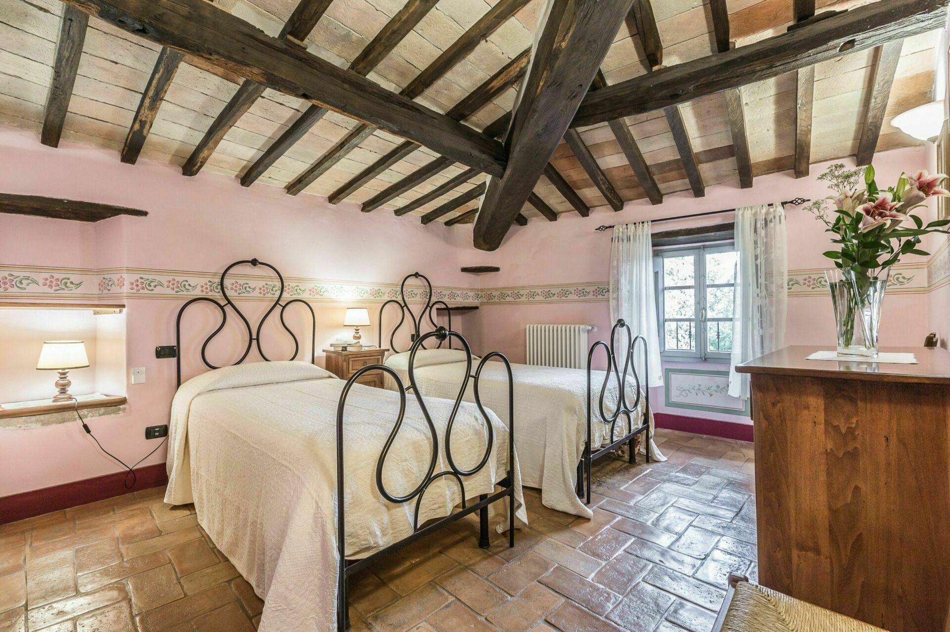 Begge villaer er typisk toscanske med stenbeklædning og terracotta-tag, Palazzo Rosadi er den største ejendom med seks soveværelser og syv badeværelser. Palazzo Rosadi har også et mere storslået og formelt udseende og stort interiør med højt til loftet og rummelige værelser. Indretningen er elegant med smarte soveværelser, et stort åbent opholds- og spiseområde, smukke små stuer, et charmerende landkøkken, store badeværelser og masser af skønne detaljer såsom antikke møbler, malede dekorative mønstre og design på vægge og lofter med mere. Torre del Cielo, har derimod fem soveværelser og badeværelser og ligner mere et romantisk bondehus beliggende i en smuk levende og blomstrende have. Lad dig dog ikke snyde. Det er stadig en forholdsvis stor villa med rummeligt interiør med synlige bjælkelofter samt stenvægge, smukke soveværelser, der virkelig ligner noget fra en historiebog, et dejligt stort køkken og et åbent spise- og opholdsrum med en massiv pejs. Begge huse har også aircondition i alle soveværelser og WIFI på hele ejendommen. Hvis du overvejer at blive gift i Italien og du leder efter et sted at holde bryllup i Toscana, der kan huse både bryllupsreception og dine gæster, så danner disse romantiske bryllupsvillaer de perfekte rammer.