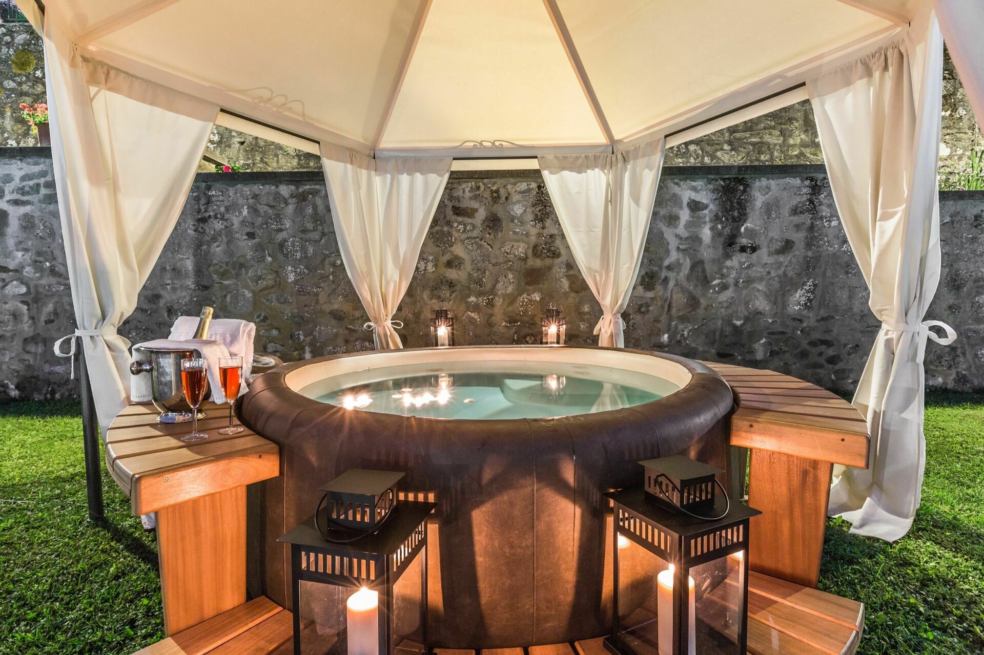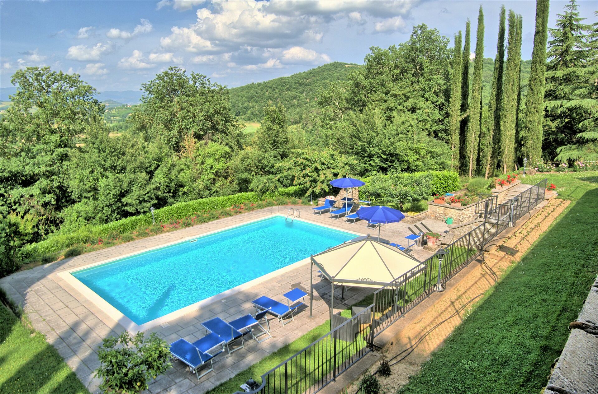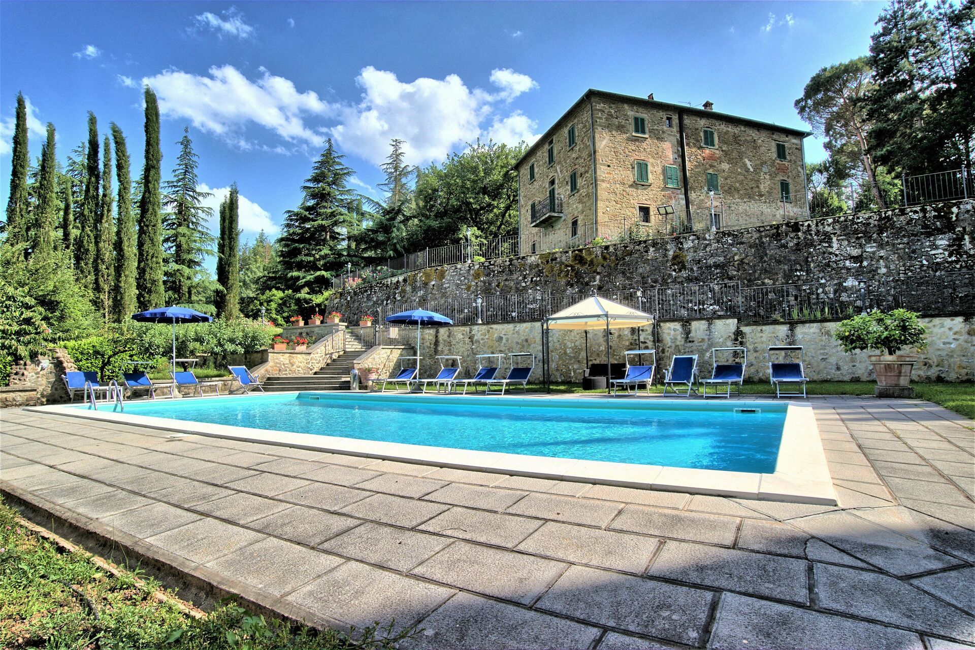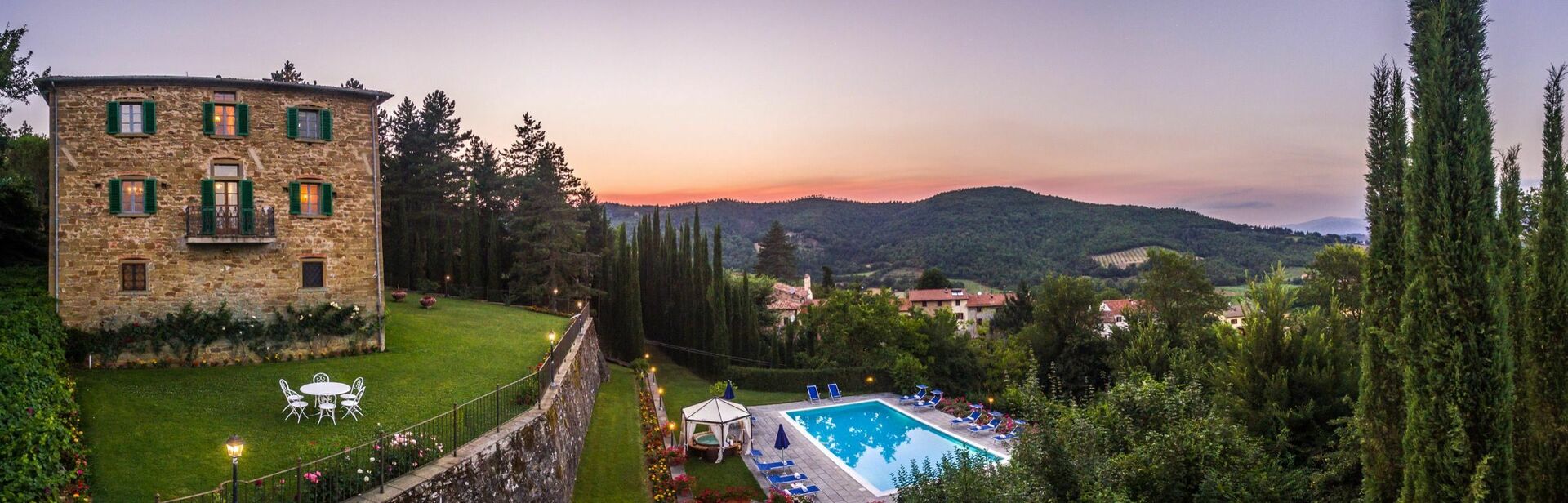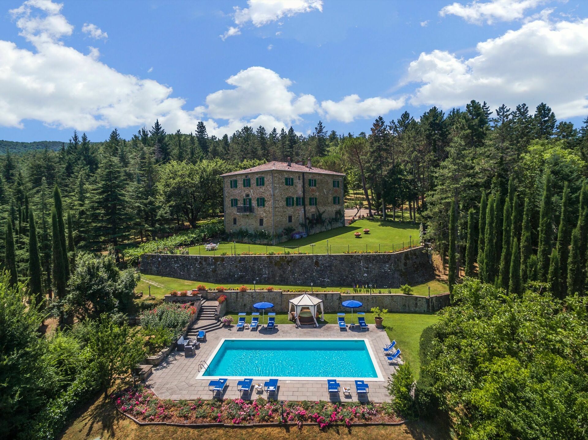 De to ejendomme er fulde af karakter og de bliver kun endnu mere tiltalende med det udendørs rum denne ejendom kan tilbyde, med skoven; de tre hektar velplejede haver på tværs af tre terrasser; de endeløse udendørs spisepladser og bænke med en smuk udsigt over det toscanske landskab til udendørs måltider eller afslapning med en kop kaffe og en god bog; og to swimmingpools (hvoraf den ene er 12 x 6 m; dybde: 1,5 m) med liggestole, en opvarmet jacuzzi (til rådighed på forespørgsel) og en gammel stenlade, der er lavet om til et stort bruse- og omklædningsrum med badefaciliteter. Dette vidunderlige udendørsareal i denne ejendom er ideelt til et udendørs bryllup og giver mulighed for, at der kan arrangeres dejlige bryllupsmåltider ved borde på terrasserne med en flot udsigt over de bølgende bakker i det toscanske landskab. Bryllupsceremonien kan foregå i den smukke italienske have med blomster omkring og dine gæster har masser at lave rundt omkring, som giver alle mulighed for at skabe utrolige minder på denne særlige dag. Til din bryllupsfotografering er der også endeløse fantastiske baggrunde for at indfange dit magiske og romantiske bryllup perfekt i disse eventyrlige kulisser.