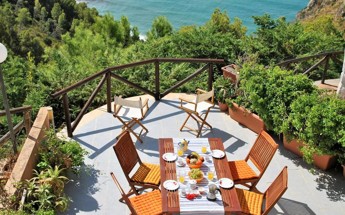 3-værelse-hus 80 m2 på 2 etager. Komfortabelt og hyggeligt indrettet: stue/soveværelse med panoramavindue med 1 dobbelt sovesofa, spisebord, køkkenblok og TV (fladskærms TV). Udgang til havesideplads. Kogeniche (ovn, opvaskemaskine, 4 gasblus, kedel, mikroovn). Brus/bidet/WC. Overetage: indgang. Stor gennemgangsværelse med 1 sovesofa og brus/bidet/WC. 1 dobbeltværelse med TV og fladskærms TV. Udgang til altan. Brus/bidet/WC. Opvarming, klimaanlæg. Lille altan, stor terrasse. Havemøbler, altanmøbler, grill, liggestole (2). Meget flotte panoramaudsigt over havet. Til benyttelse: vaskemaskine, strygejern. Internet (trådløs LAN [WLAN], gratis). Parkeringsplads (2 Biler). Bemærk venligst: 1 lille husdyr/hund tilladt. Privat indgang. IT059030C2D7QEBAWC