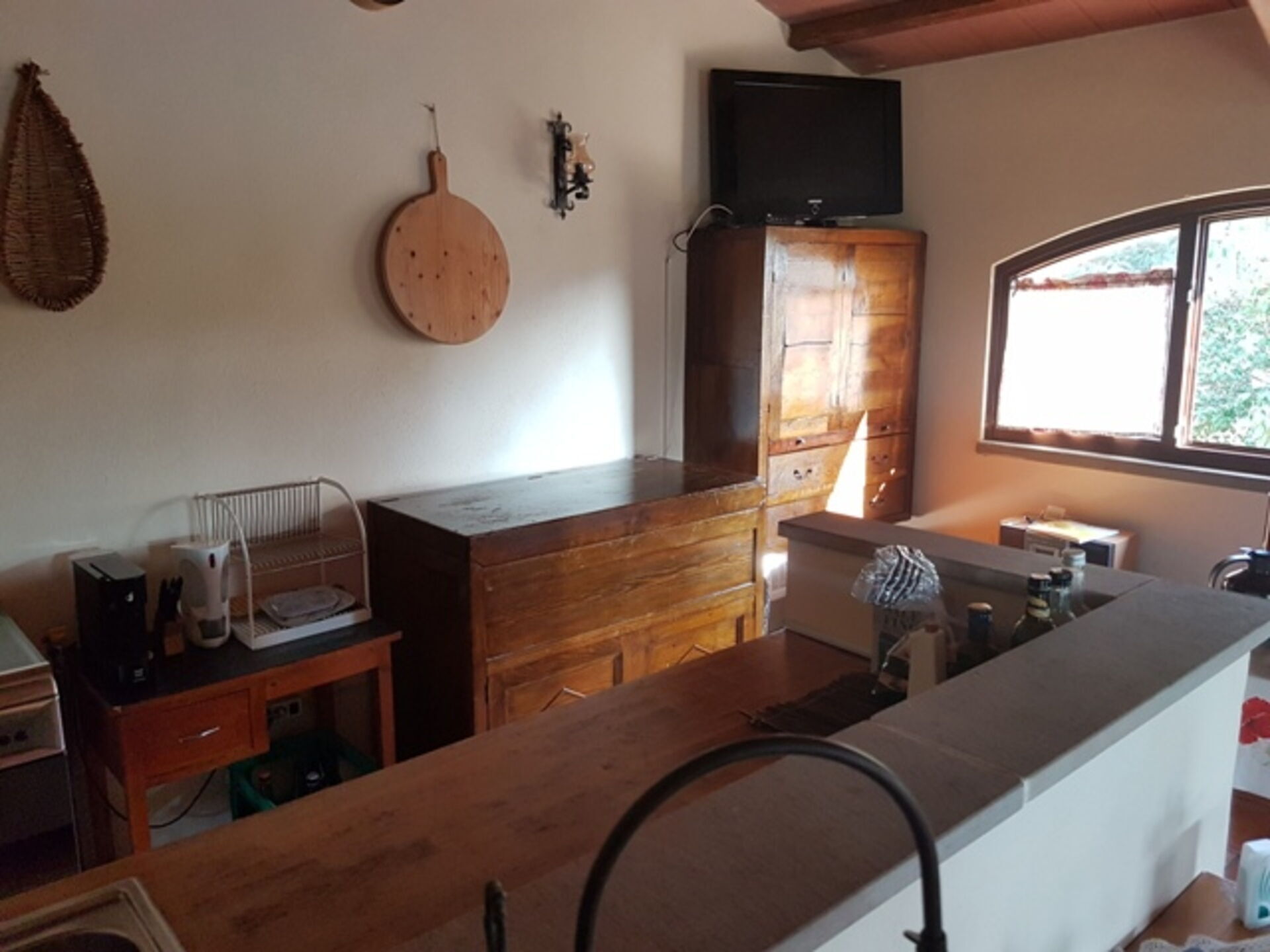 Køkken - stue (30 m2): veludstyret køkken, spisebord, opvaskemaskine, to køleskabe, kogeplader, ovn, tre lænestole, kamin, satellit tv, udgang til have, udgang til veranda.