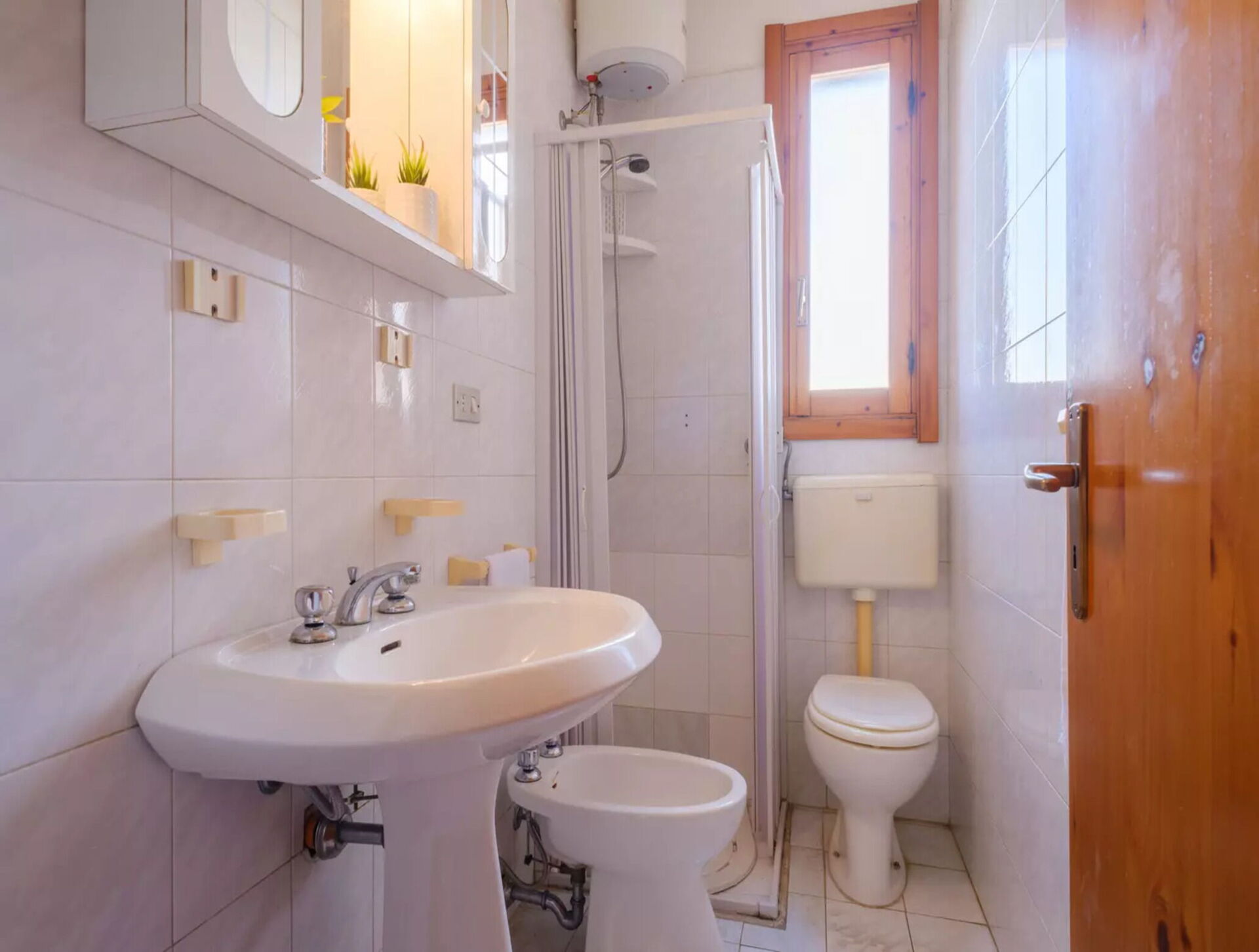 Badeværelse: vask, wc, bidet, bruser, hårtørrer.