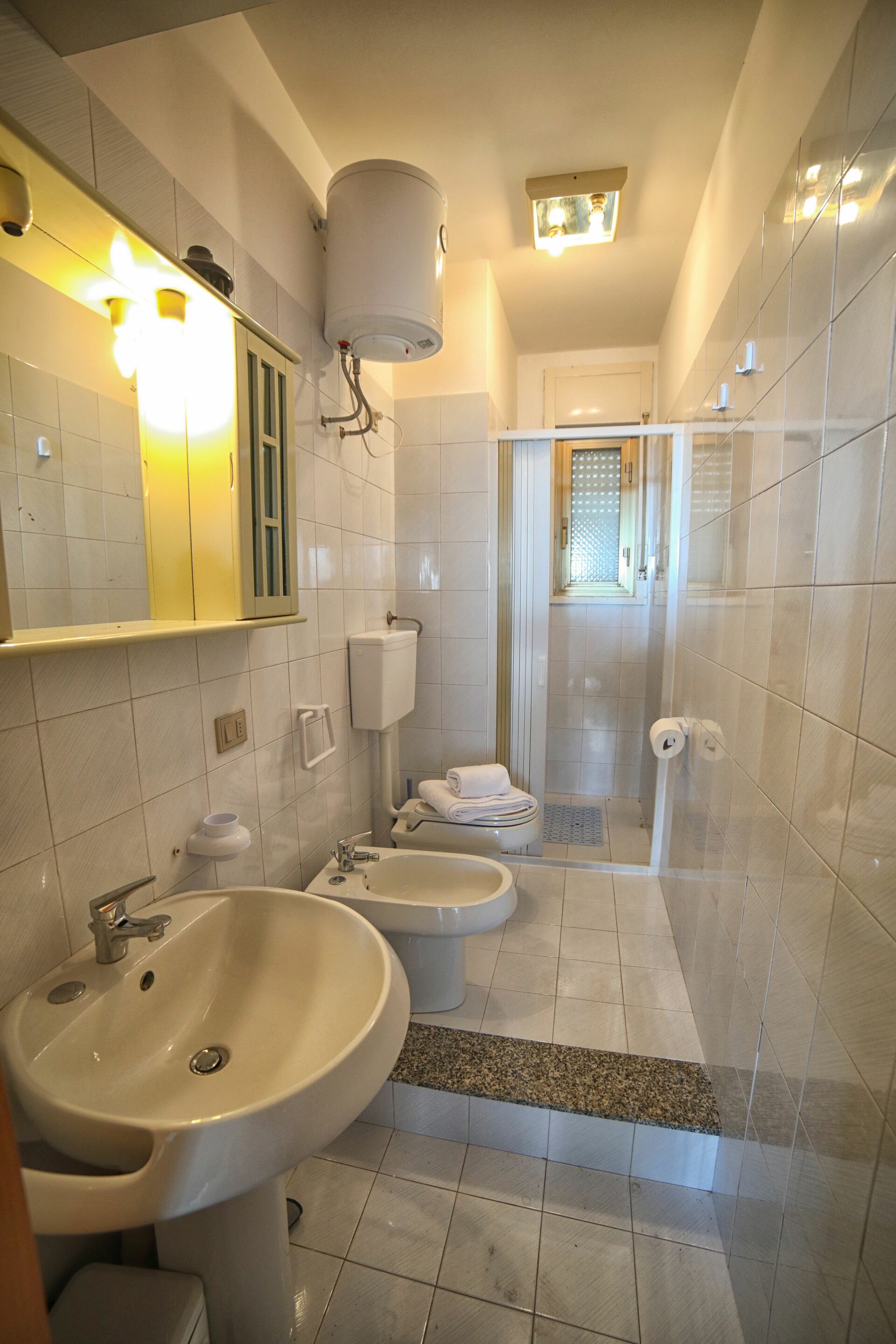Badeværelse: vask, wc, bidet, bruser, hårtørrer.