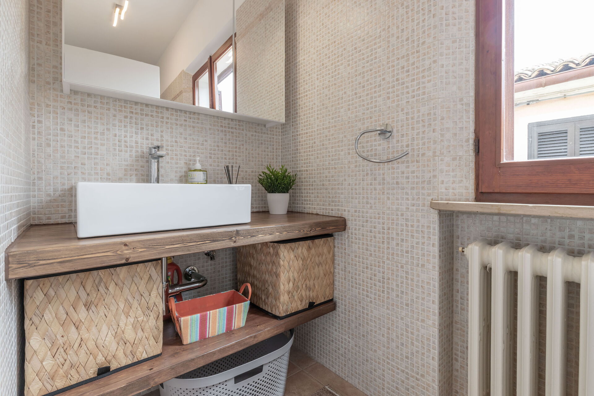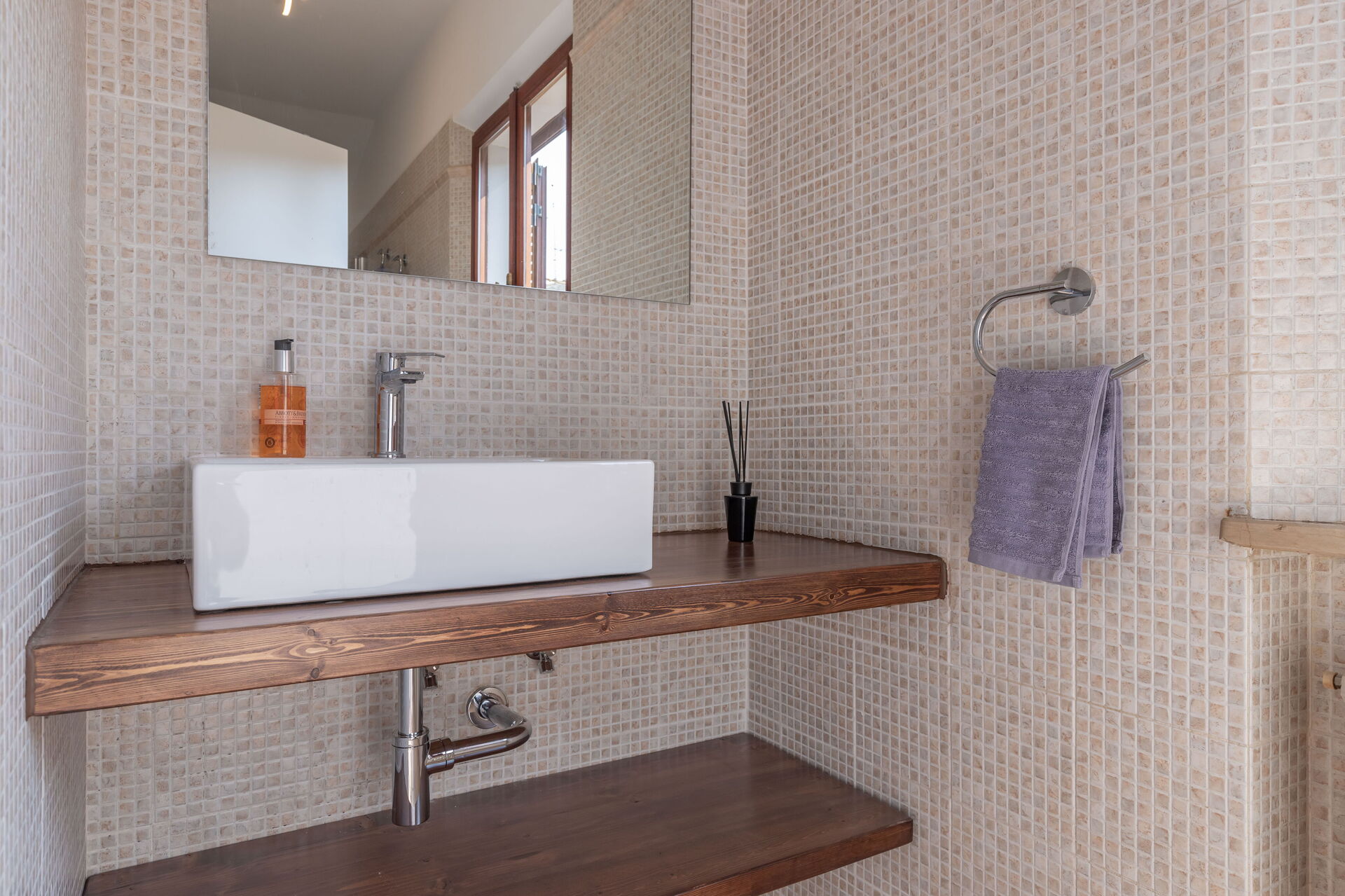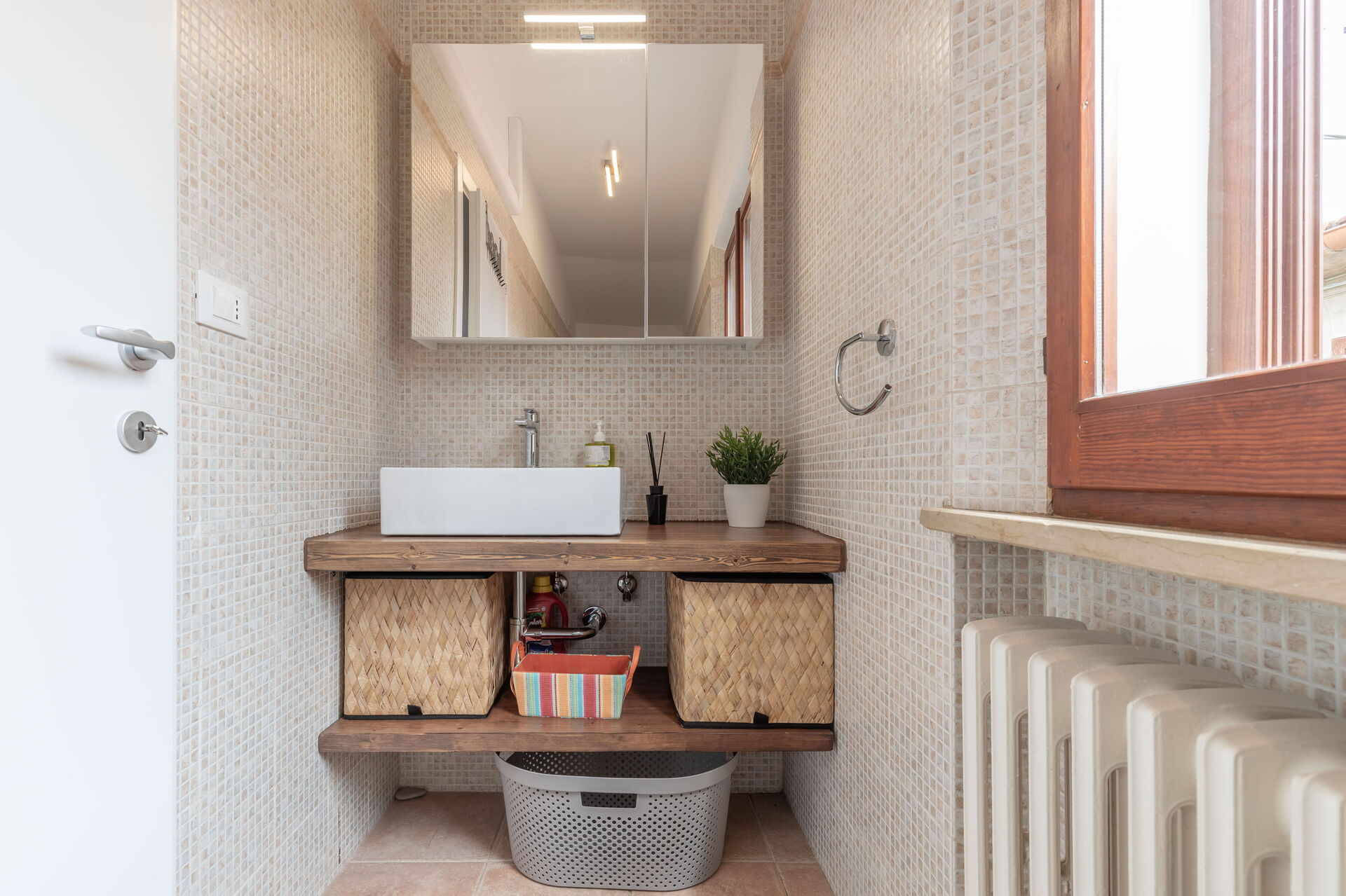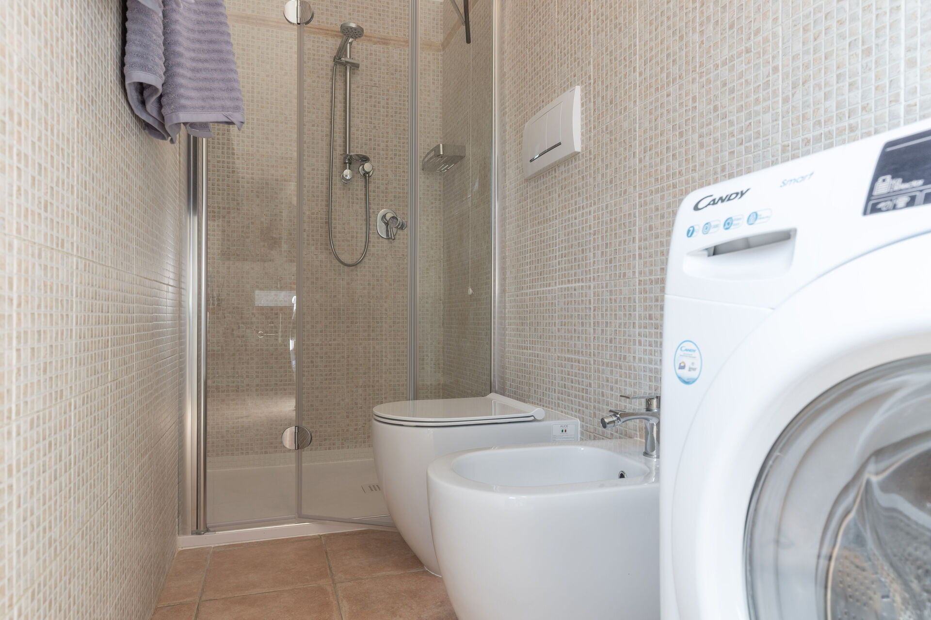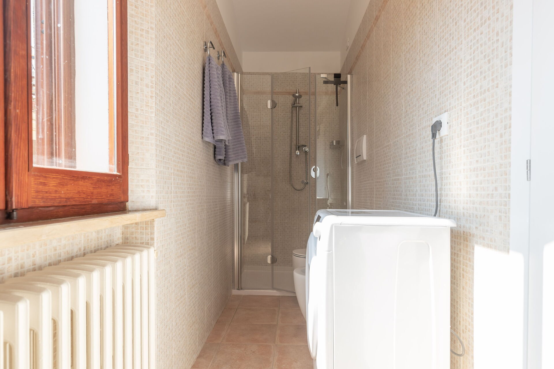 Badeværelse: vask, wc, bidet, bruser, hårtørrer.