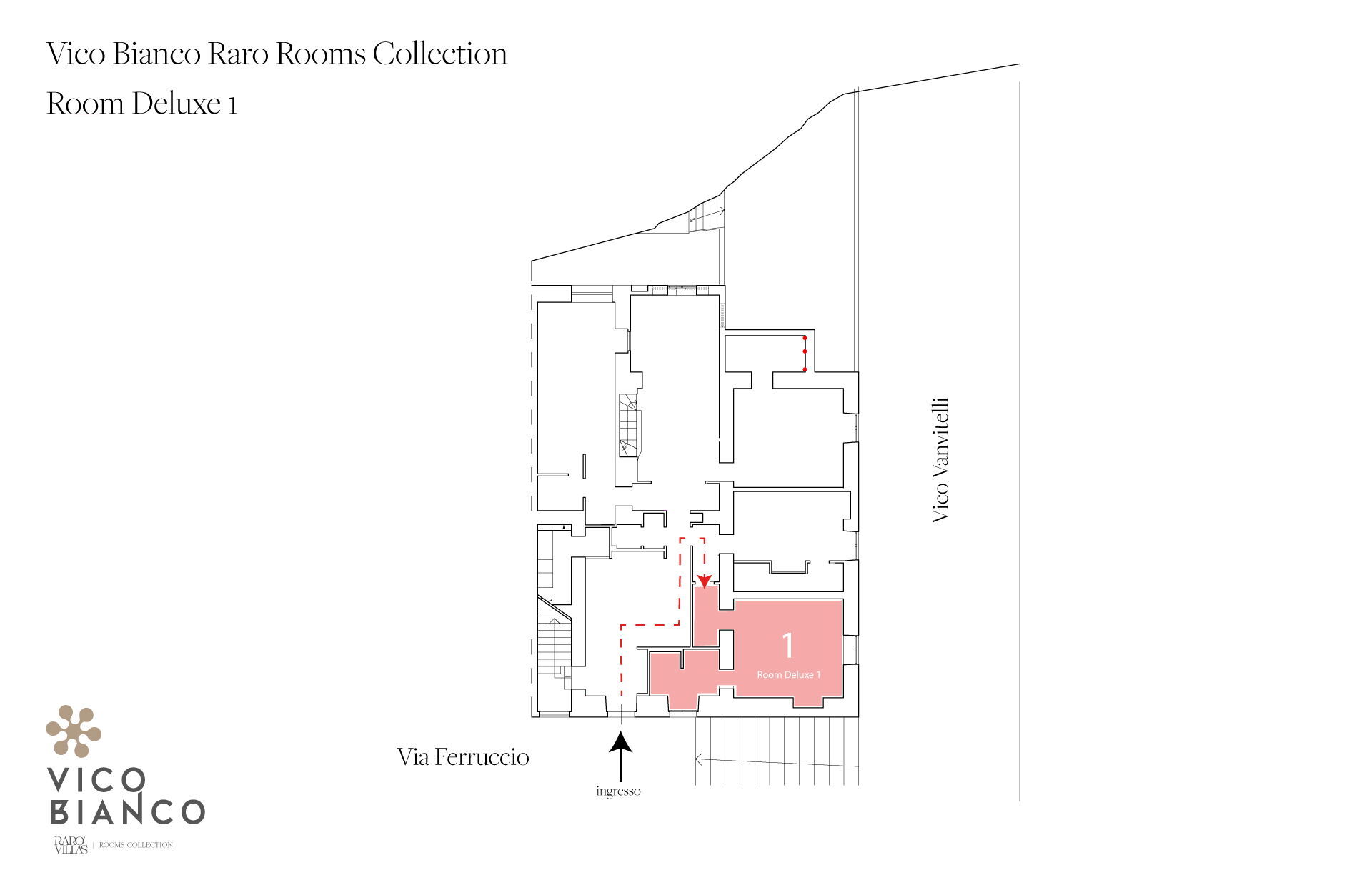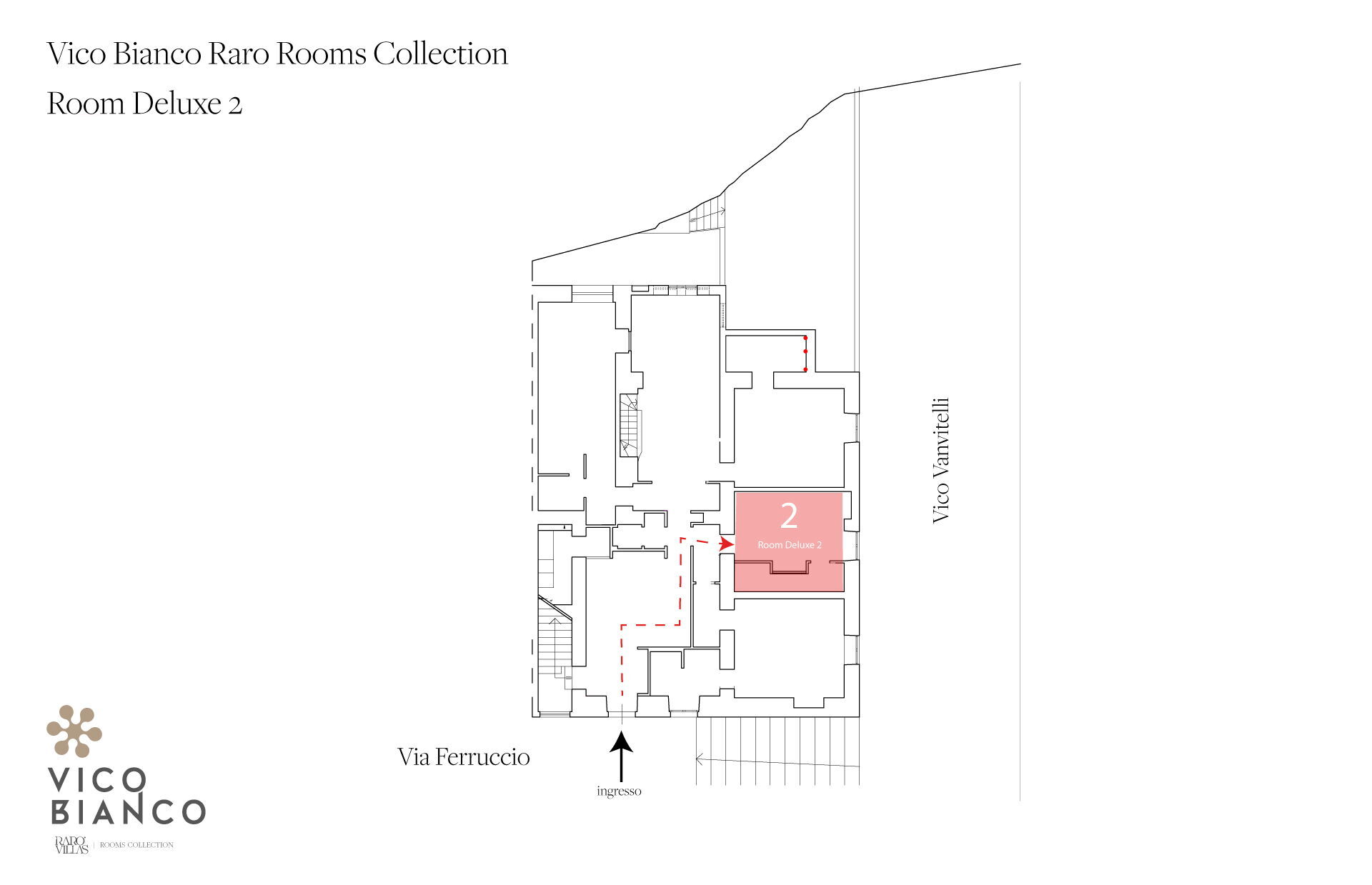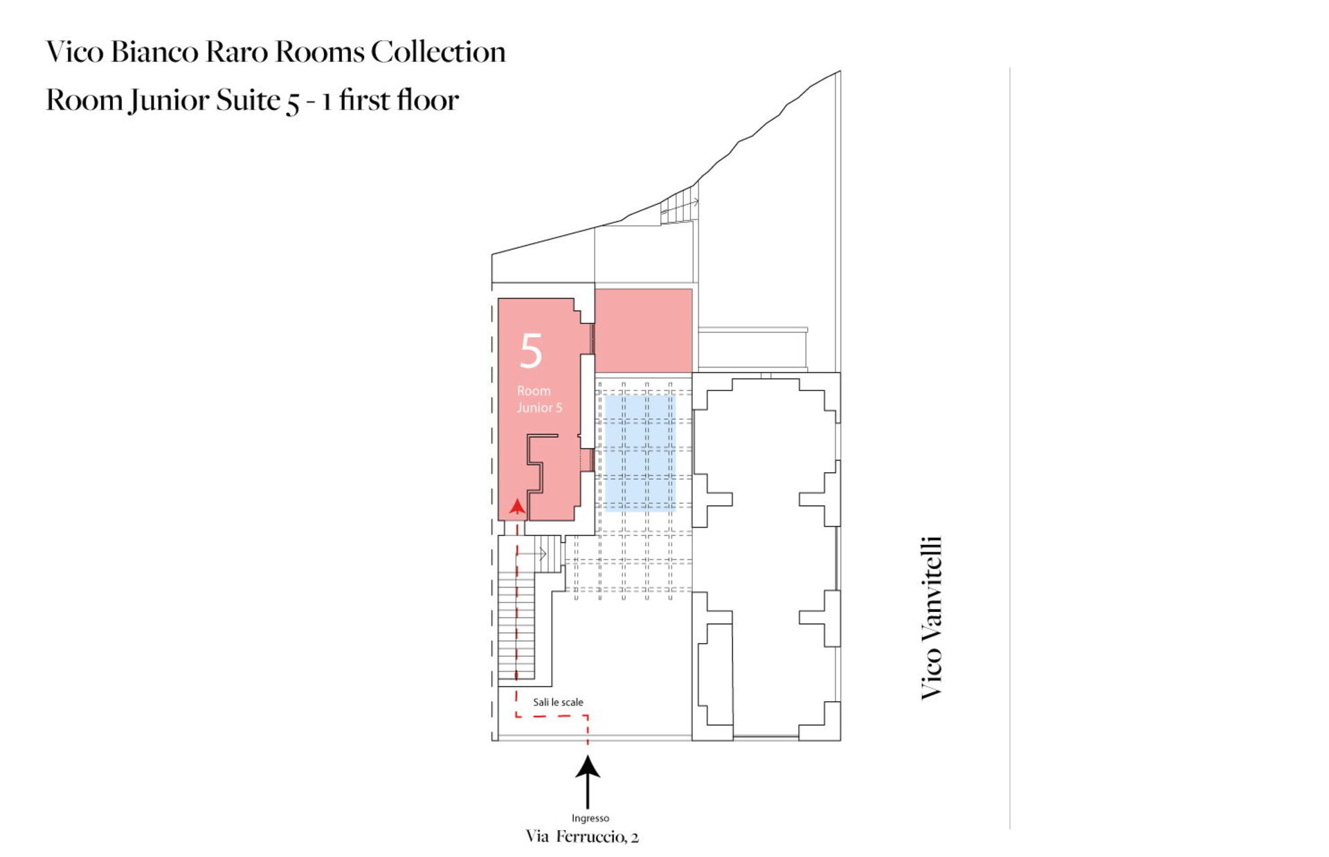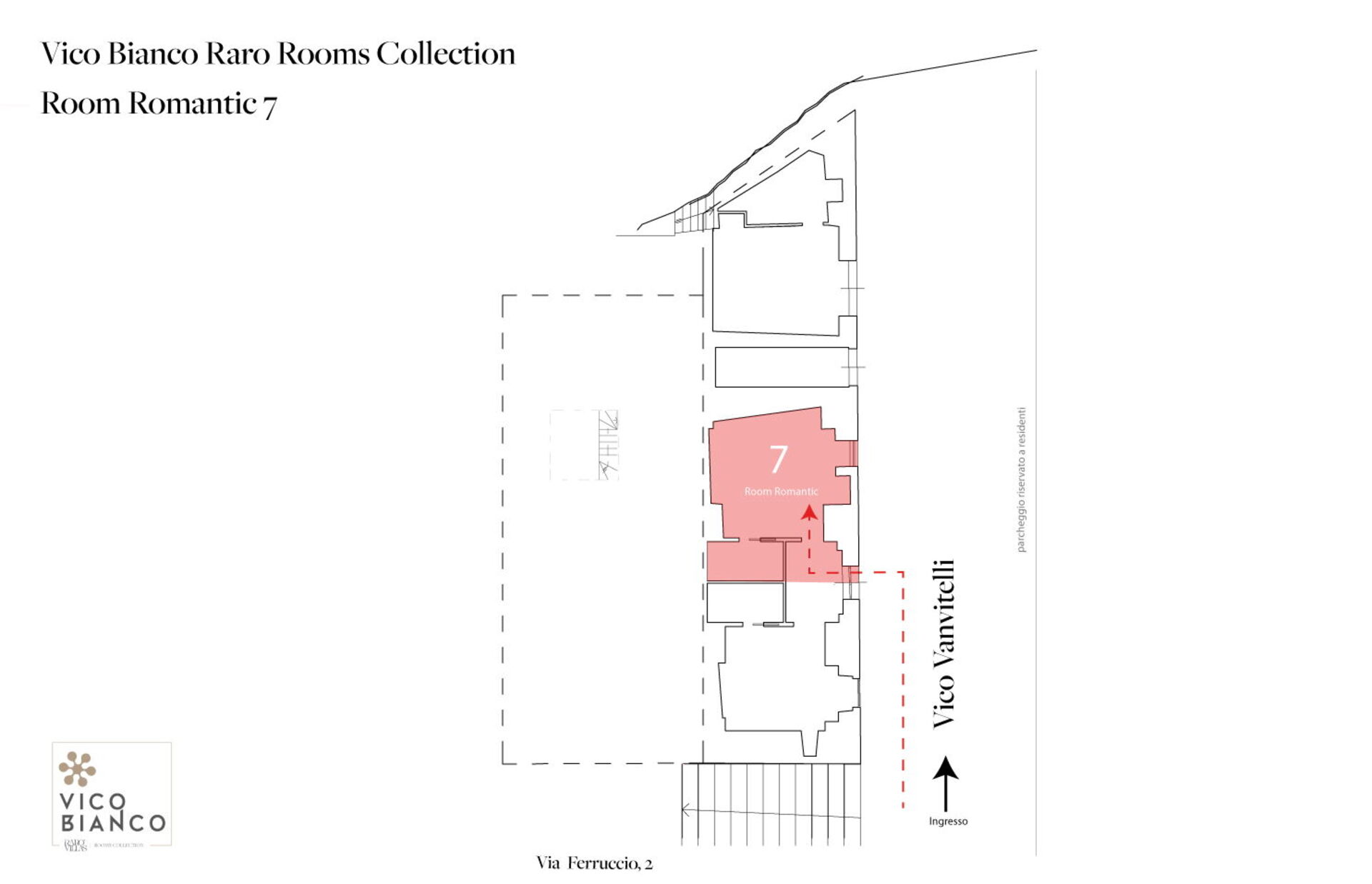 The 7th Bedroom with ensuite bathroom (21.55 m2 + 4.35. m2) is an elegant double bedroom with ensuite bathroom with vaulted stone masonry inside Palazzo Vico Bianco. The room has street access (Via Vanvitelli) and is for two people. It is composed as follows: air conditioning, hairdryer, bathroom without window, bidet, safe, shower, fridge, Nespresso espresso machine (capsules), WIFI internet, king size bed (width: 1.8m, length: 2m), smoke detector, satellite TV, toilet.