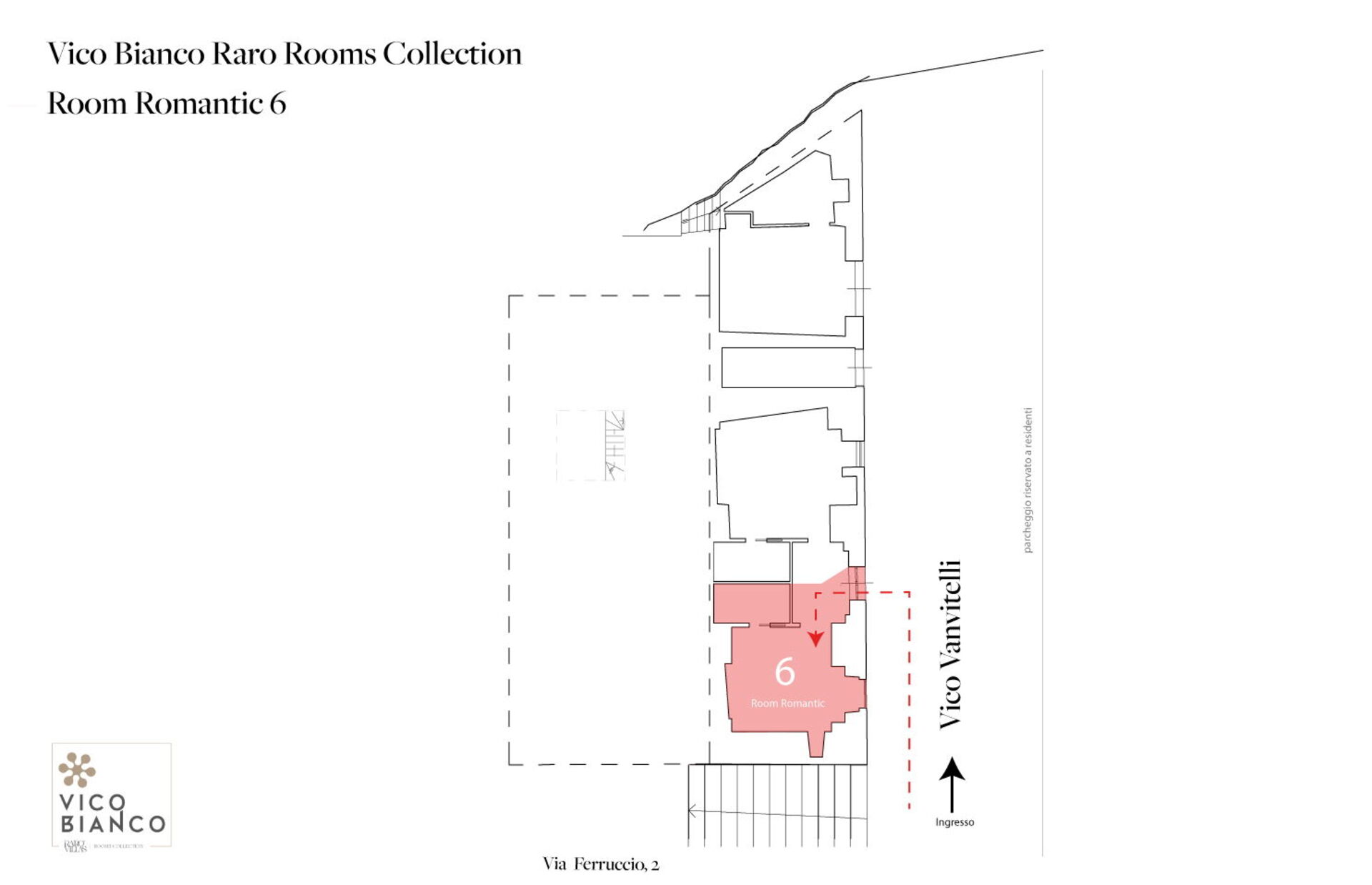The 6th Bedroom with ensuite bathroom (15.12 m2 + 5.51 m2) is an elegant double bedroom with ensuite bathroom with vaulted stone masonry inside Palazzo Vico Bianco. The room has street access (Via Vanvitelli) and is for two people. It is composed as follows: air conditioning, hairdryer, bathroom without window, bidet, safe, shower, fridge, Nespresso espresso machine (capsules), WIFI internet, king size bed (width: 1.8m, length: 2m), smoke detector, satellite TV, toilet.