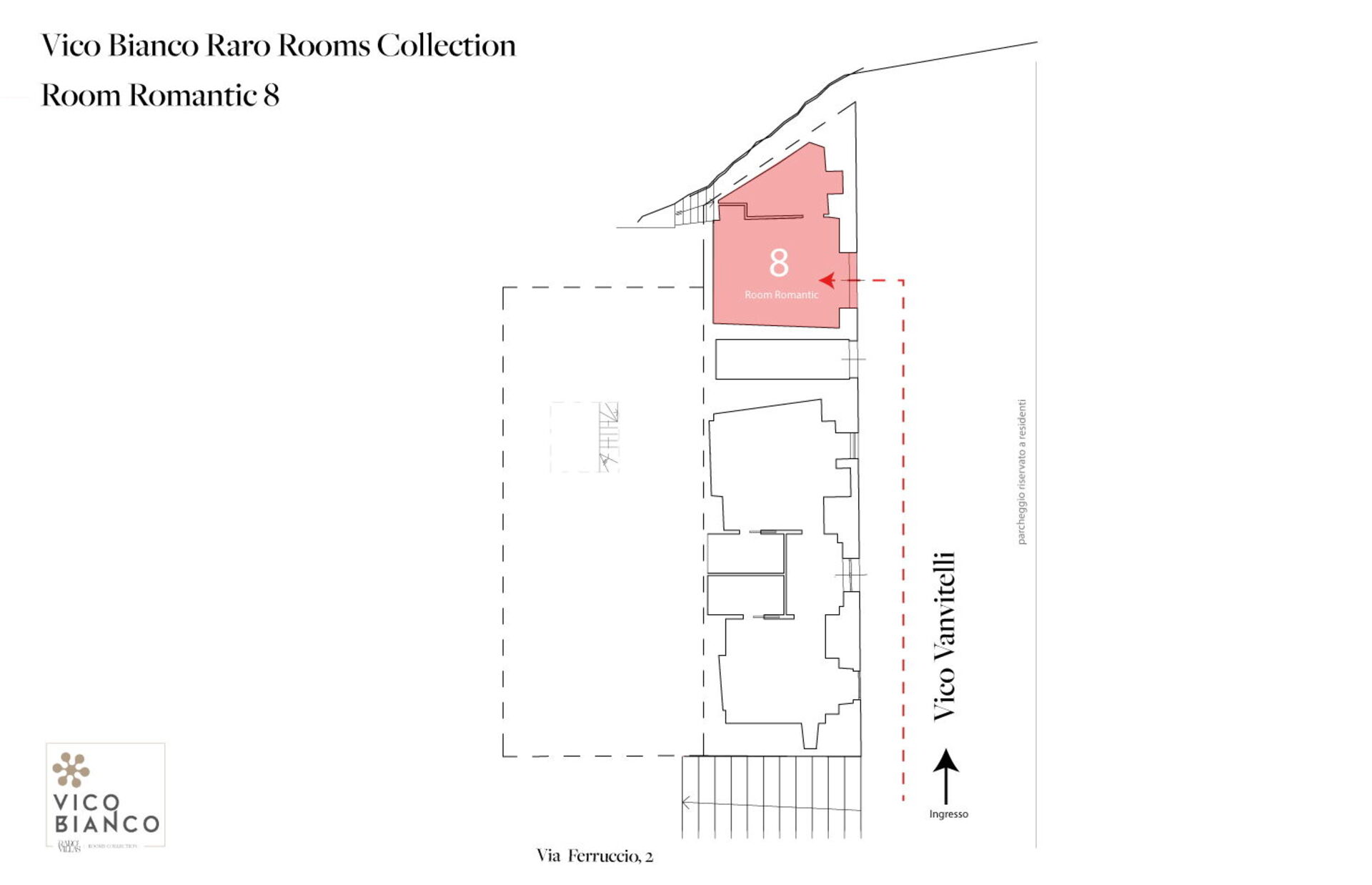 The 8th Bedroom with ensuite bathroom (19.68 m2 + 4.5 m2) is an elegant double bedroom with ensuite bathroom with vaulted stone masonry inside Palazzo Vico Bianco. The room has street access (Via Vanvitelli) and is for two people. It is composed as follows: air conditioning, hairdryer, bathroom without window, bidet, safe, shower, fridge, Nespresso espresso machine (capsules), WIFI internet, king size bed (width: 1.8m, length: 2m), smoke detector, satellite TV, toilet.