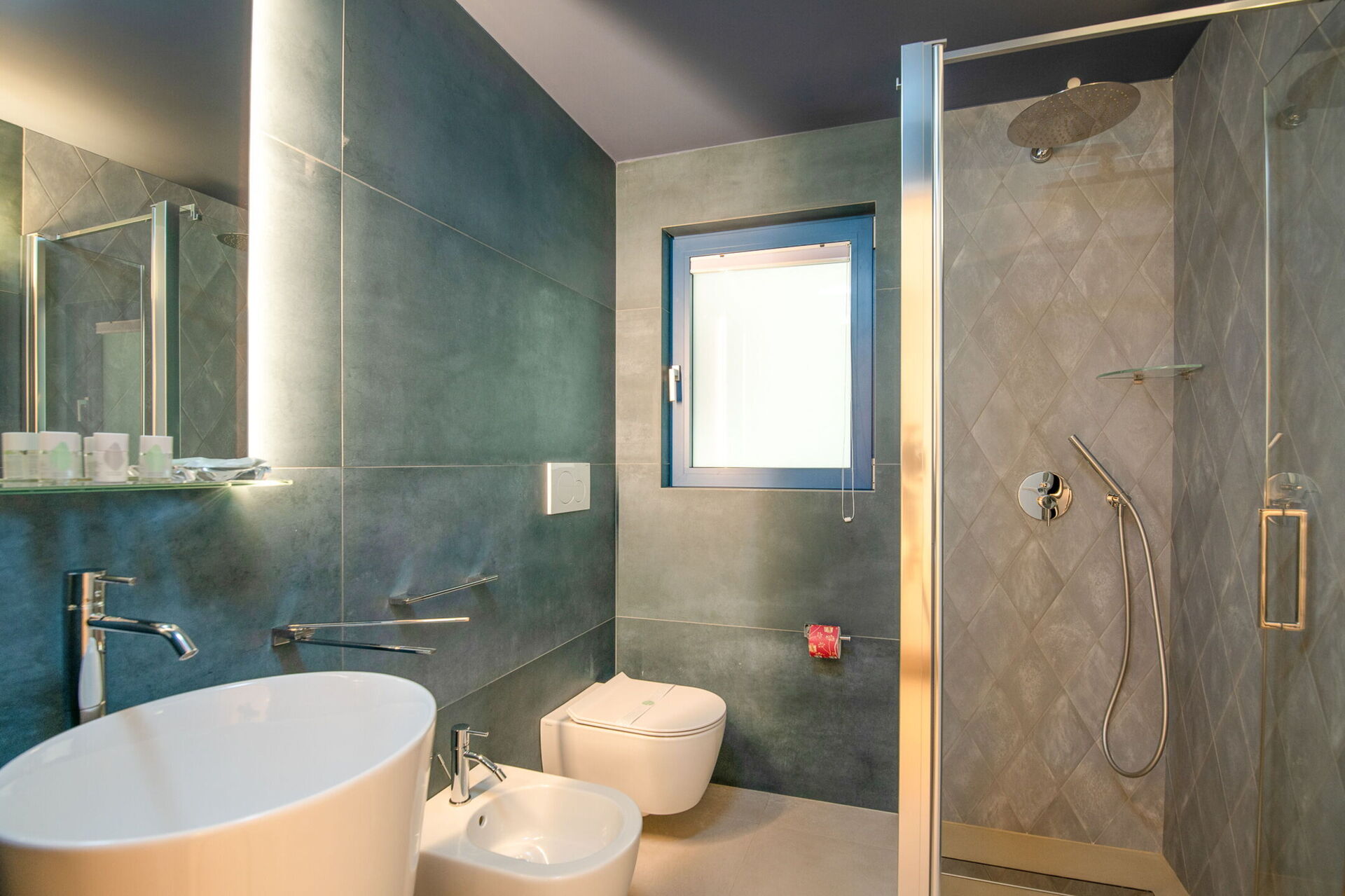 Bathroom: toilet, bidet, sink, shower, hairdryer, window;