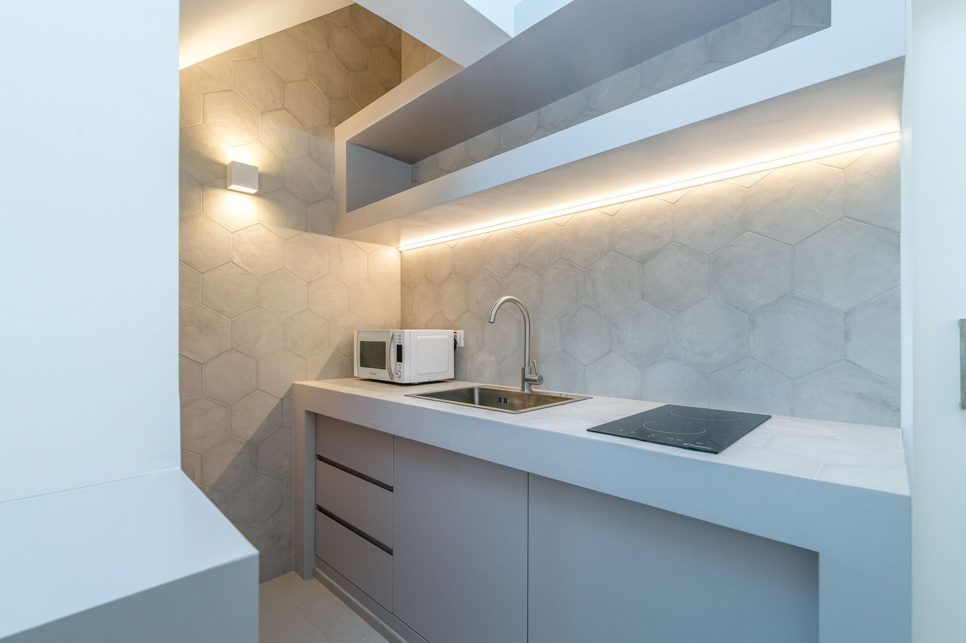 Kitchen and living room (open space): sofa, table and chairs, fridge, induction kitchen, microwave, dishes and pots, air conditioning, coffee machine and capsules;