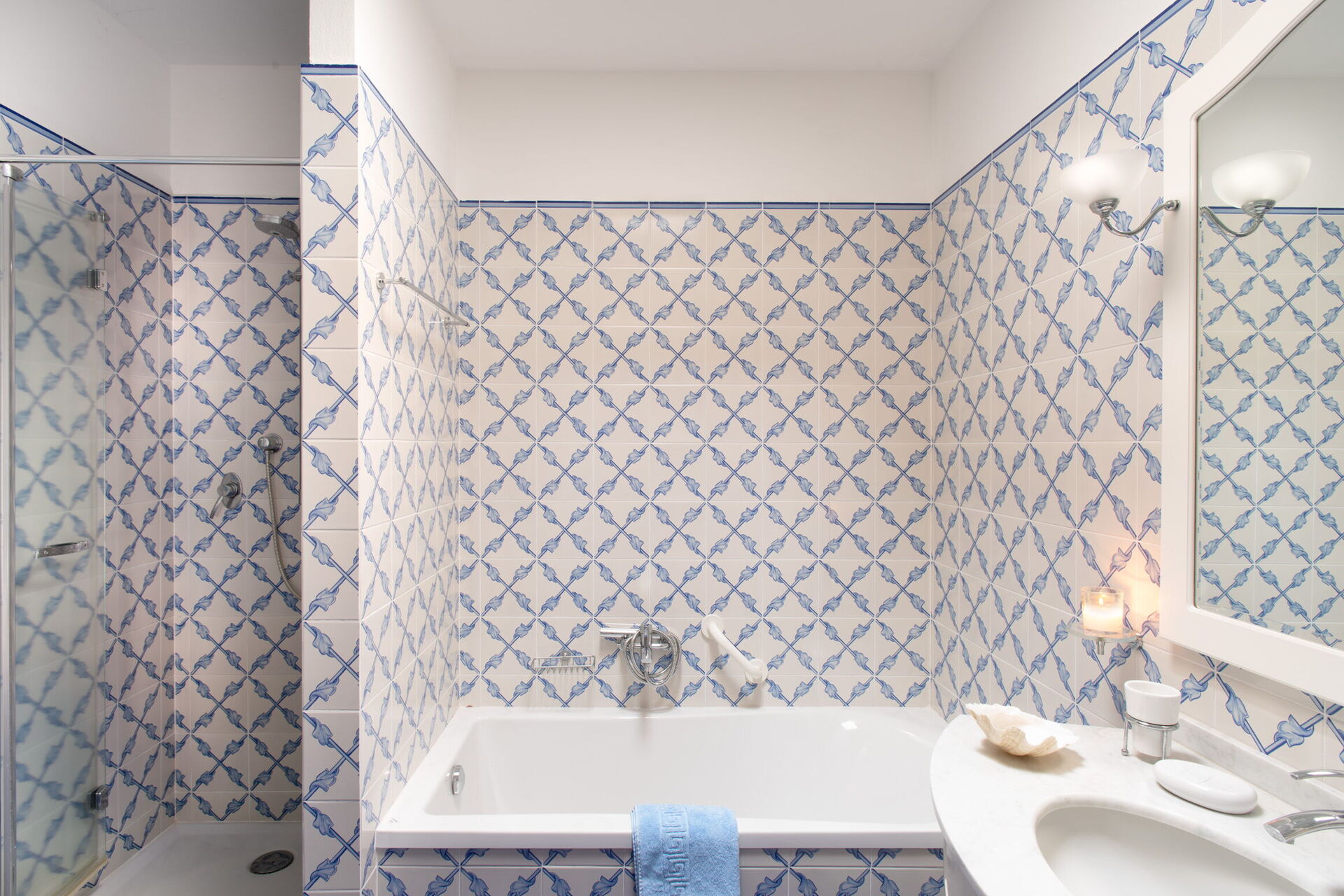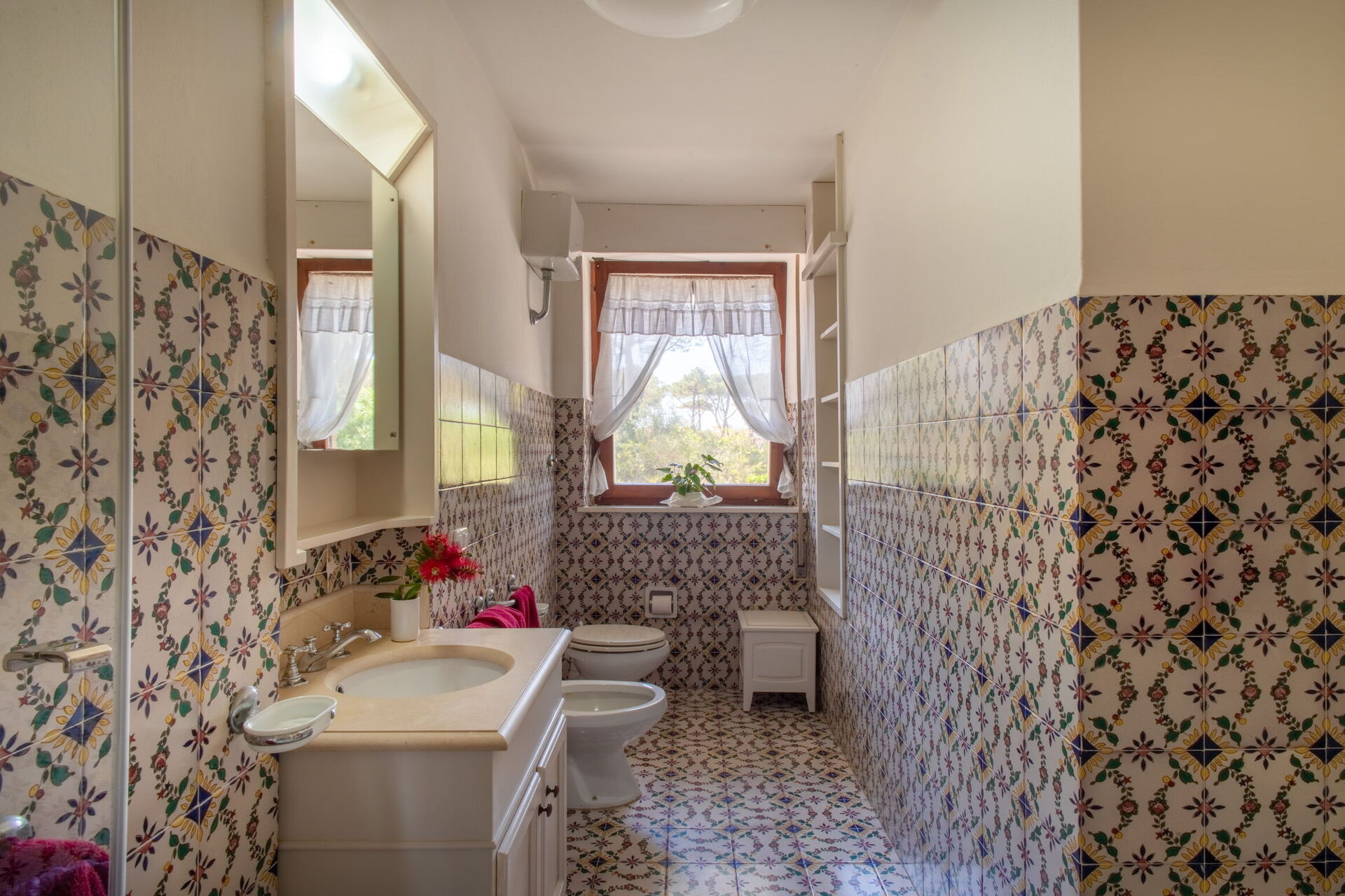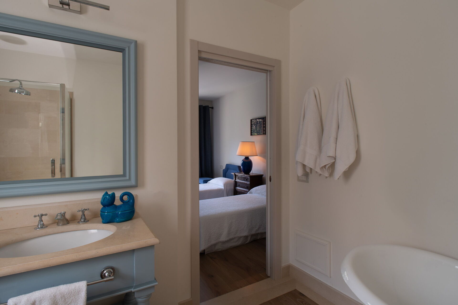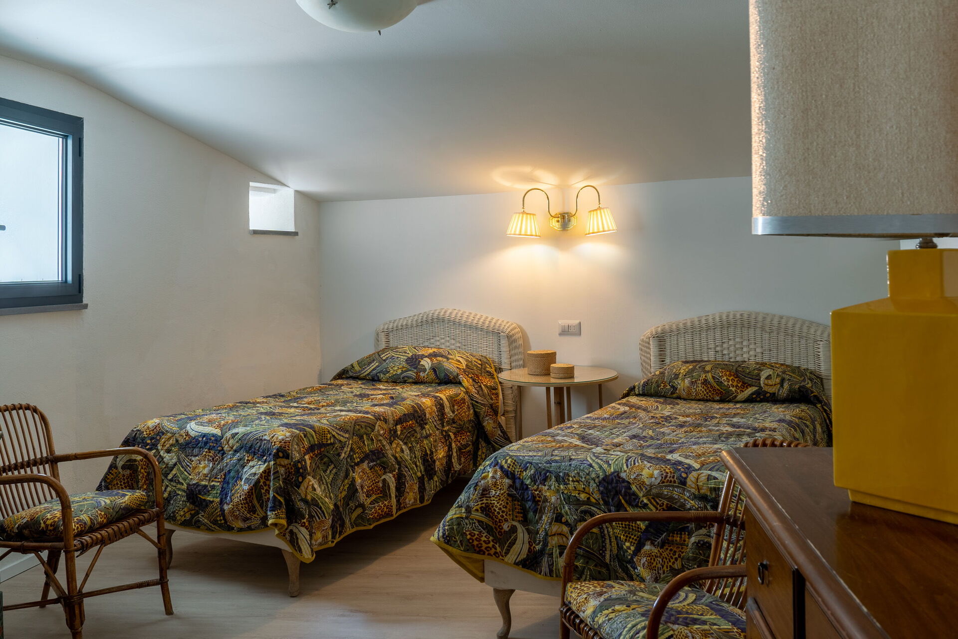 Soveværelse med bad 3: to enkeltsenge, WIFI internet, klimaanlæg, myggenet, lænestol, vask, wc, bidet, badekar, hårtørrer, udgang til have.